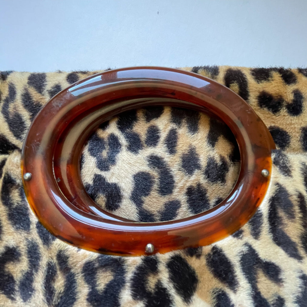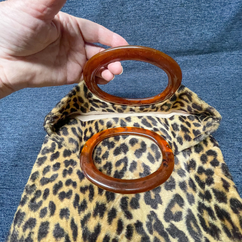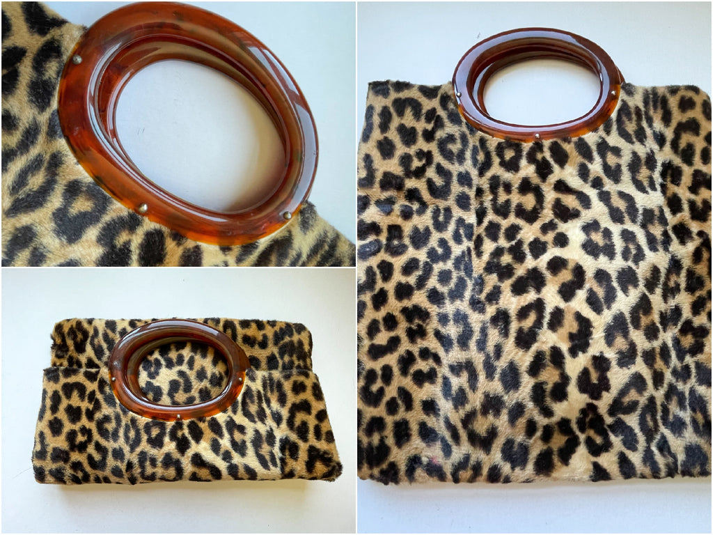 Vintage 60s faux fur fuzzy fabric leopard bag with top handles.
