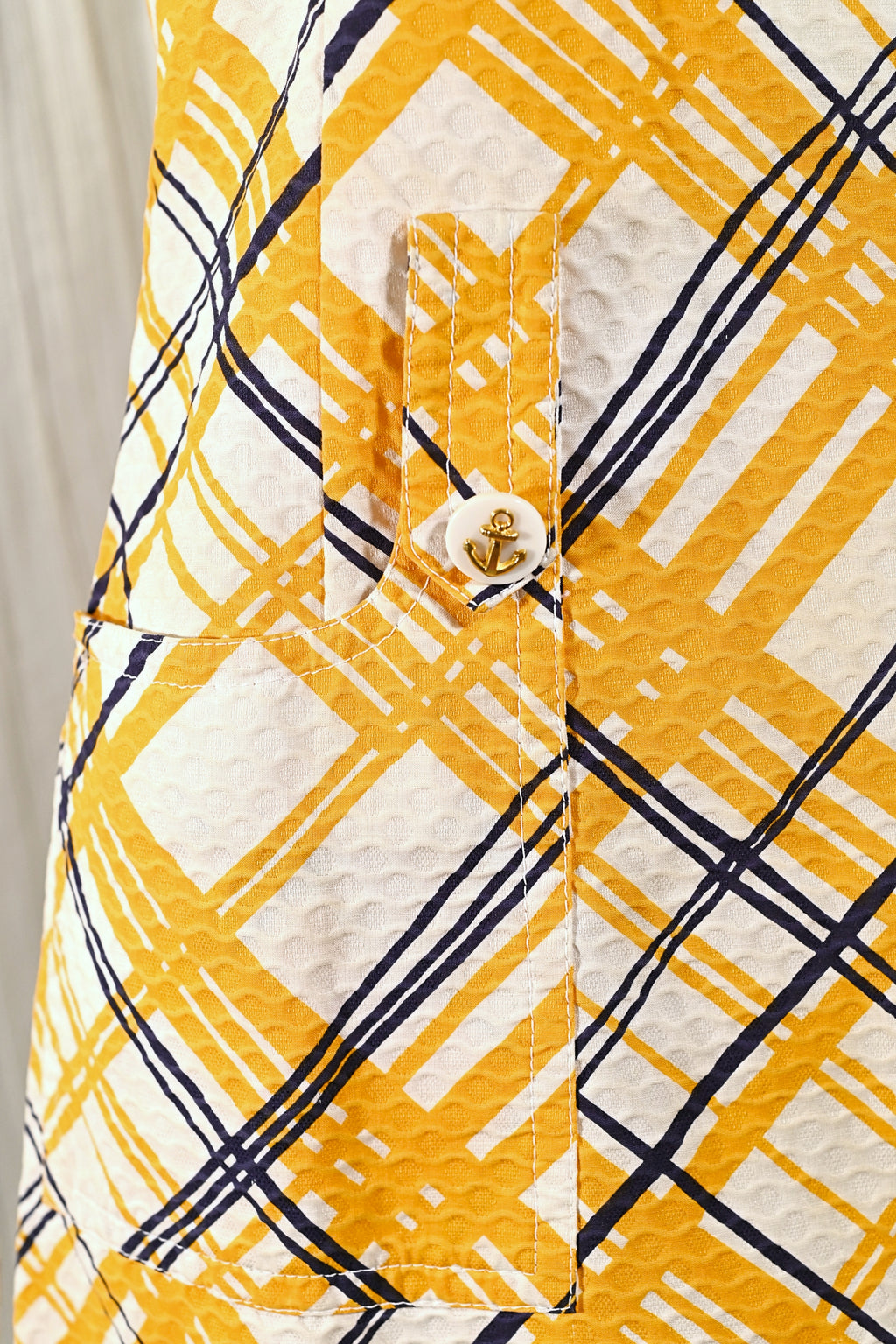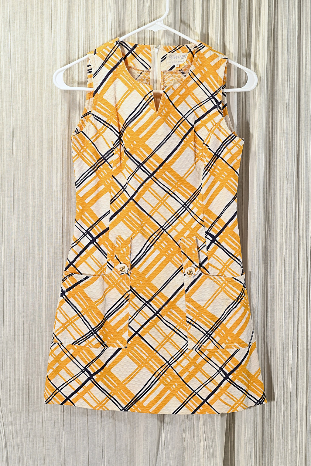Sleeveless, patch pockets, large belt loops, cute anchor buttons, zipper back.