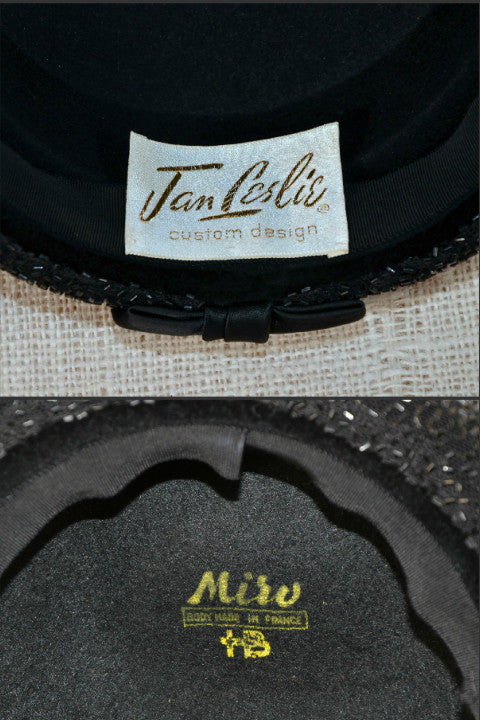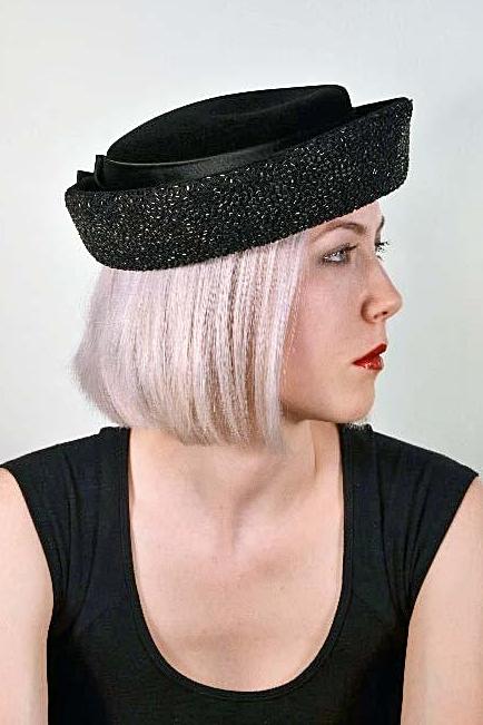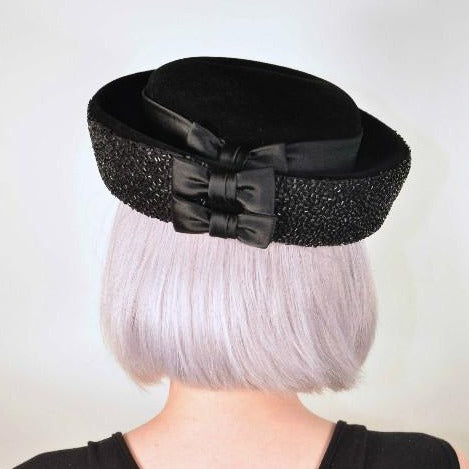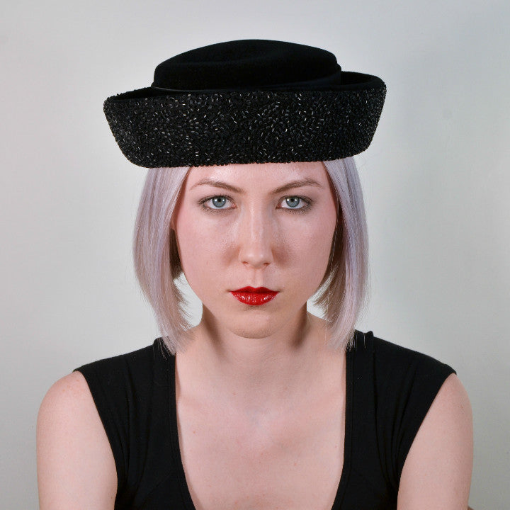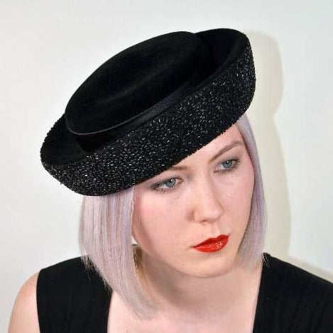 Beautiful elegant hat with a formed brim covered with glass beads.
