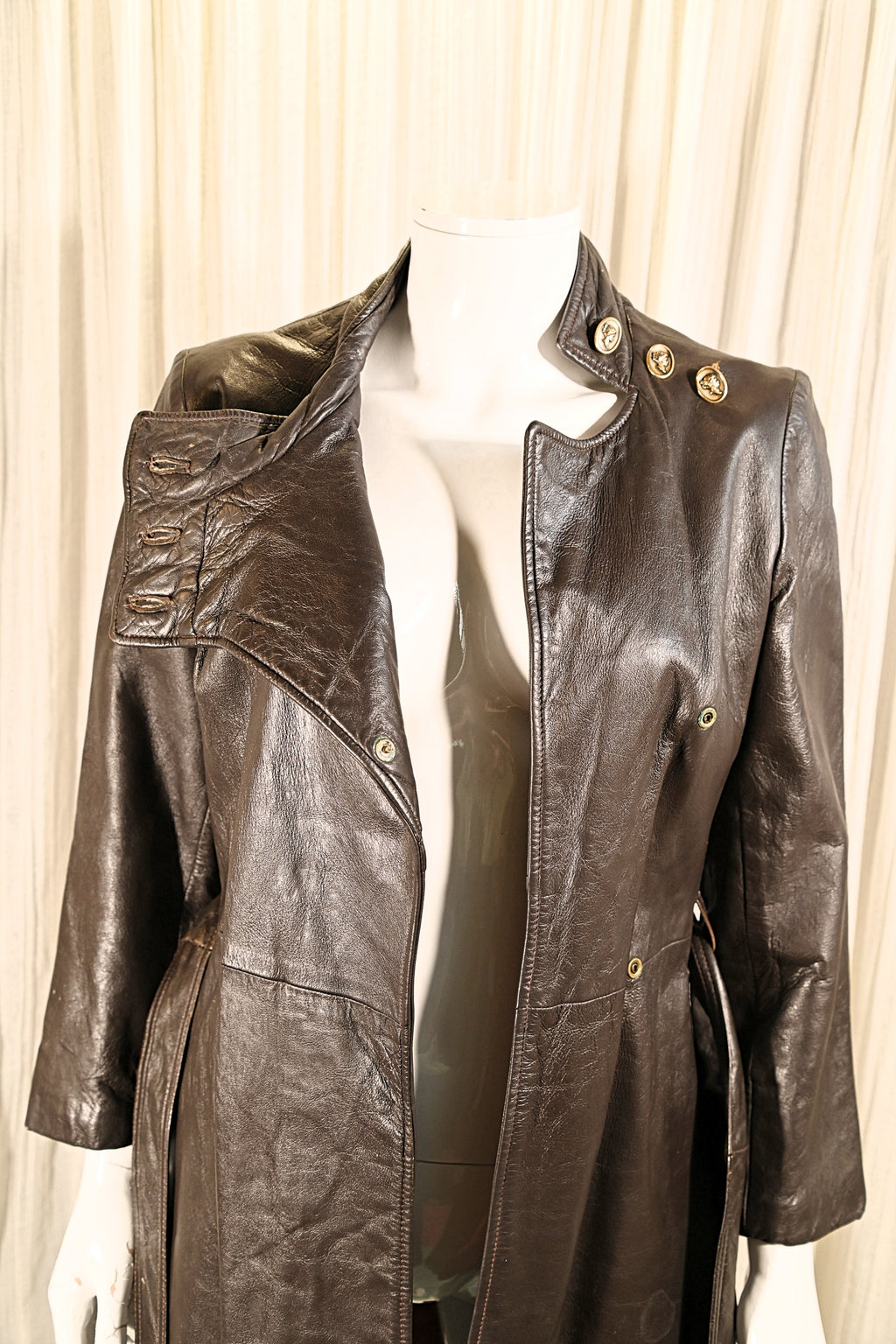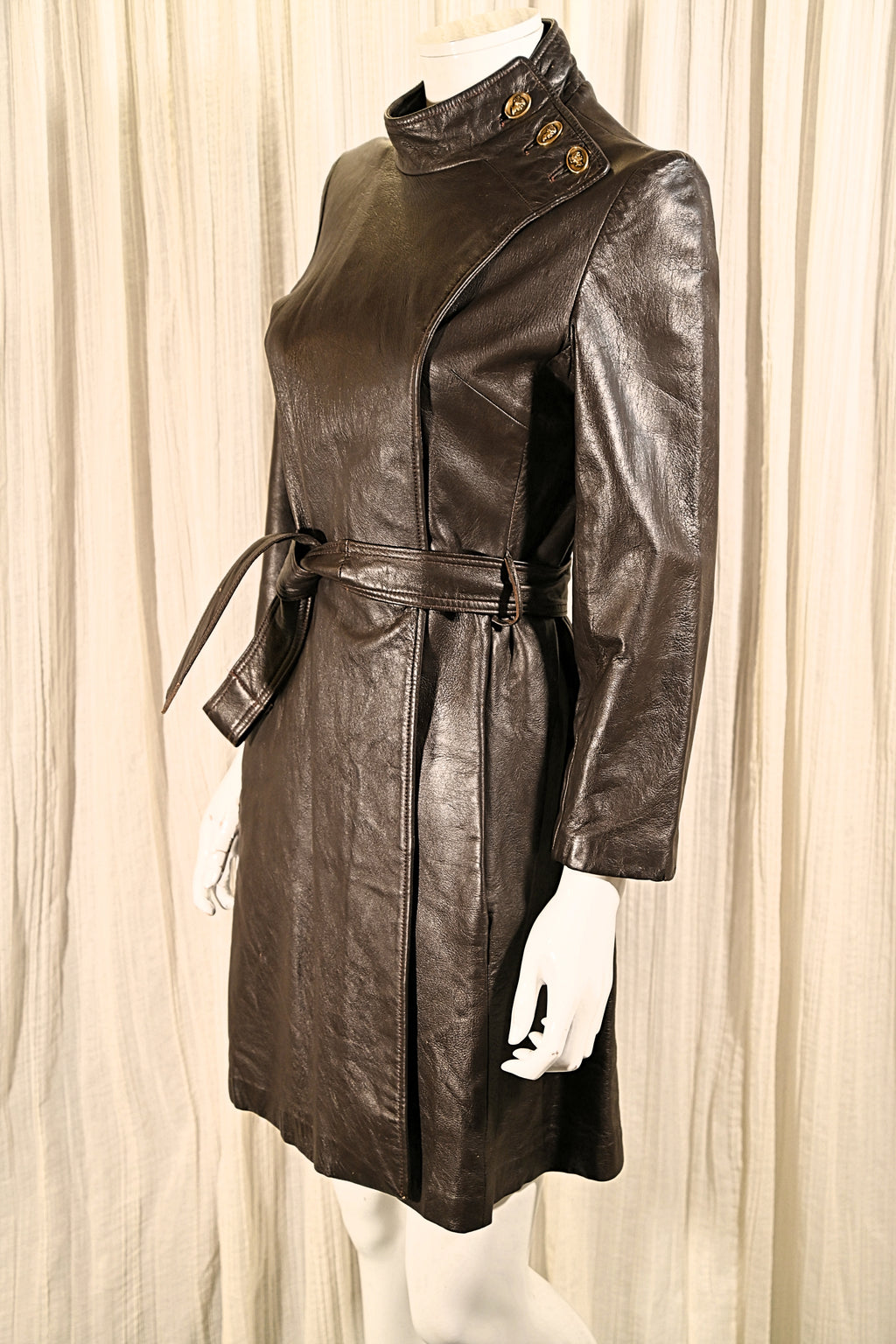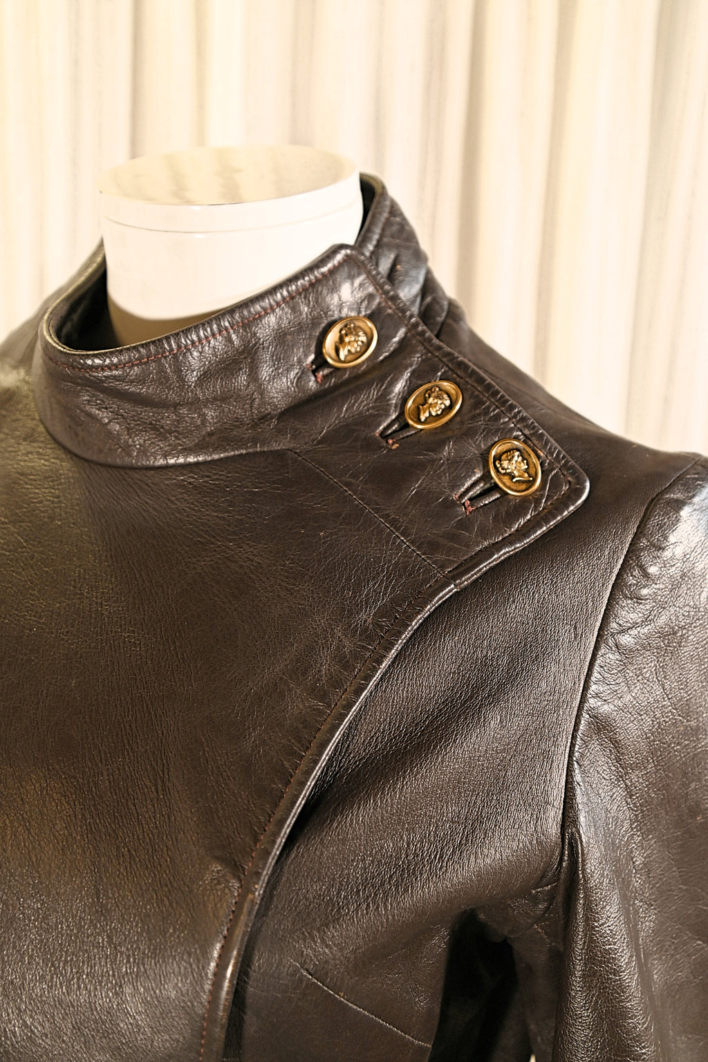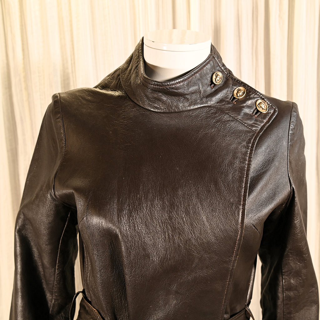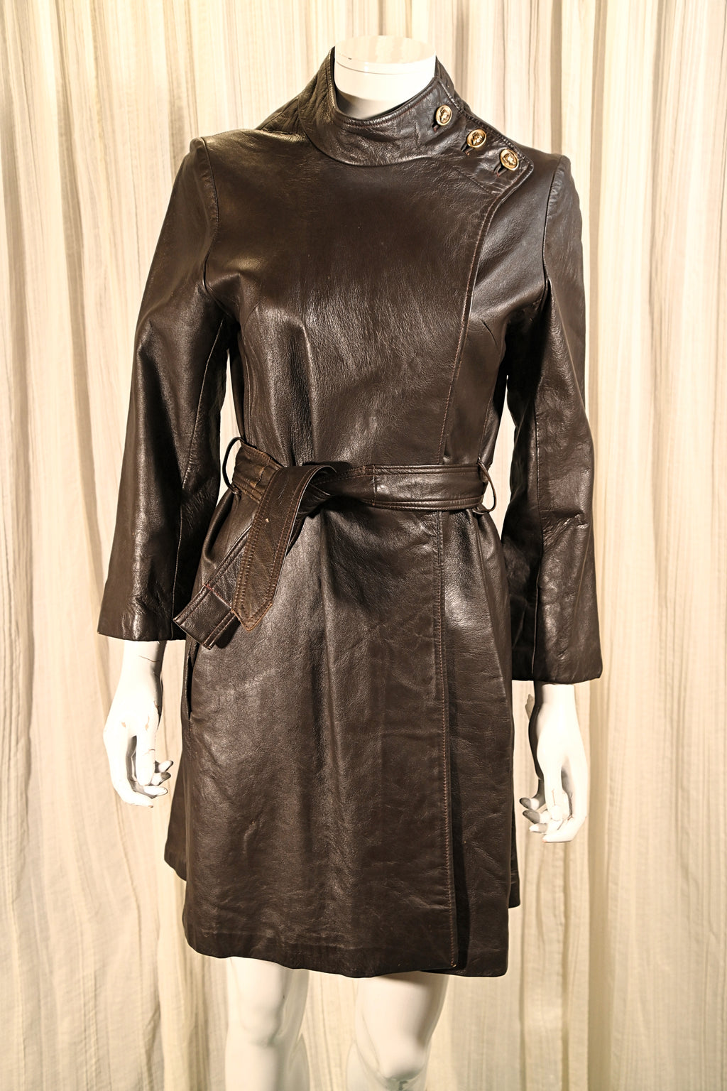 SOLD Vintage 60s Mod Brown Leather Coat, High Neckline w/Buttons XS/S