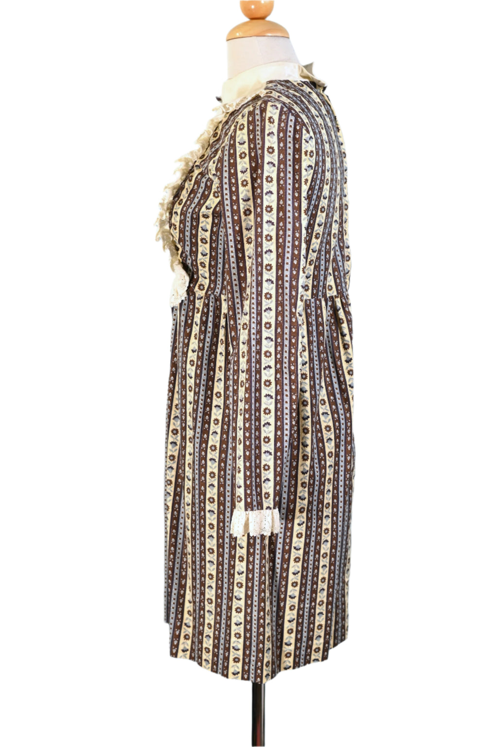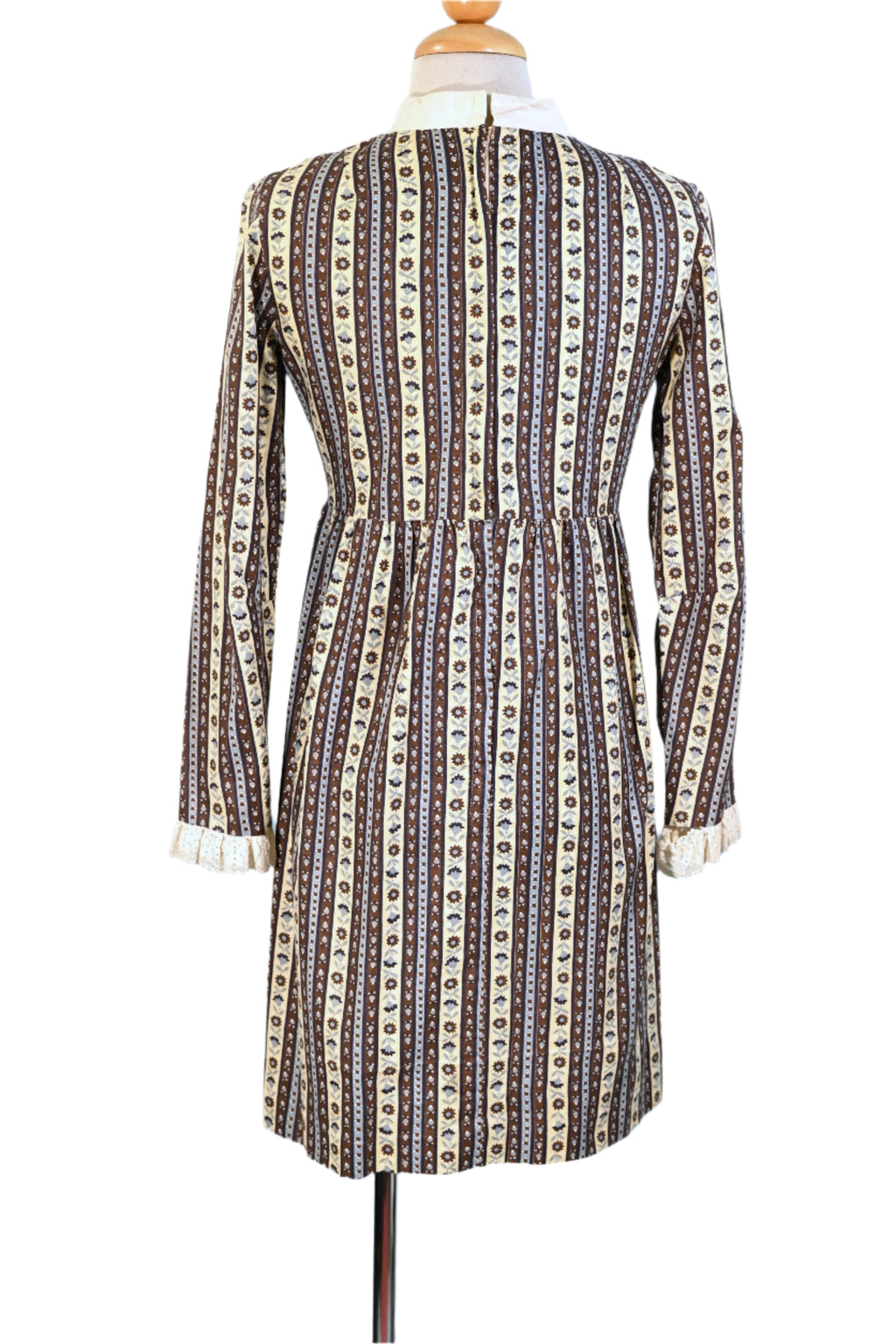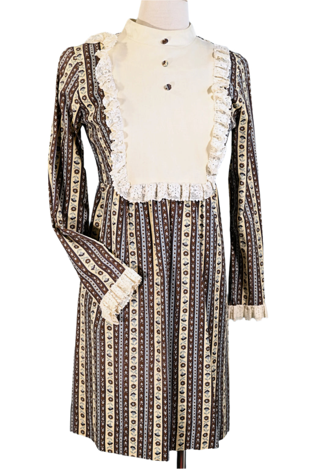 Adorable 60s Mod shift dress with a bib front and lace accents.