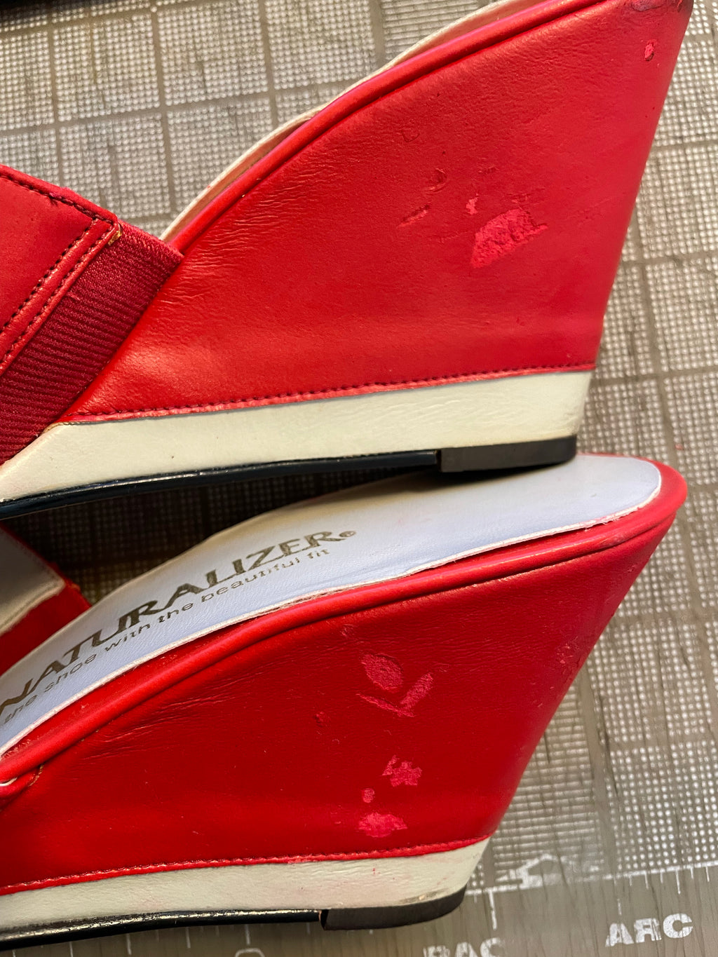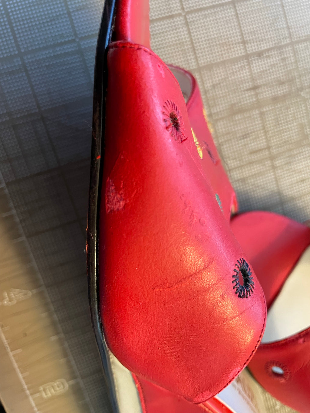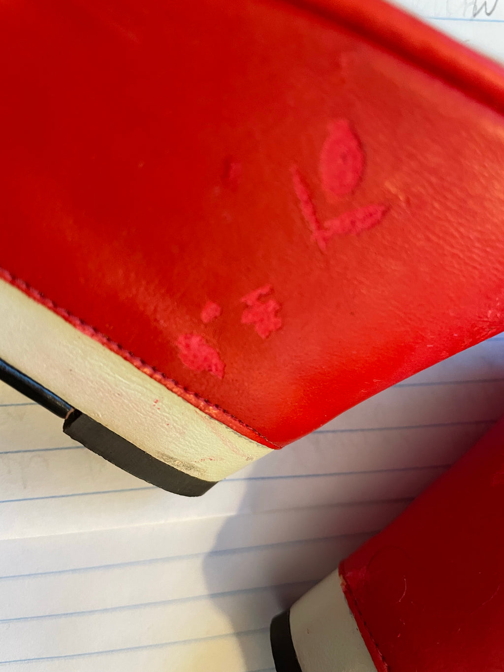 COLOR: Red white leather, stitched accents - yellow, red, green.