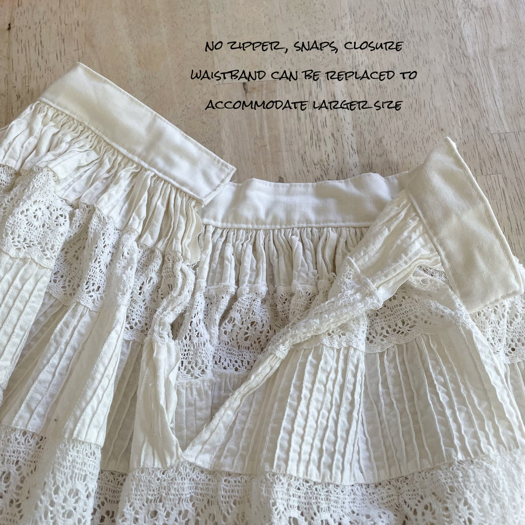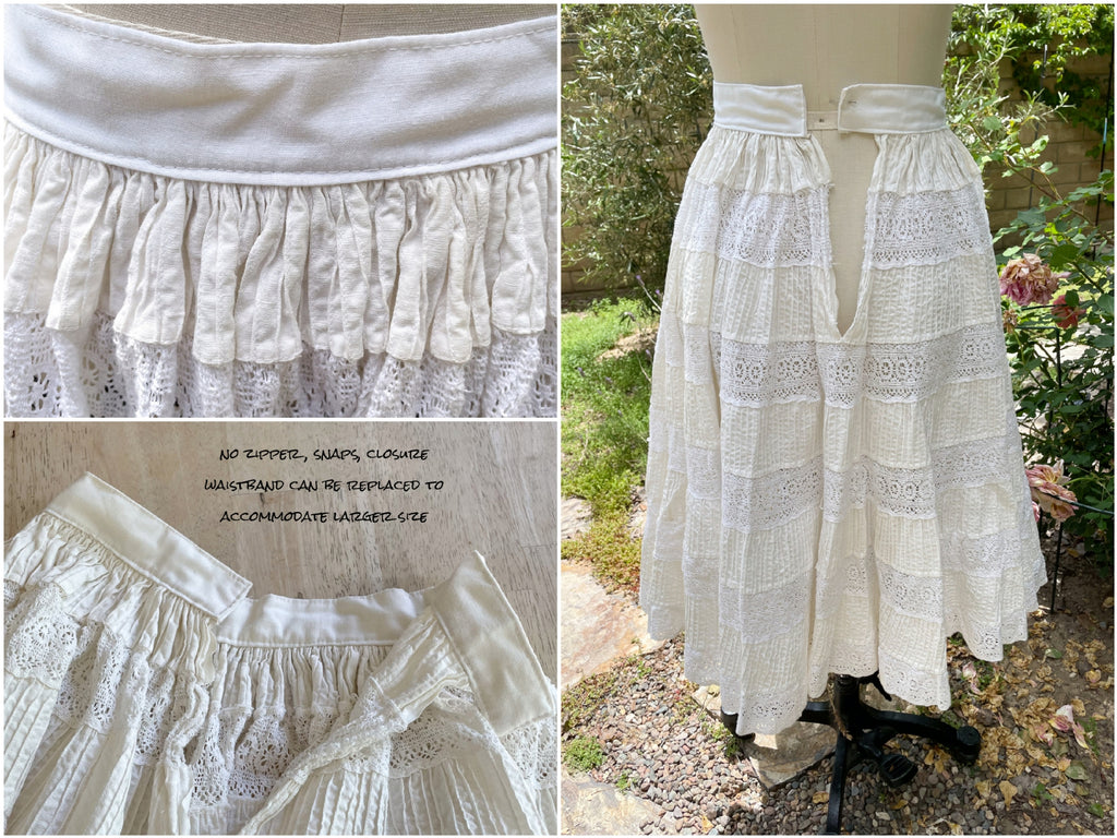 **This skirt can be altered to make the waist larger if you want to replace the waistband. There is gathered fabric below the waistband which would allow for a larger waist. A zipper can also be added if you like. A tailor or handy seamstress can complete this easily.