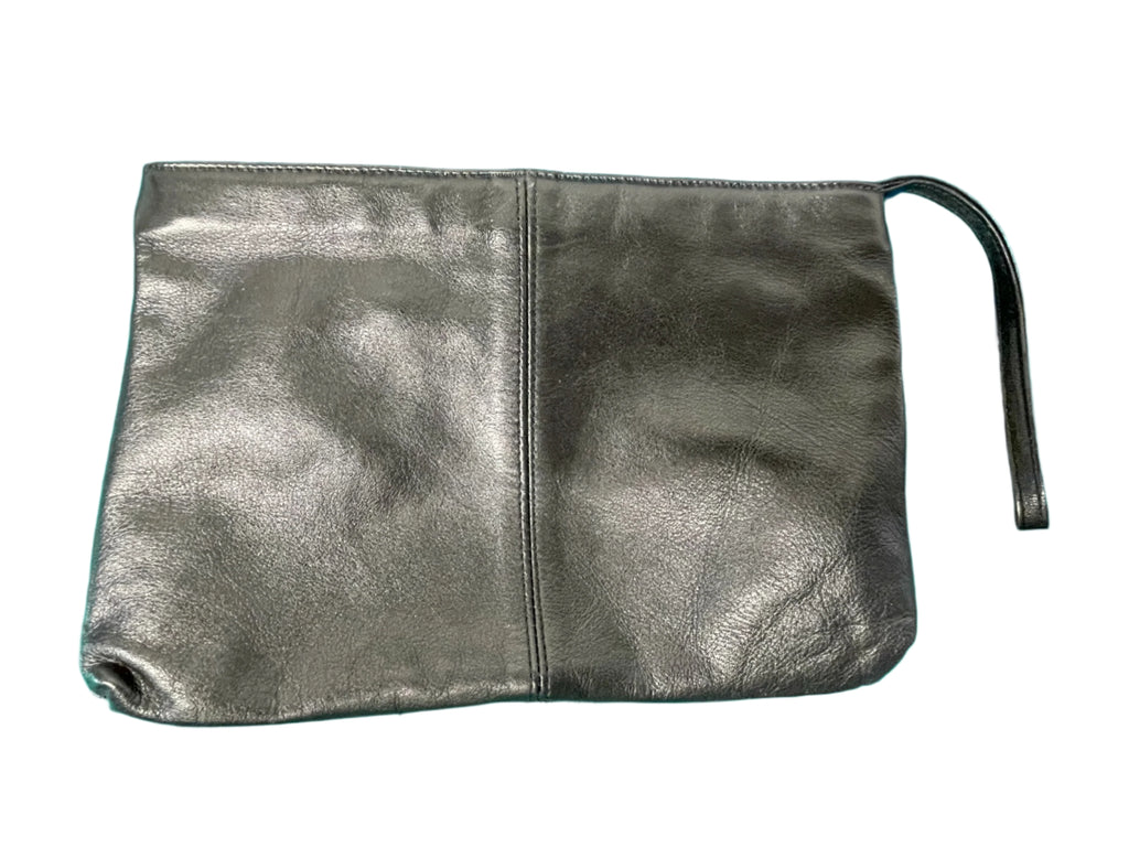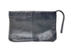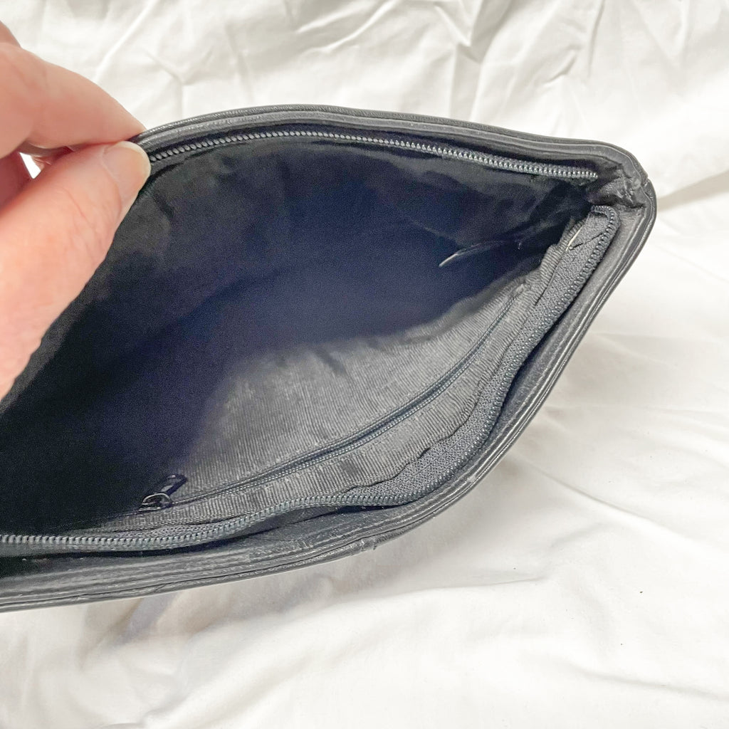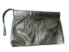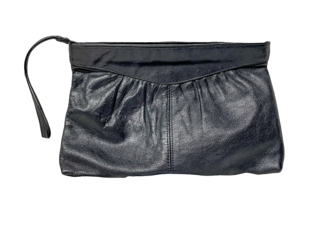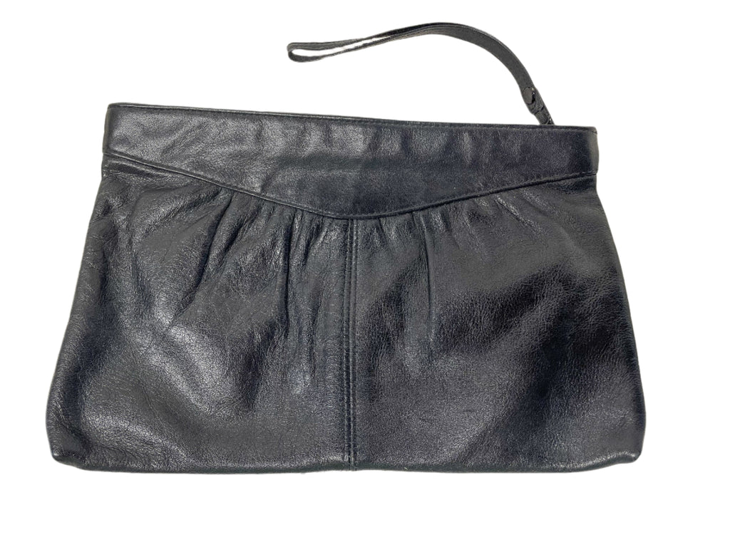 Very nice 70s black leather envelope style clutch bag with wrist strap zipper pull.