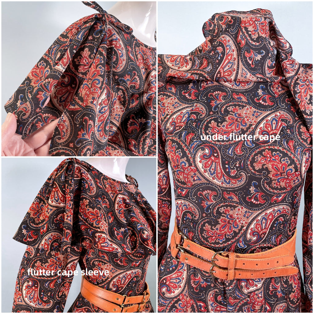 The capelet splits on the side creating a flutter, ties also shoulders.