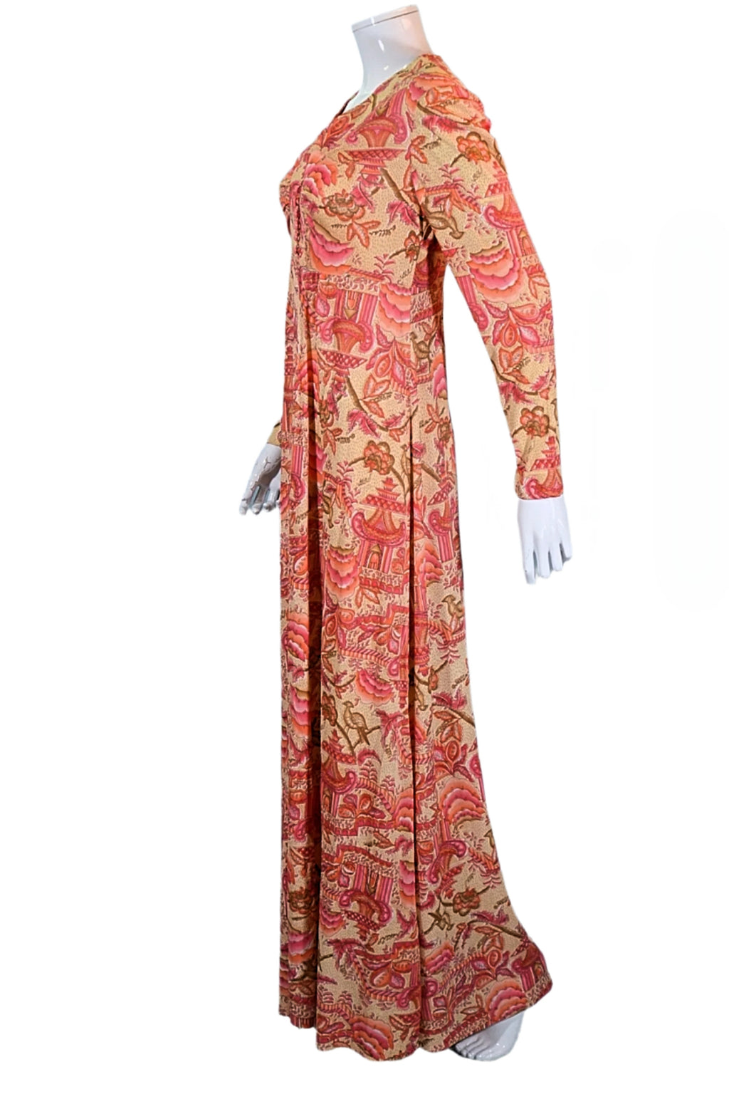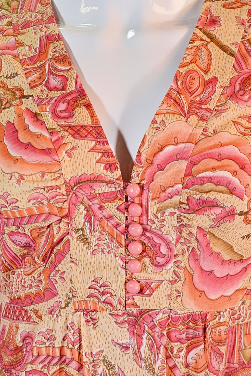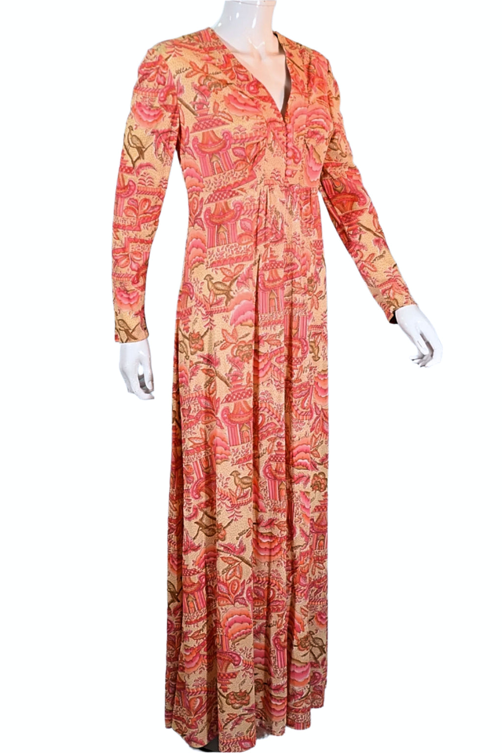 70s maxi dress with a fun Asian pattern with flowers, birds, and pagodas.
