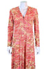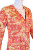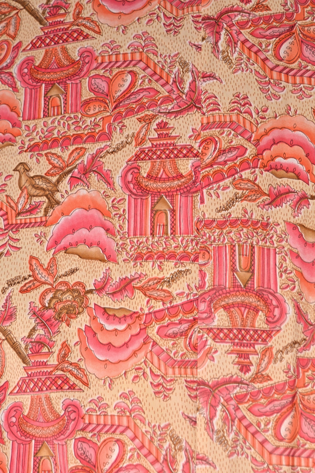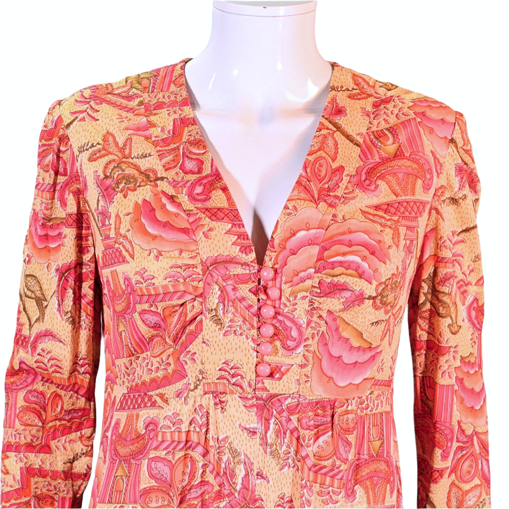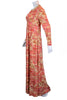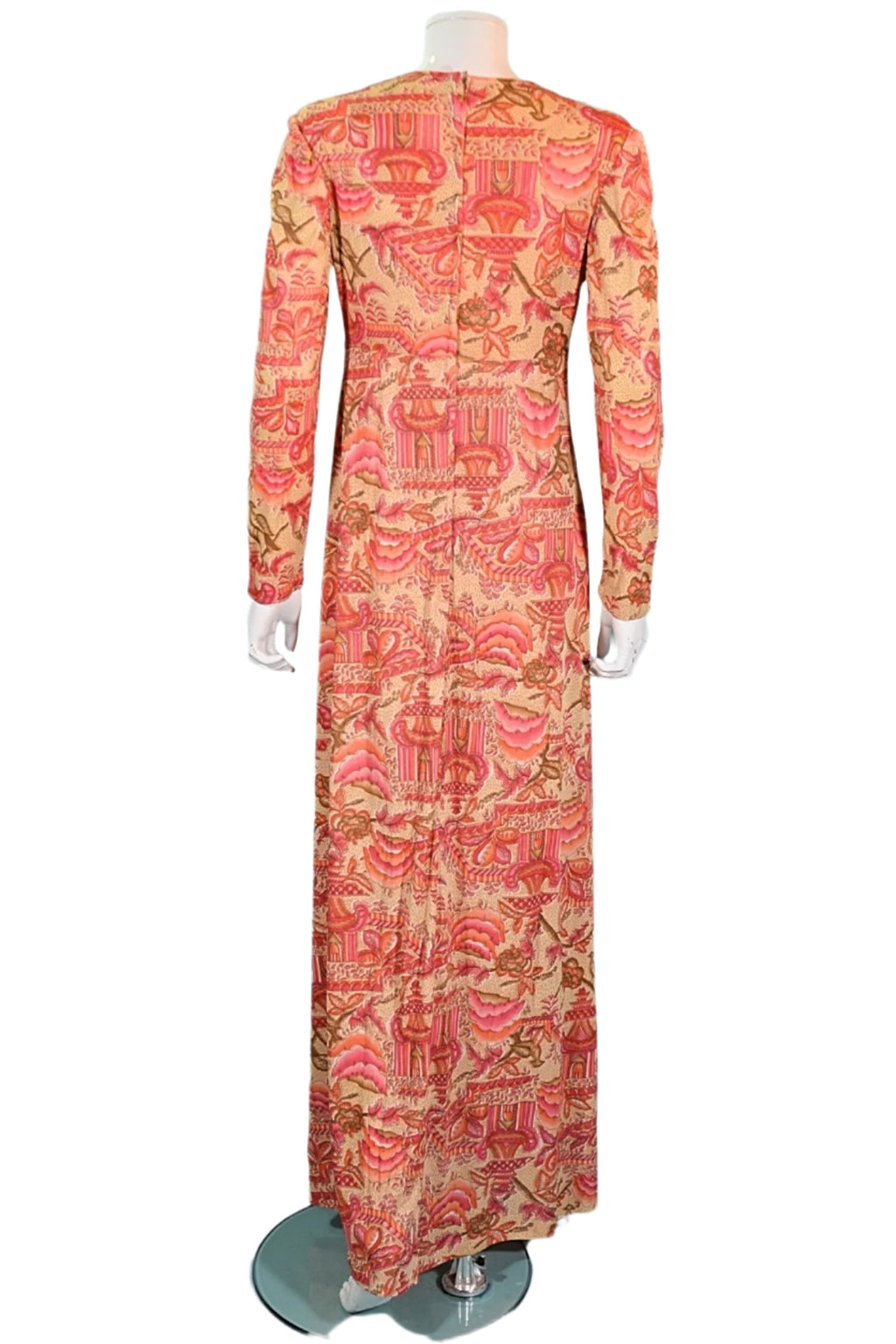 70s maxi dress with a fun Asian pattern with flowers, birds, and pagodas.