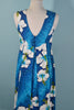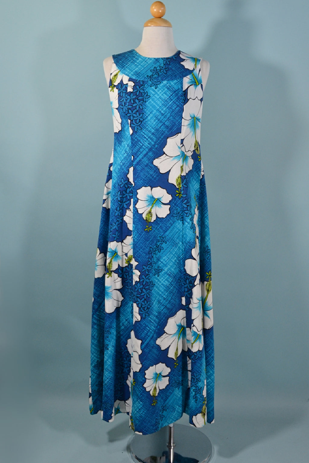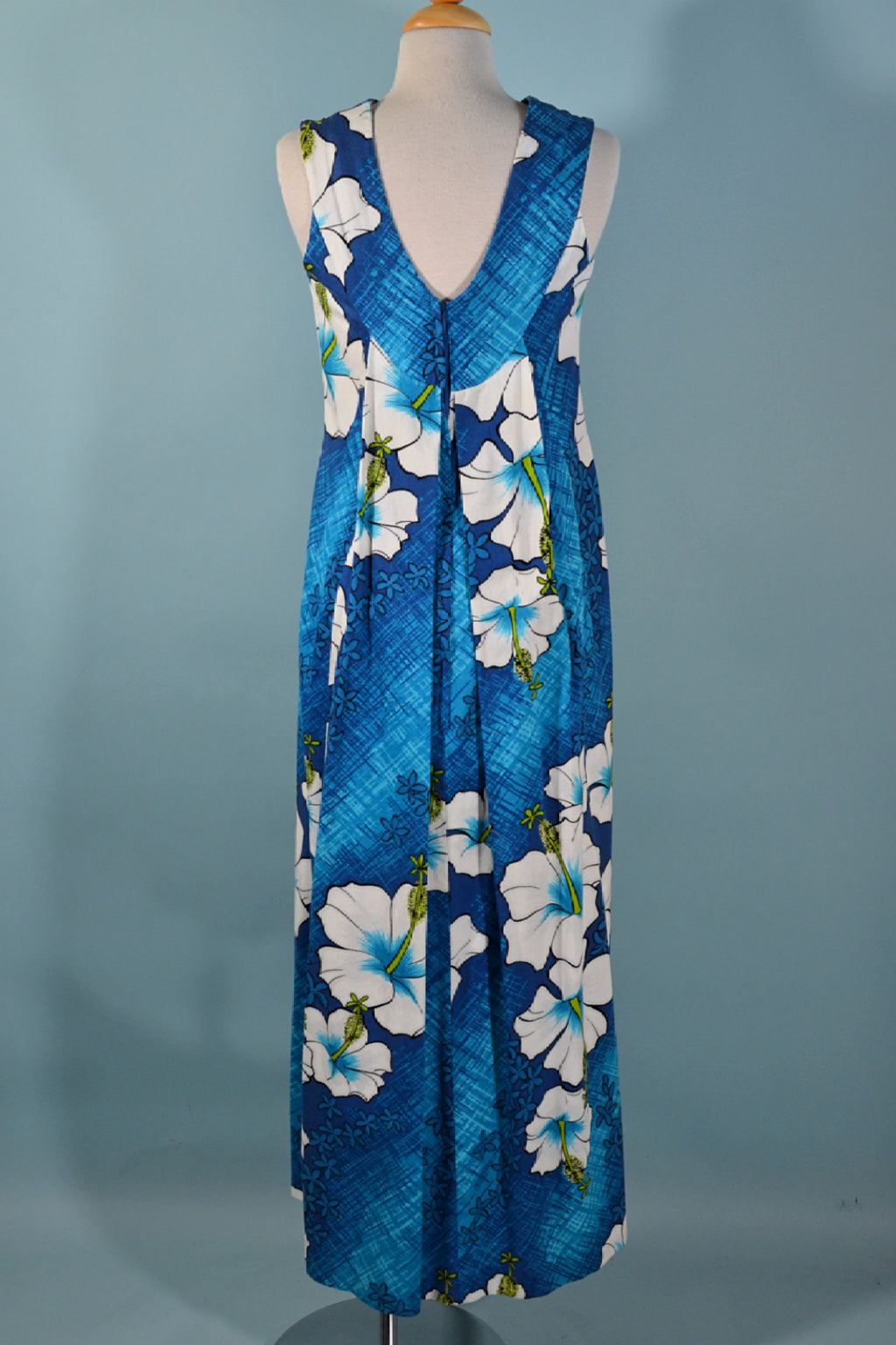 Super cute vintage 1970s Hawaiian print maxi dress. Sleeveless with a scoop neckline in the front, lower cut at the back. Zipper at the back.