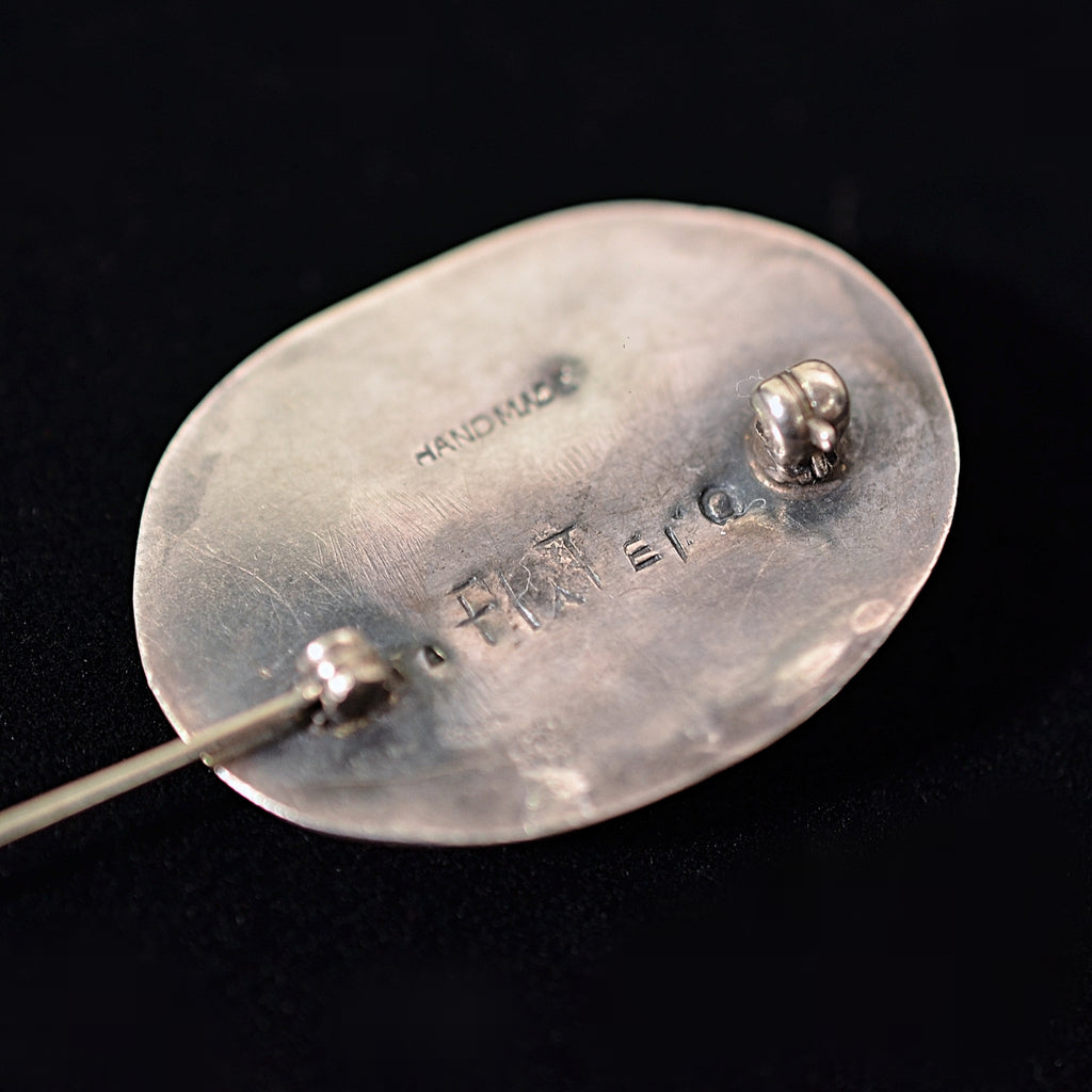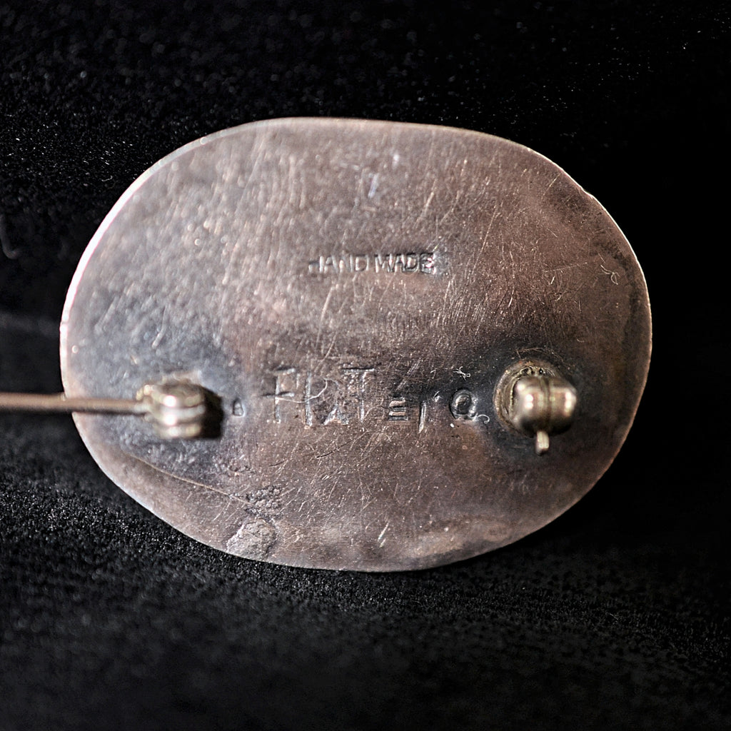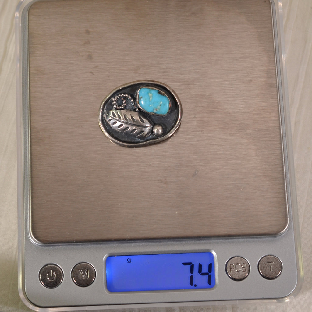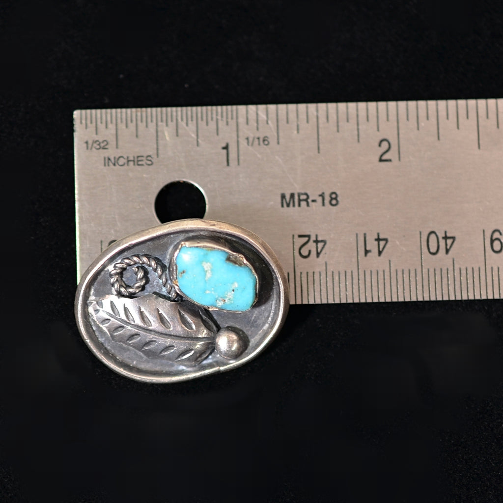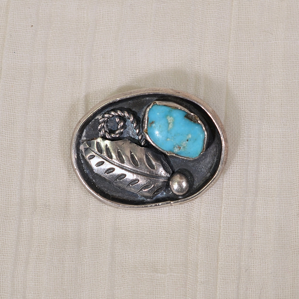 DESCRIPTION: Lovely vintage oval shape sterling silver brooch with a leaf detail and a bezel set turquoise. The piece is signed Platero, it is attributed to Ramone Platero, a Navajo silversmith/artisan. It is not a large piece, but it is very nice. ca. 1970s