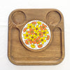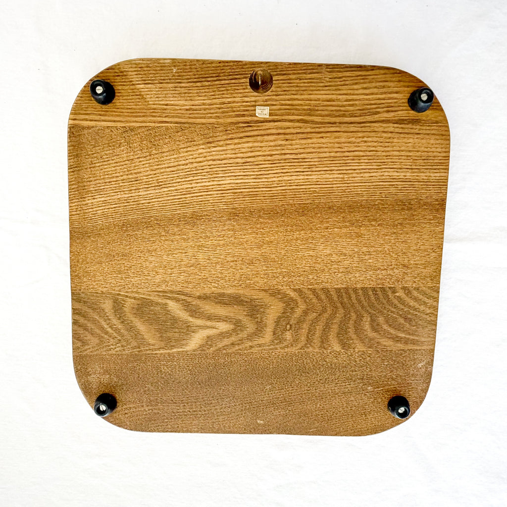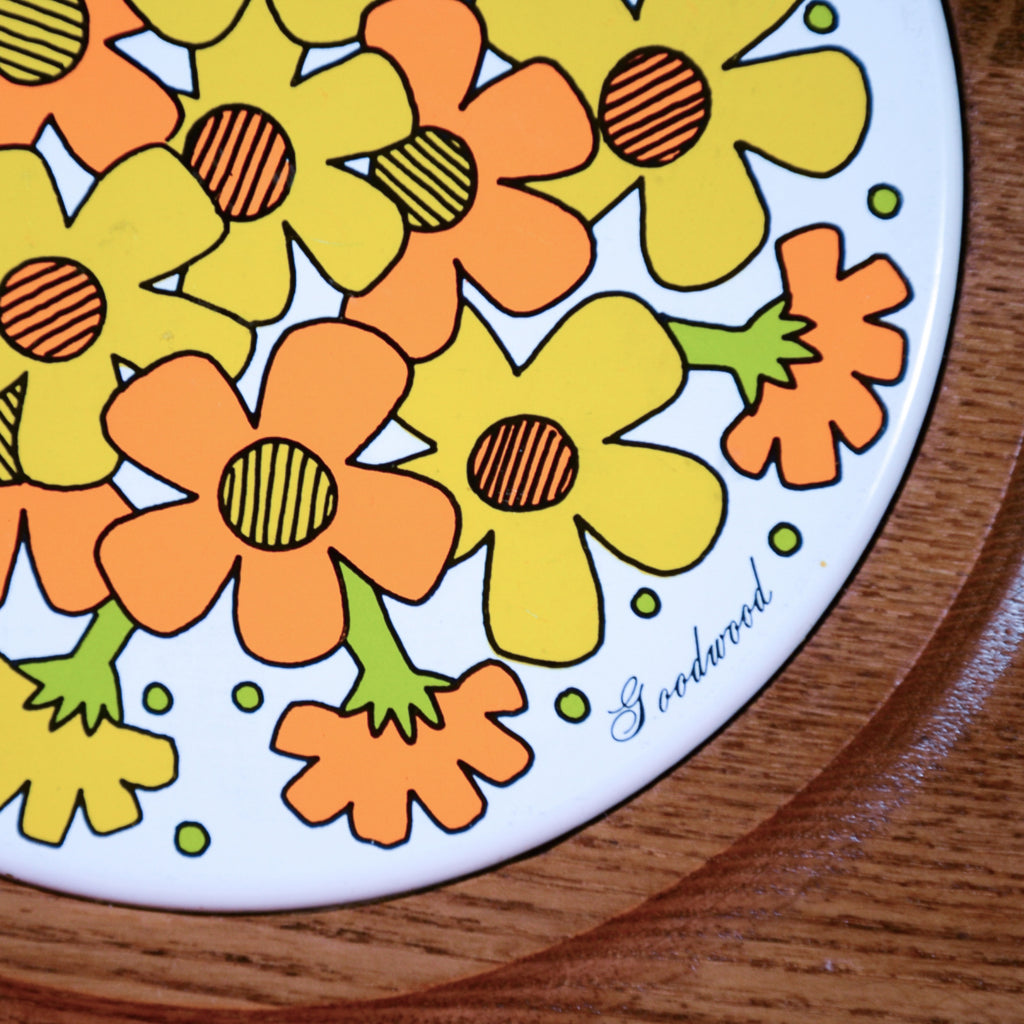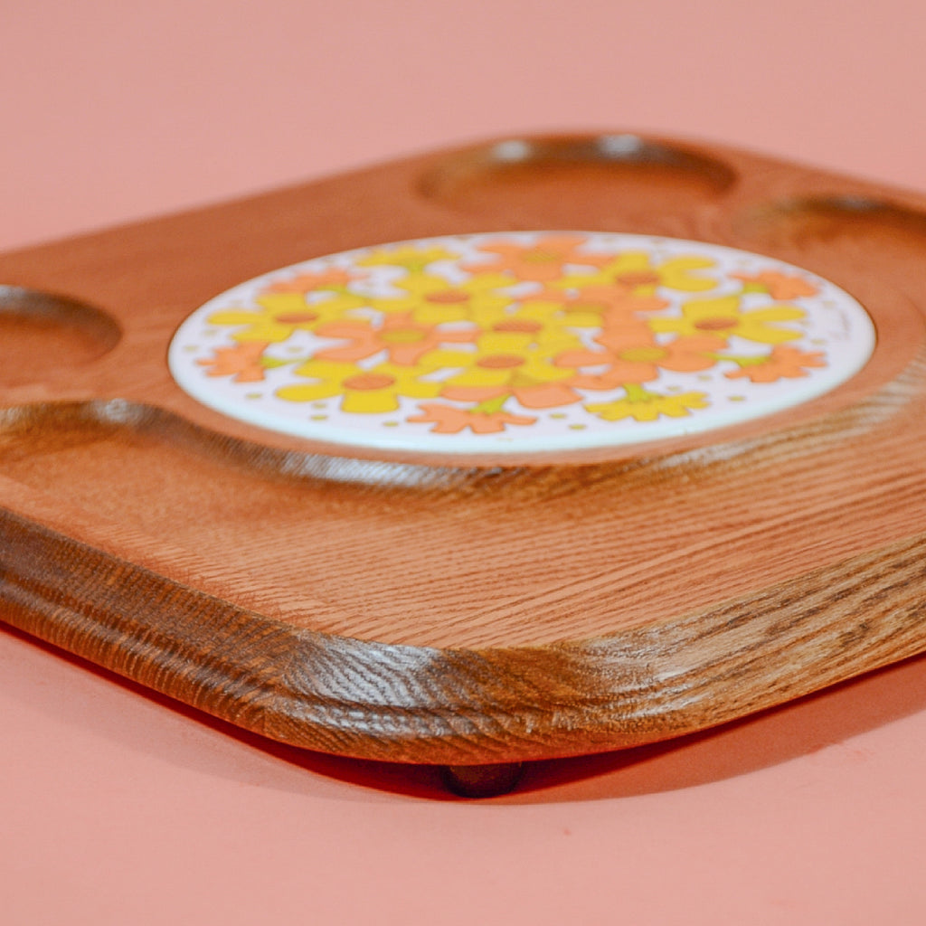 Vintage oak serving tray/platter with a happy floral ceramic tile on center.