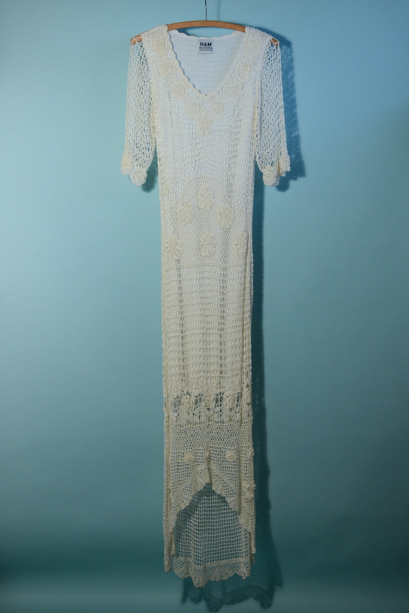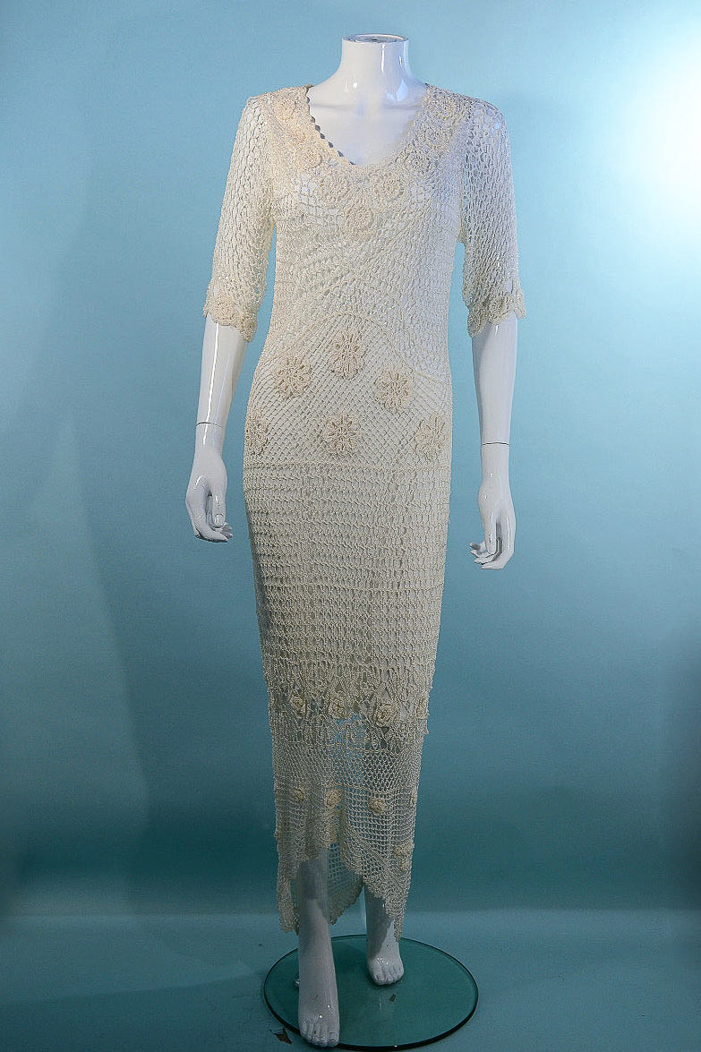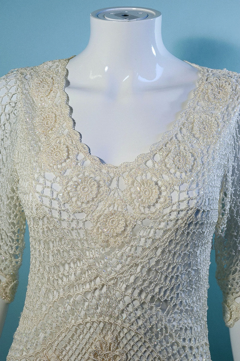 Beautiful 1990s crochet long tube dress accented with iridescent glass beads.
