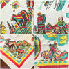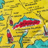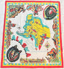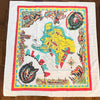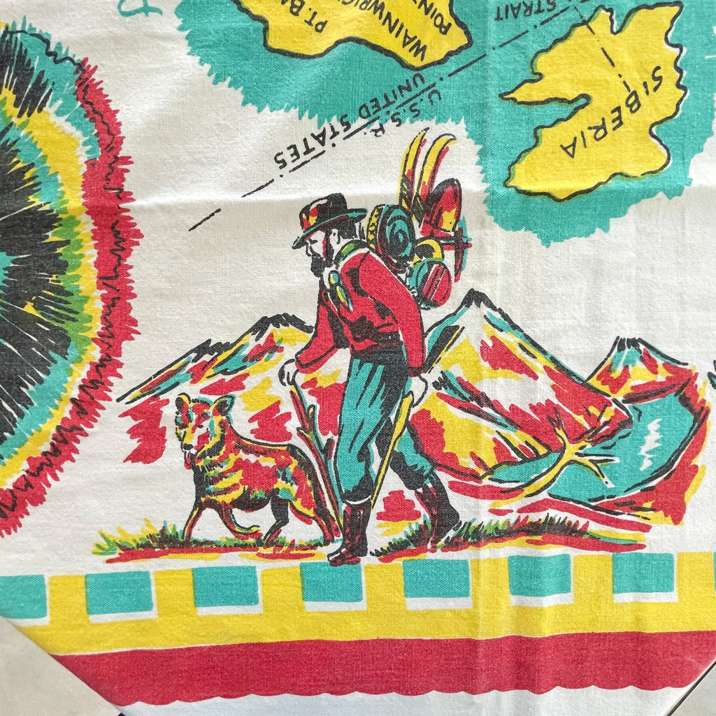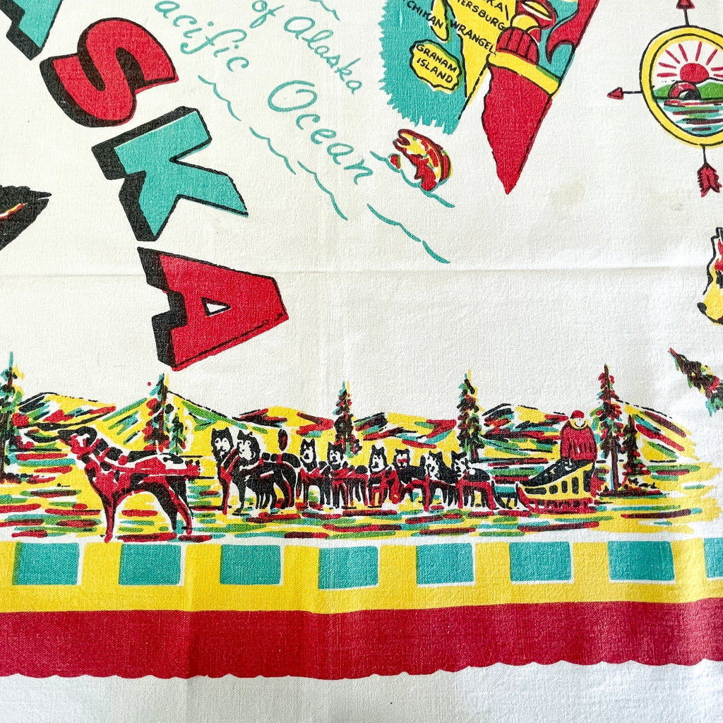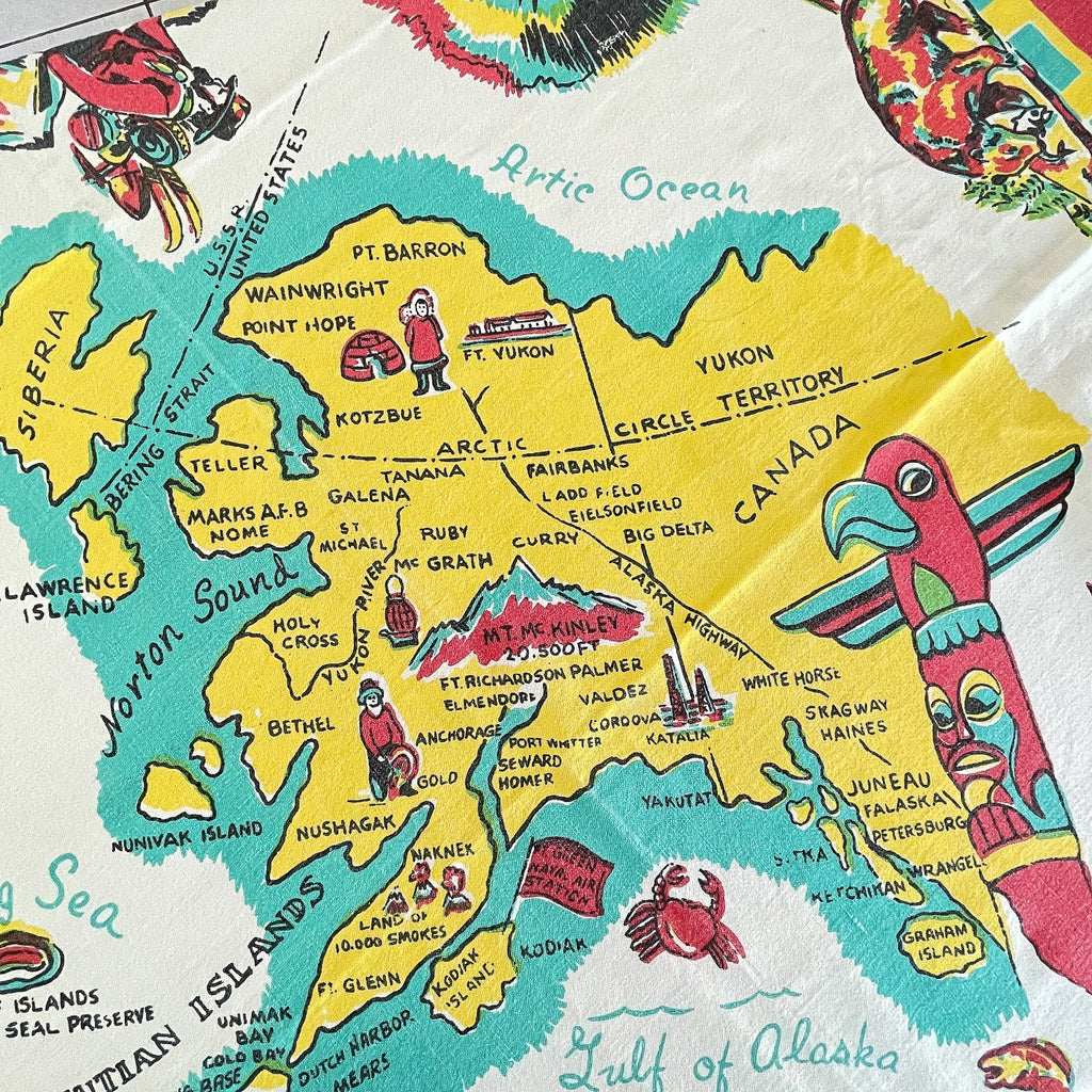 Vintage Alaska souvenir tablecloth with map including cities and interesting tourist sights.