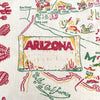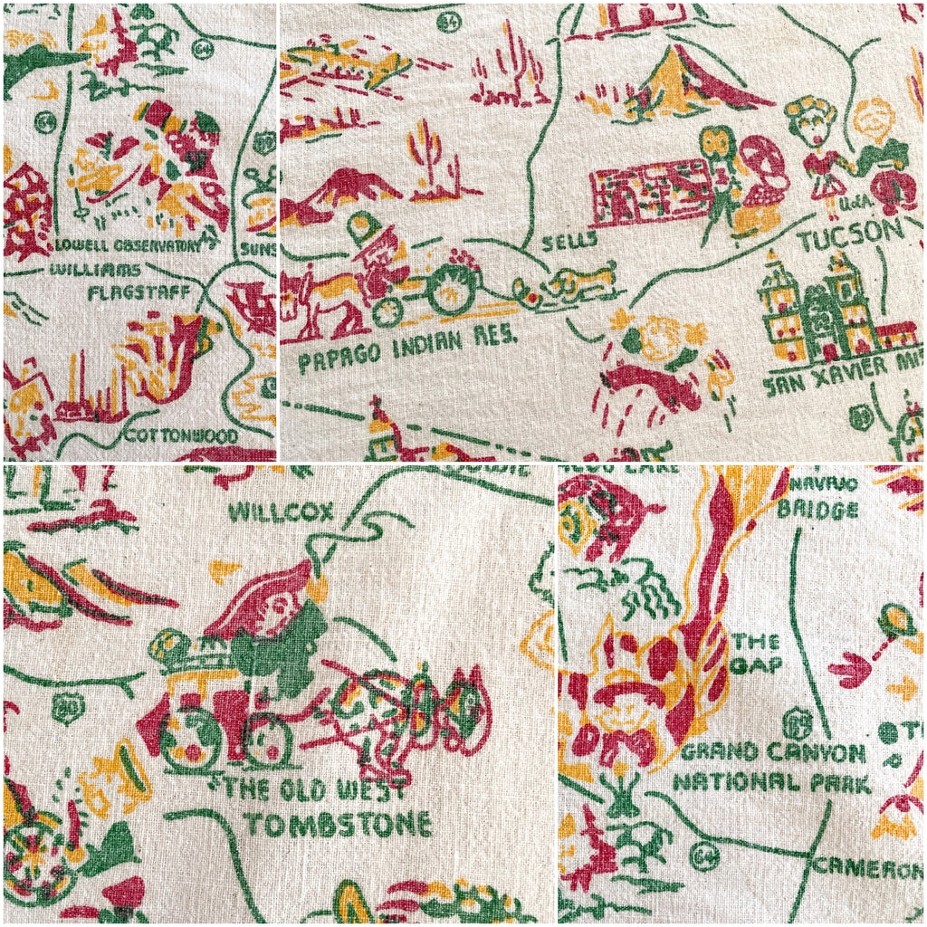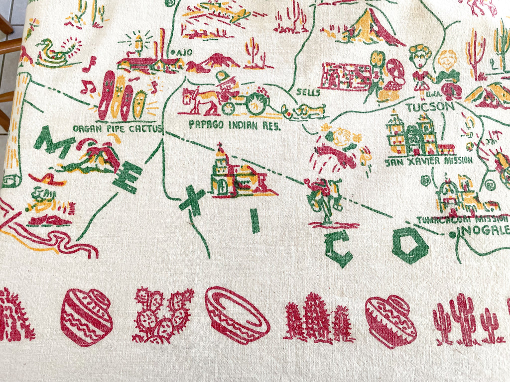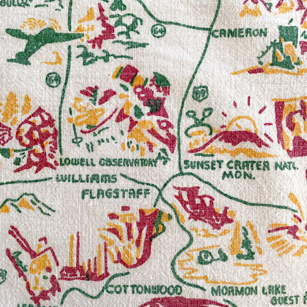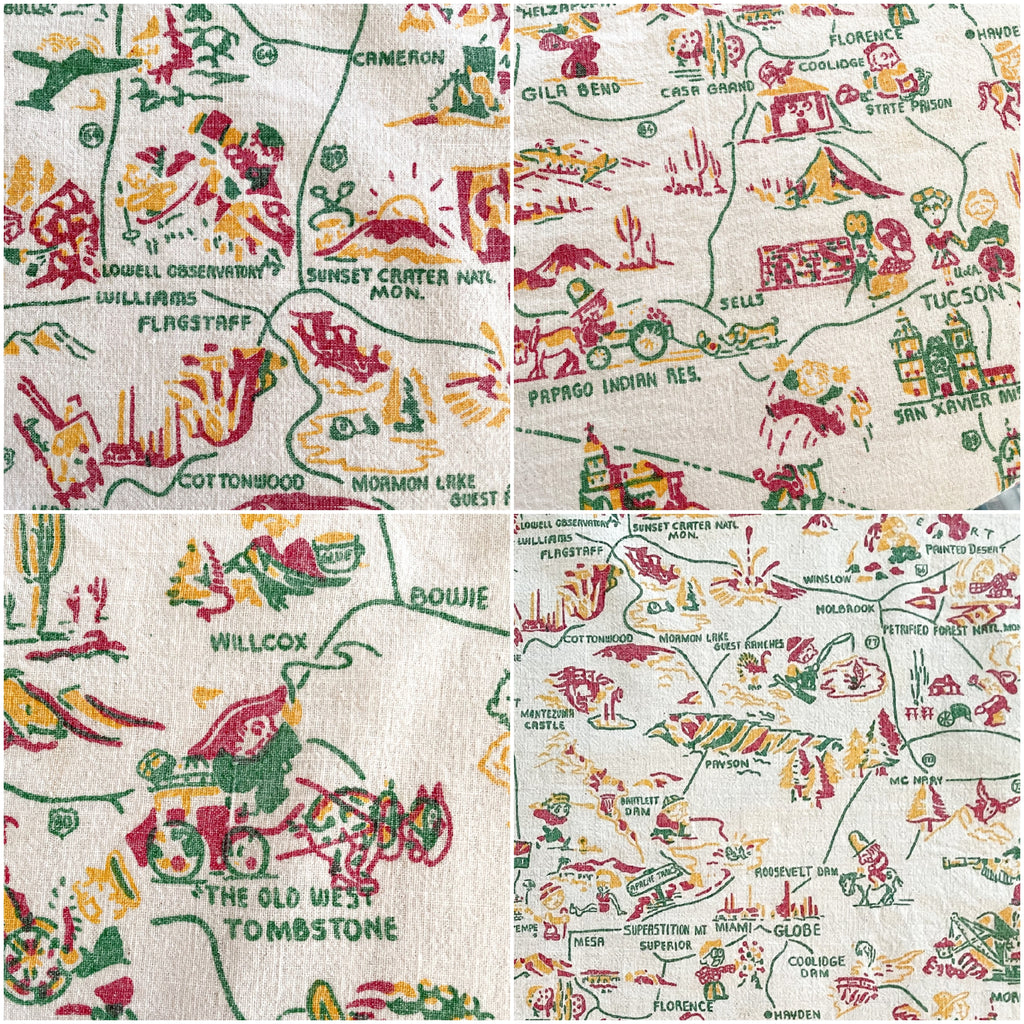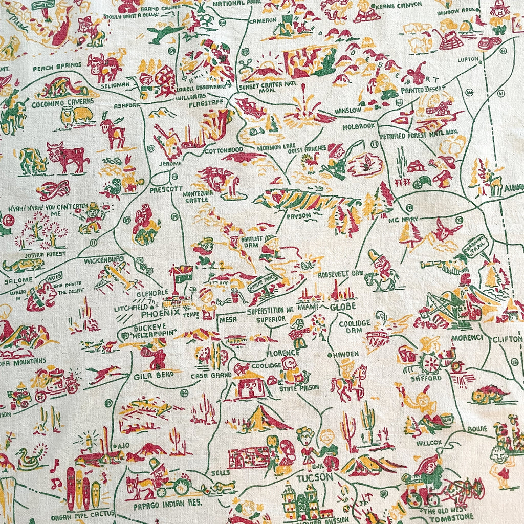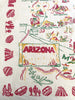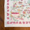 Vintage Arizona souvenir tablecloth with map including cities and interesting tourist sights.