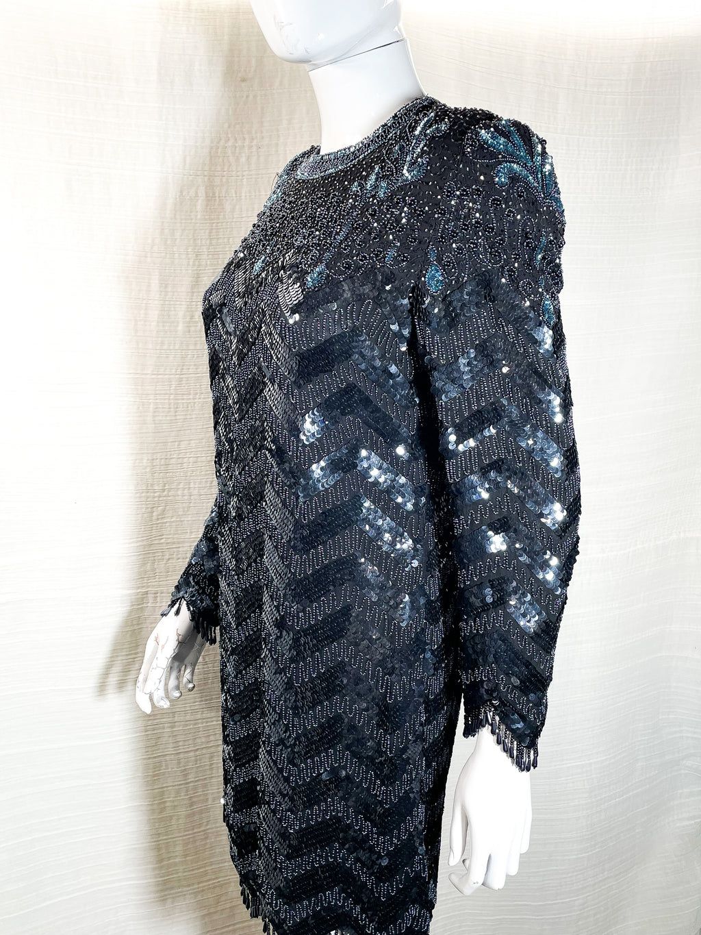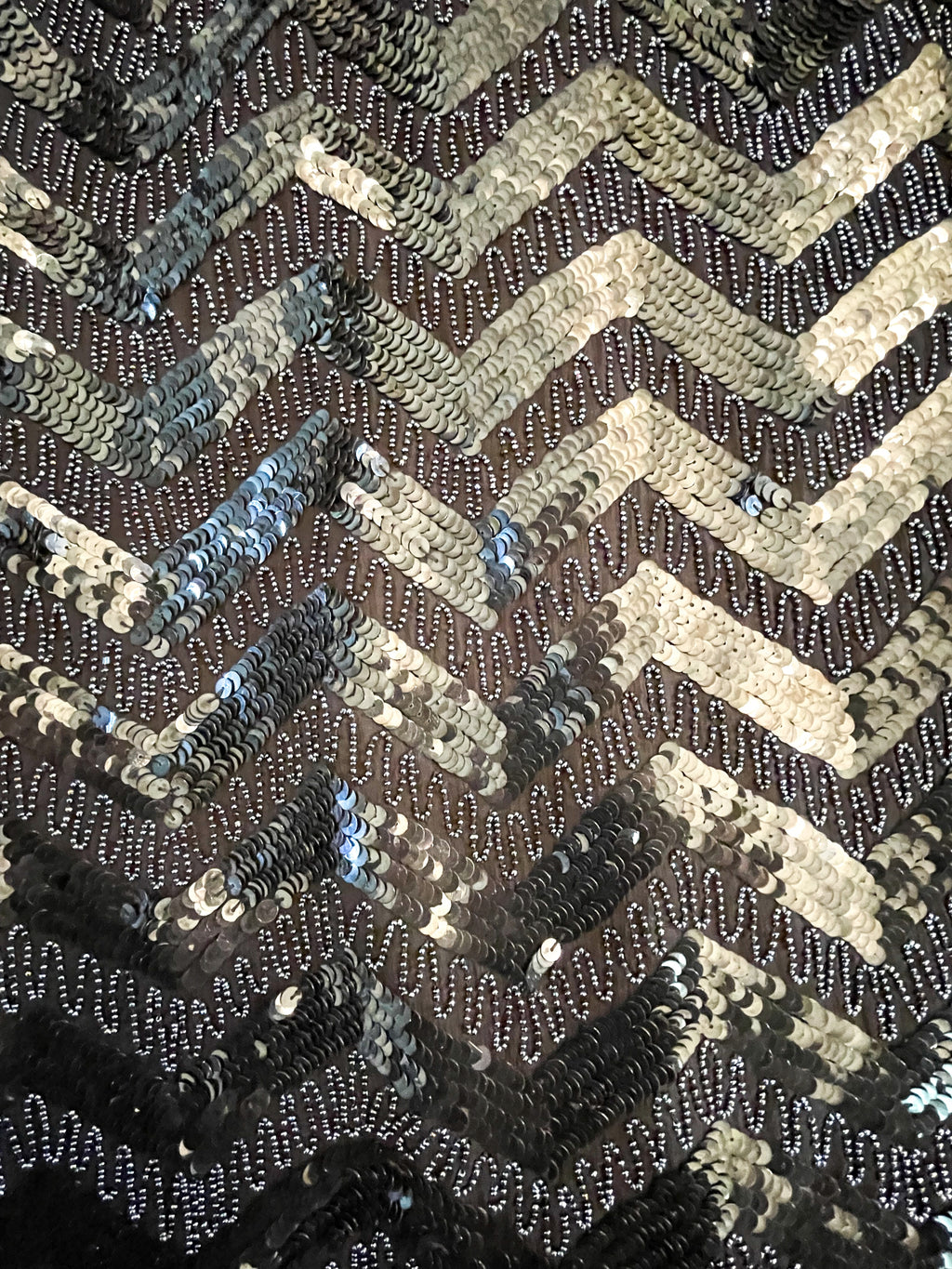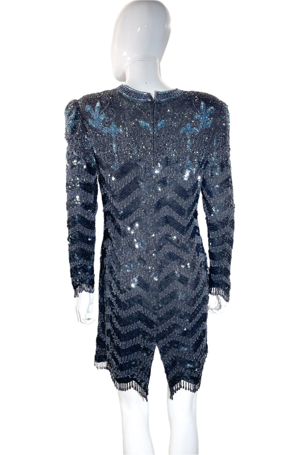 Beads in a zigzag pattern, sequins in a herringbone geometric pattern, blue sequin flowers on top bodice. Hemline & cuffs are zigzag design.