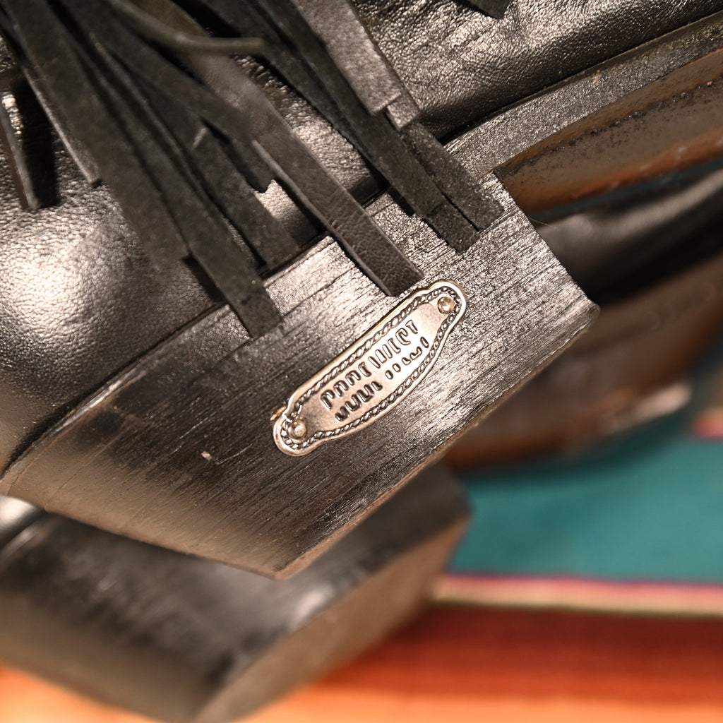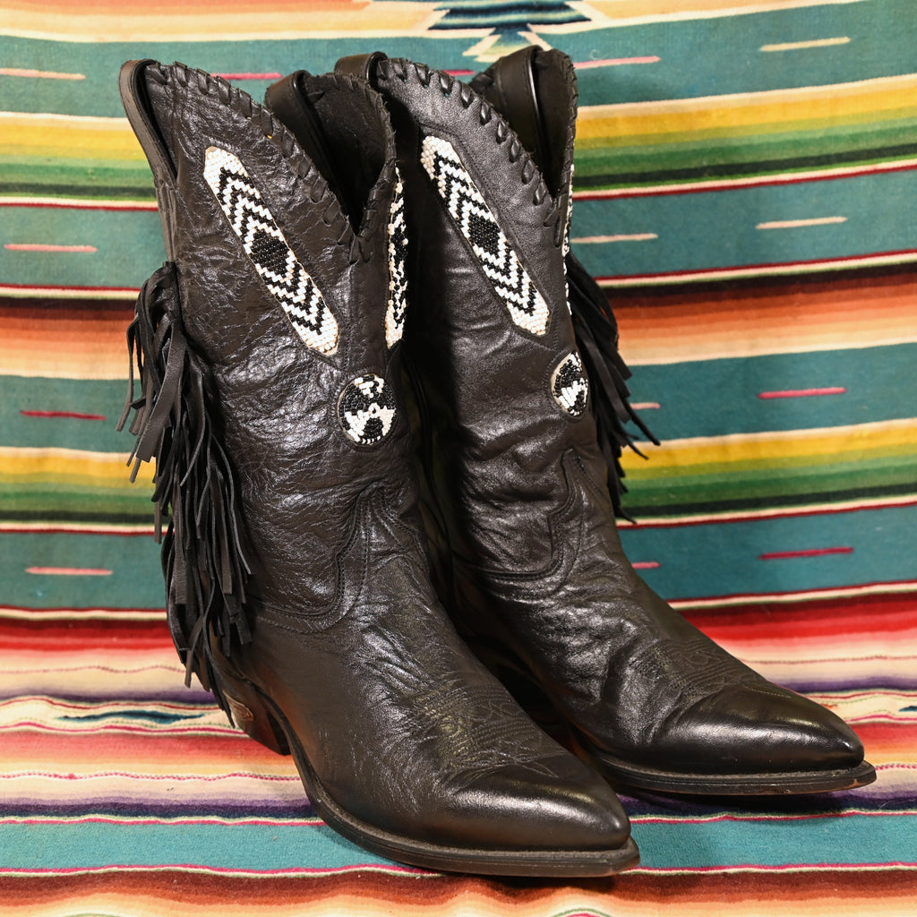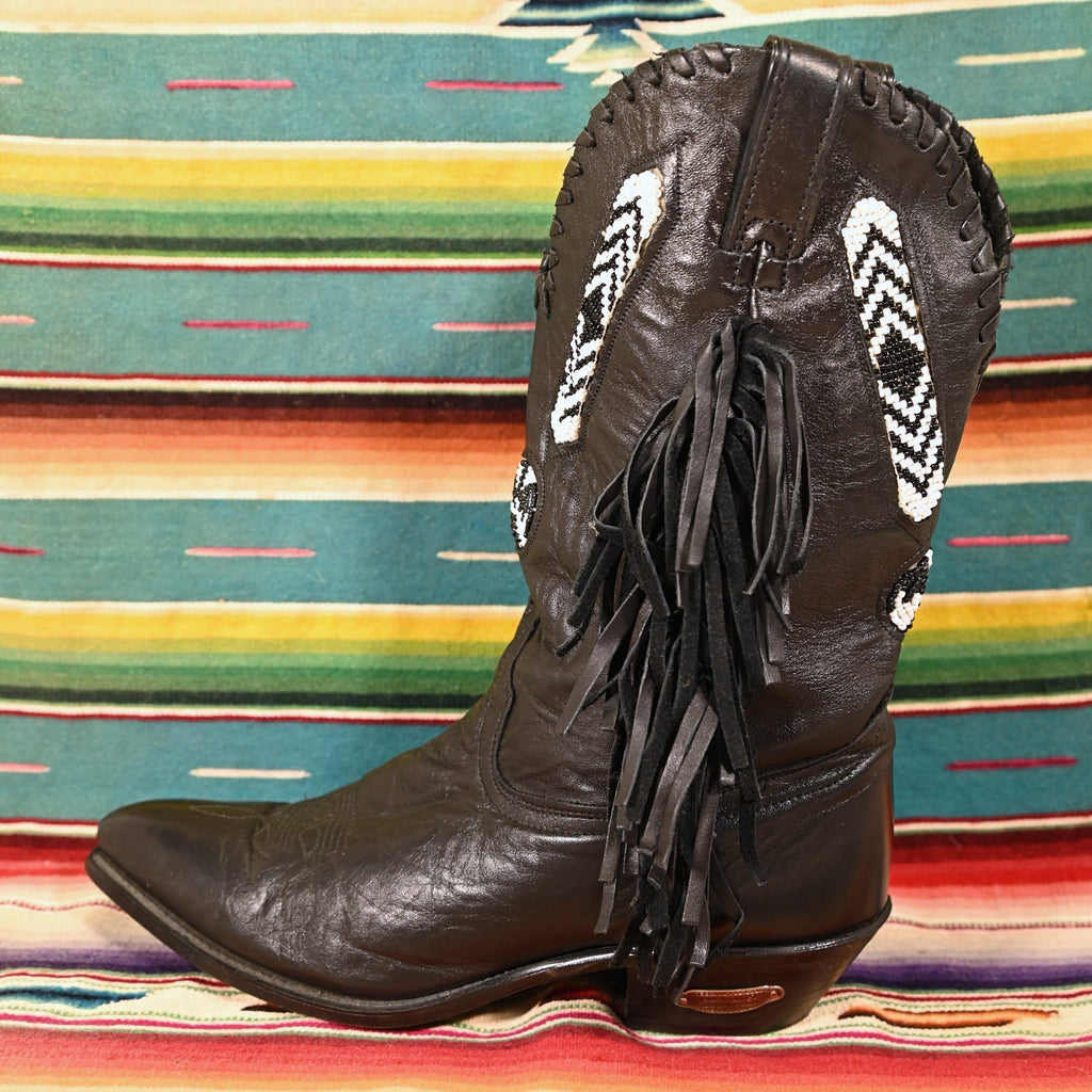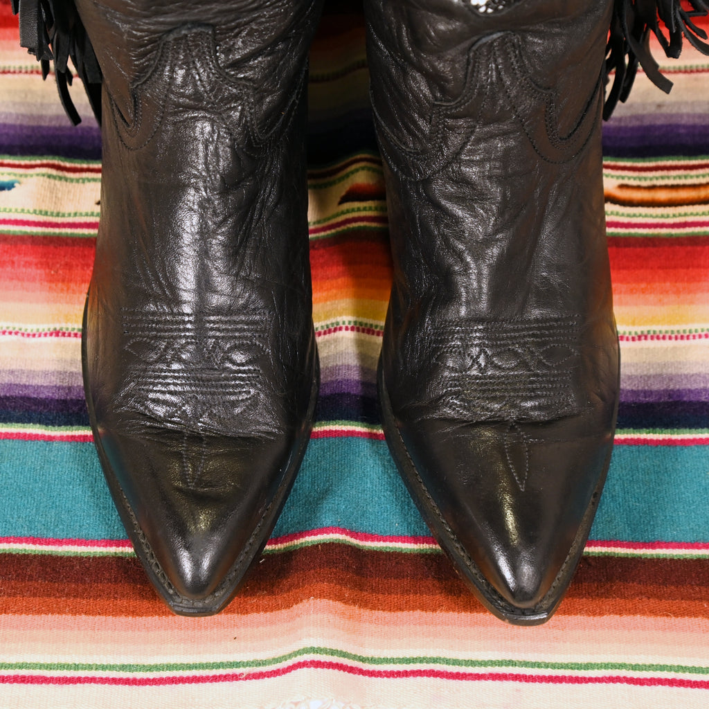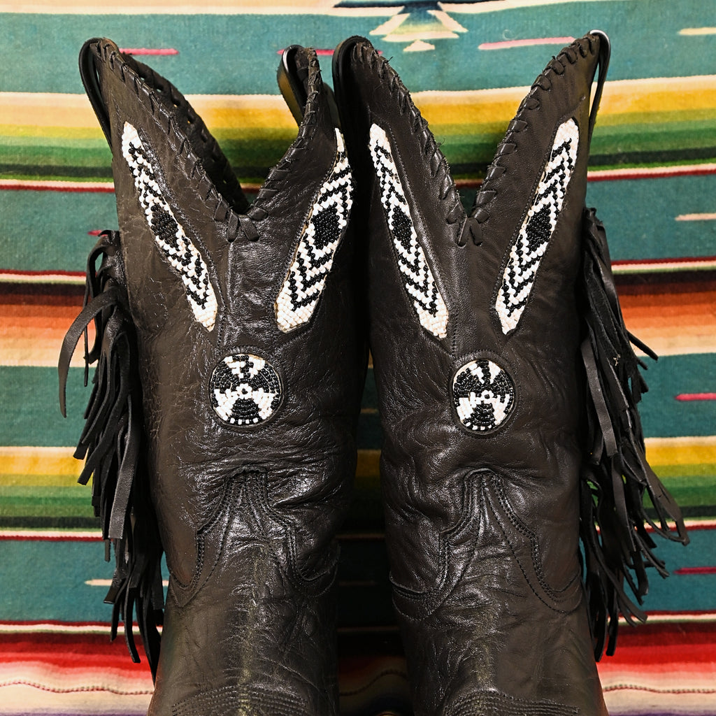 Black leather cowboy boots with fringe on one side and beaded accents on the front and back of the boots.