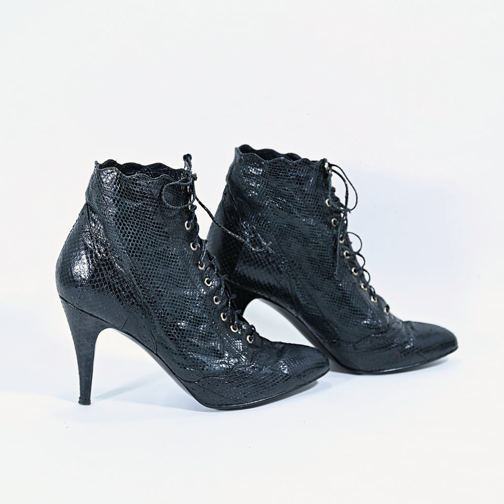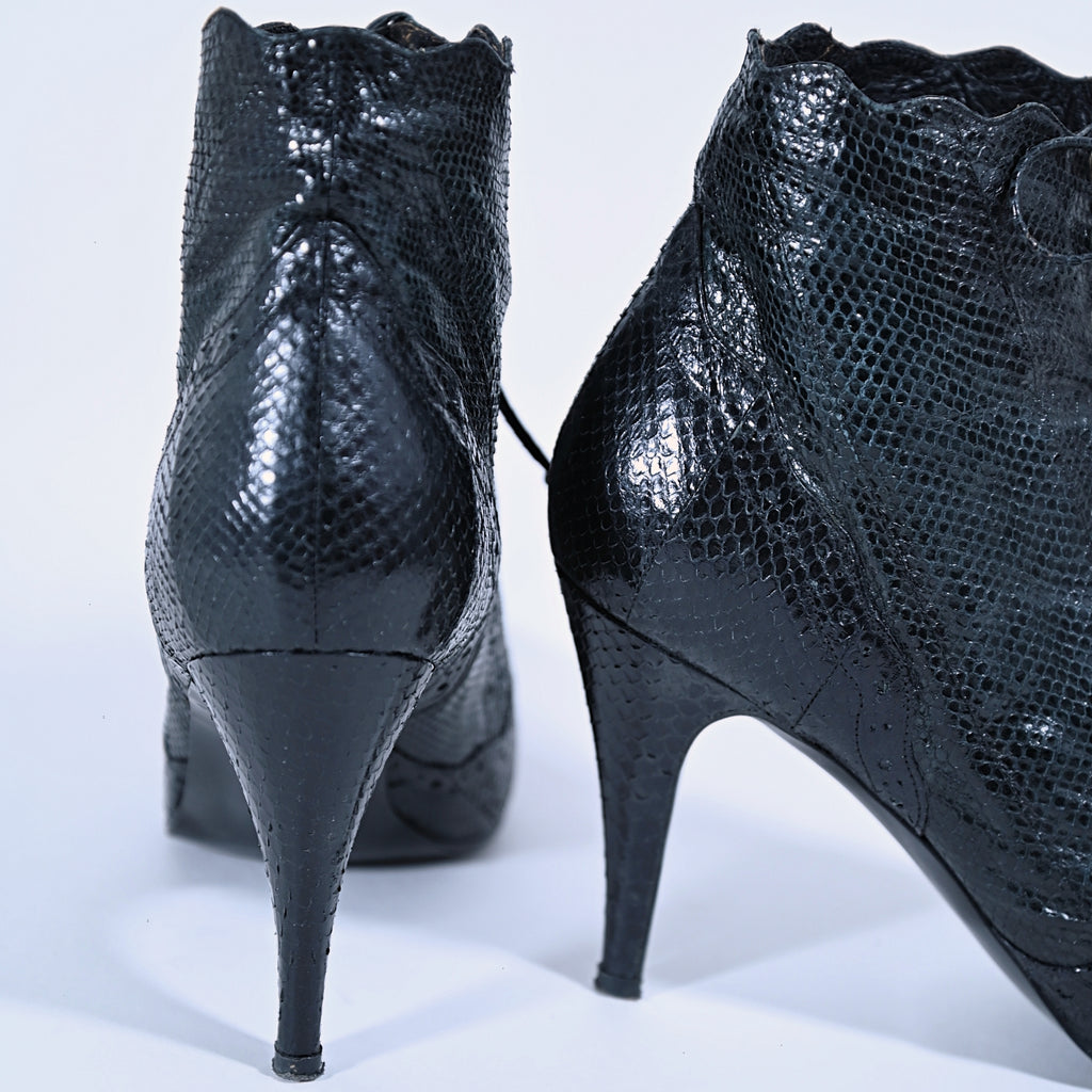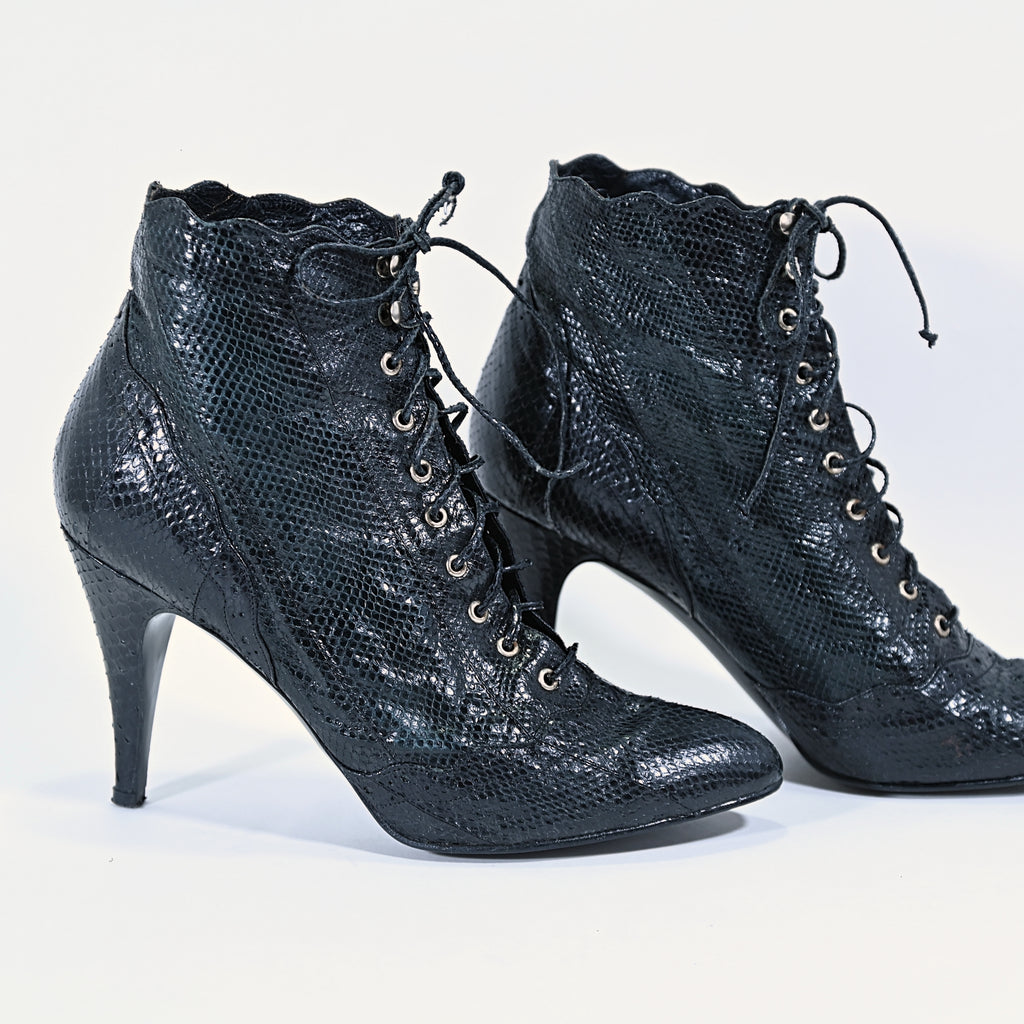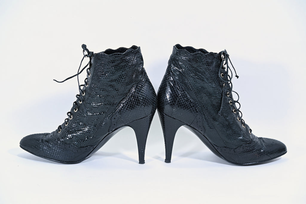 Vintage 80s black genuine snakeskin ankle boots.
