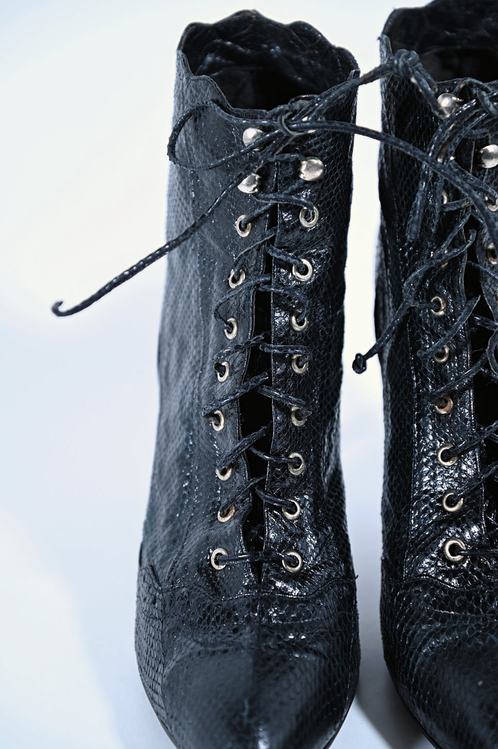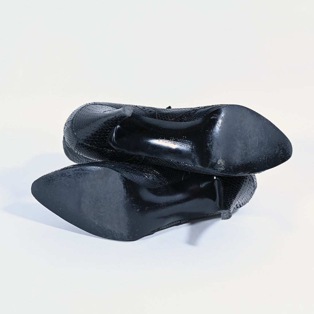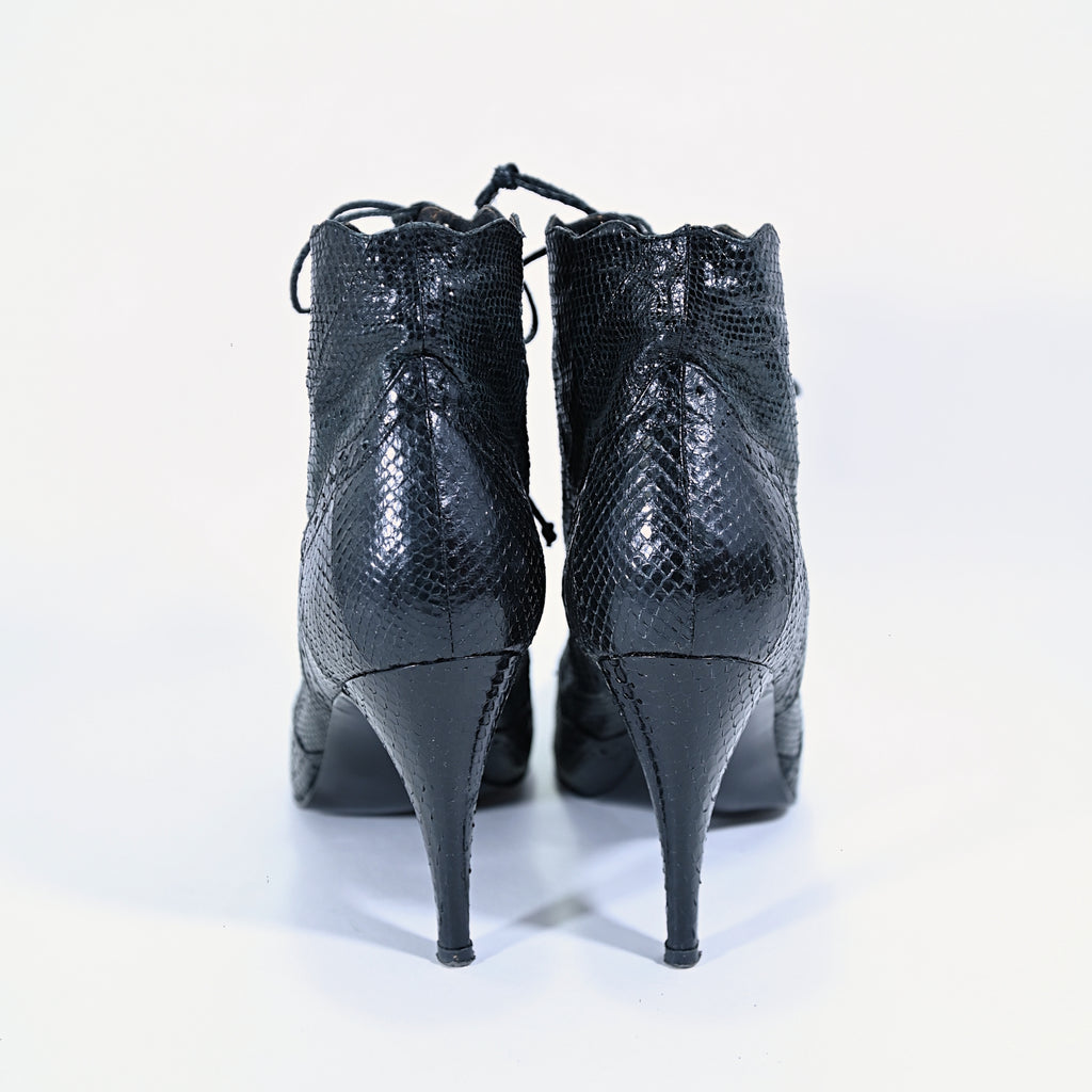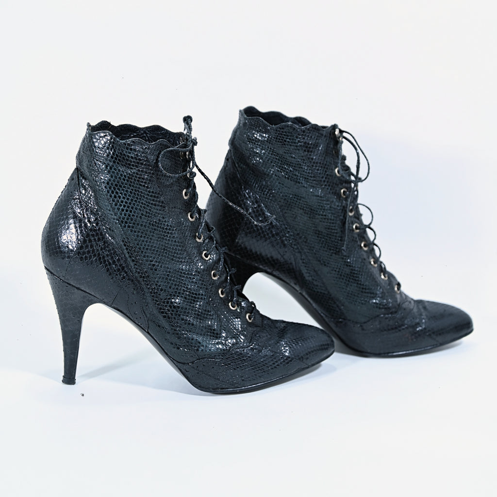 Vintage 80s black genuine snakeskin ankle boots.