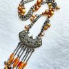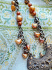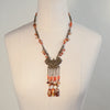 Vintage inspired necklace with bronze metal fittings, plastic beads in a Boho drop chandelier style.