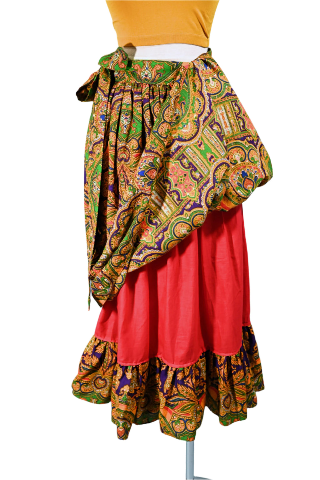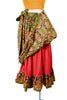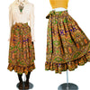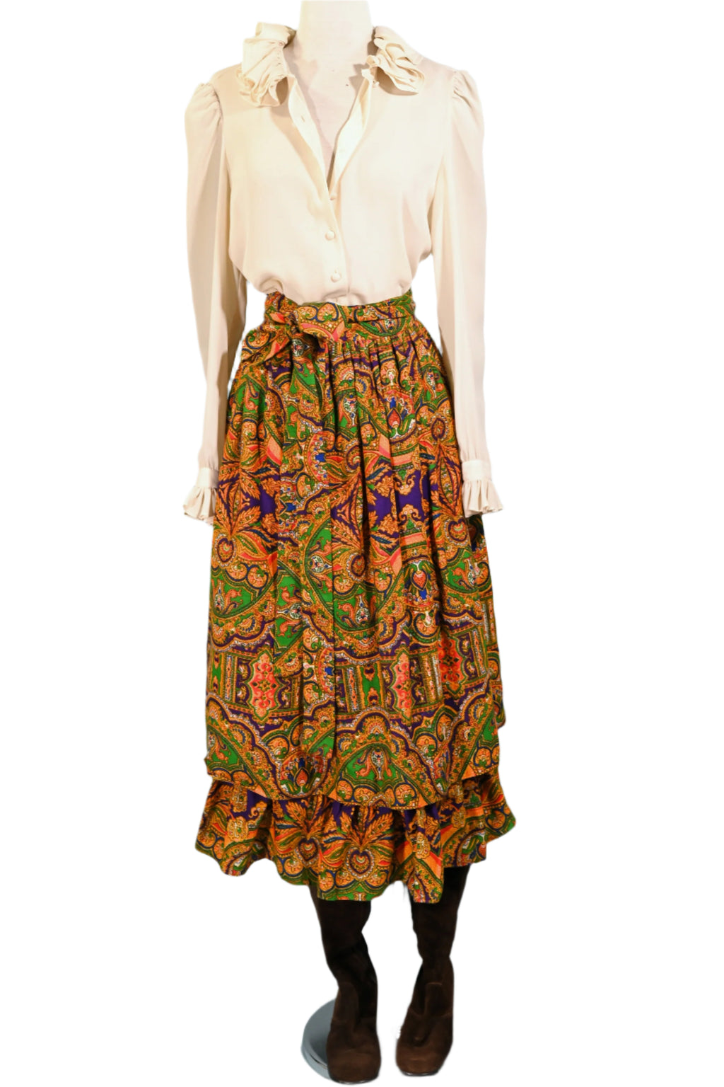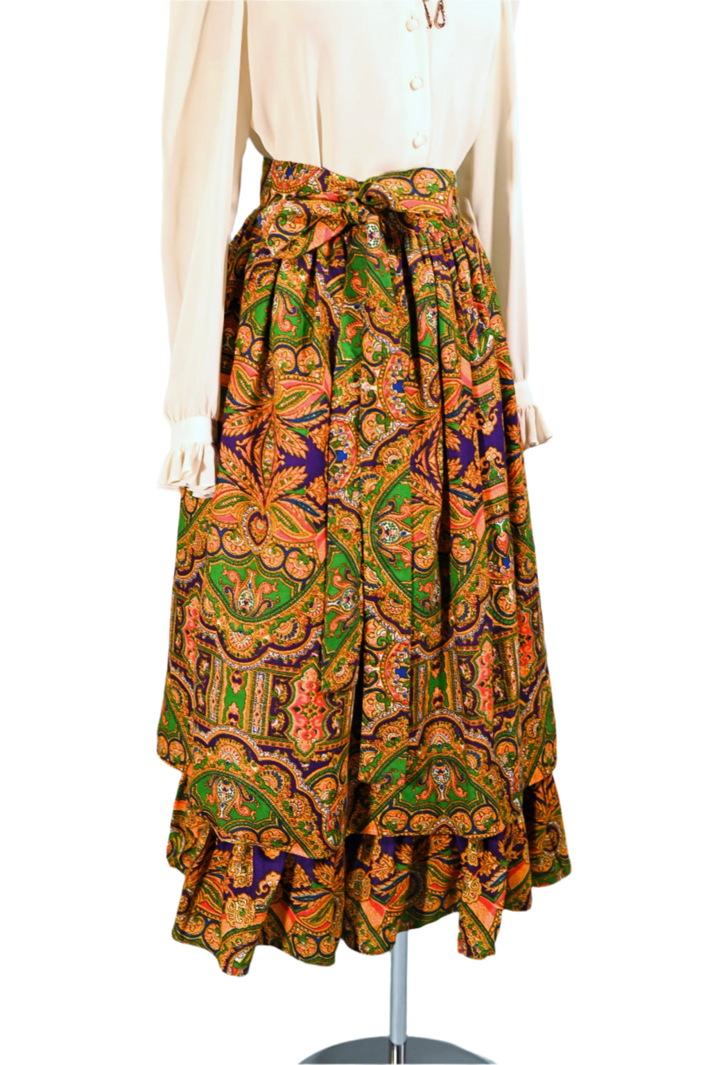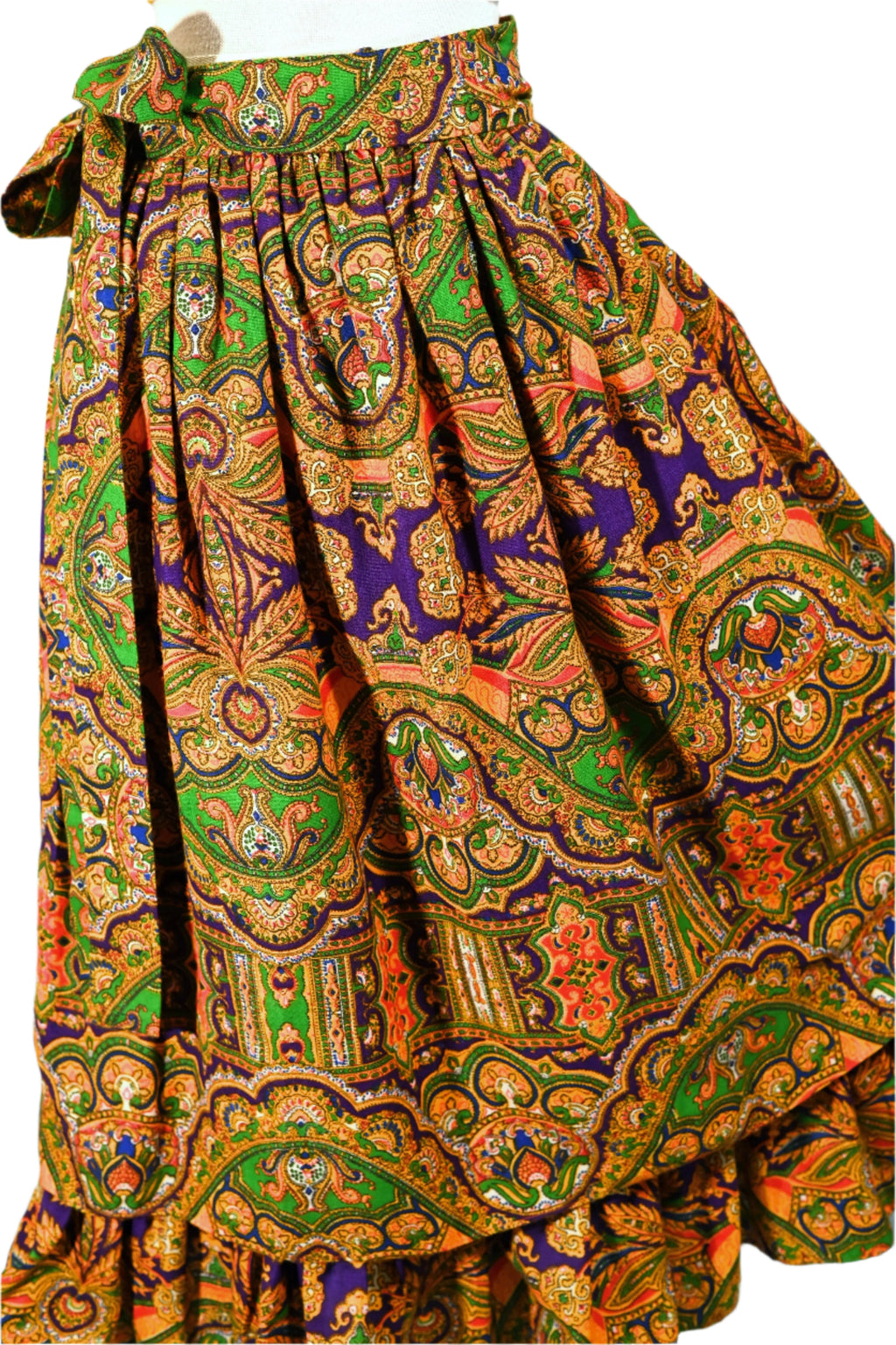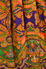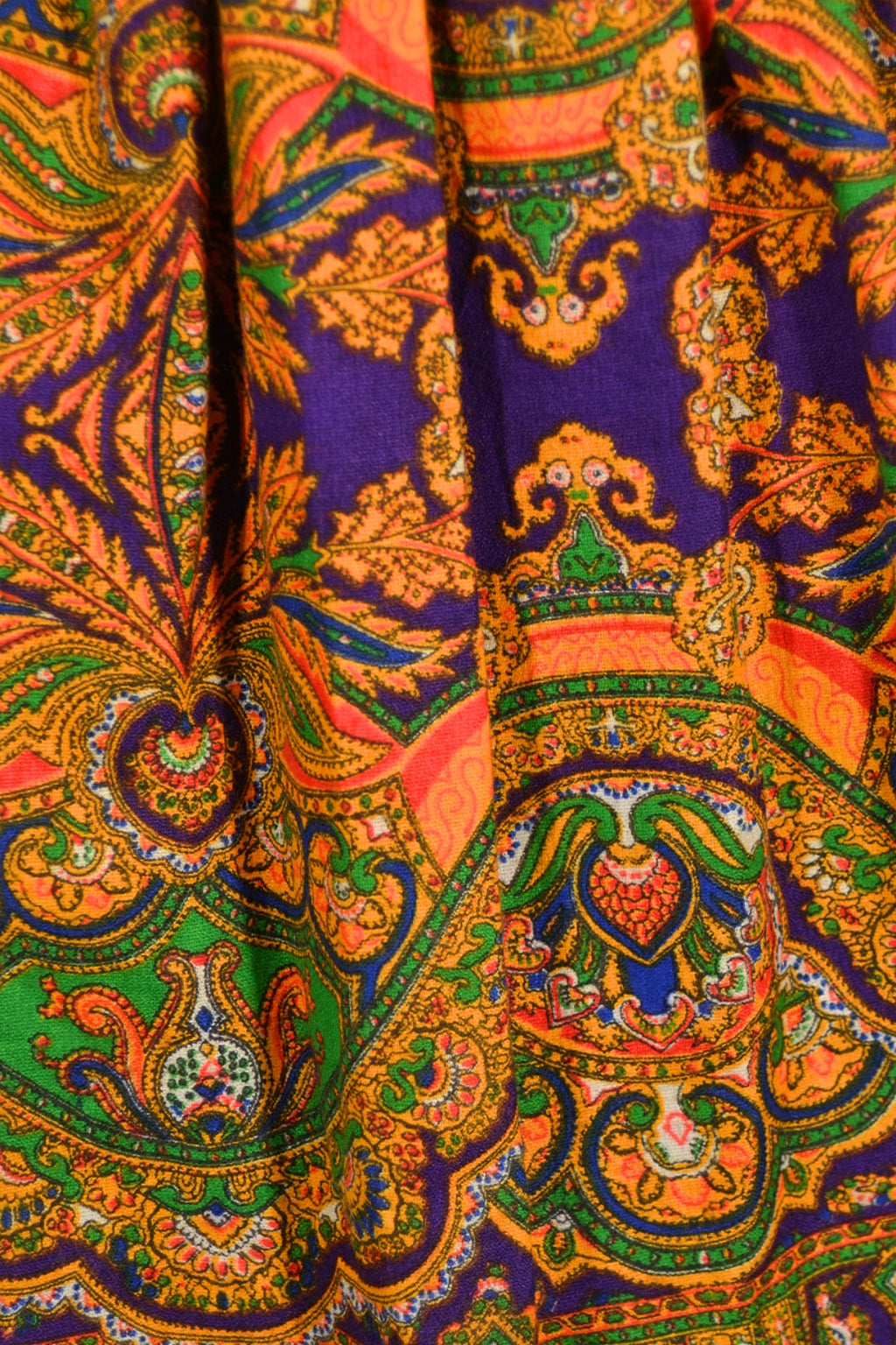 Multicolored - Gold, green, red, purple, black. Content not marked, feels like a lightweight wool challis, with Cotton lining.