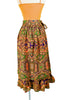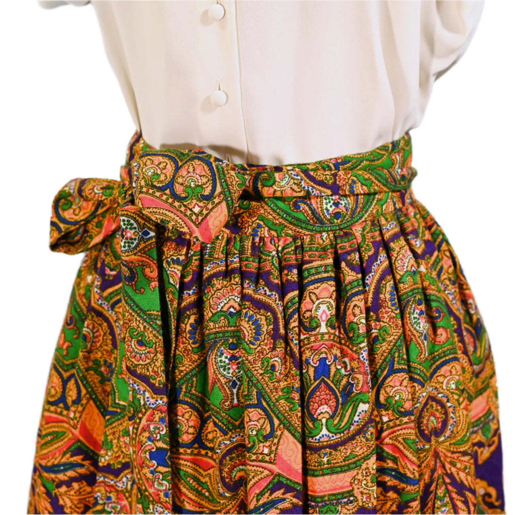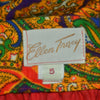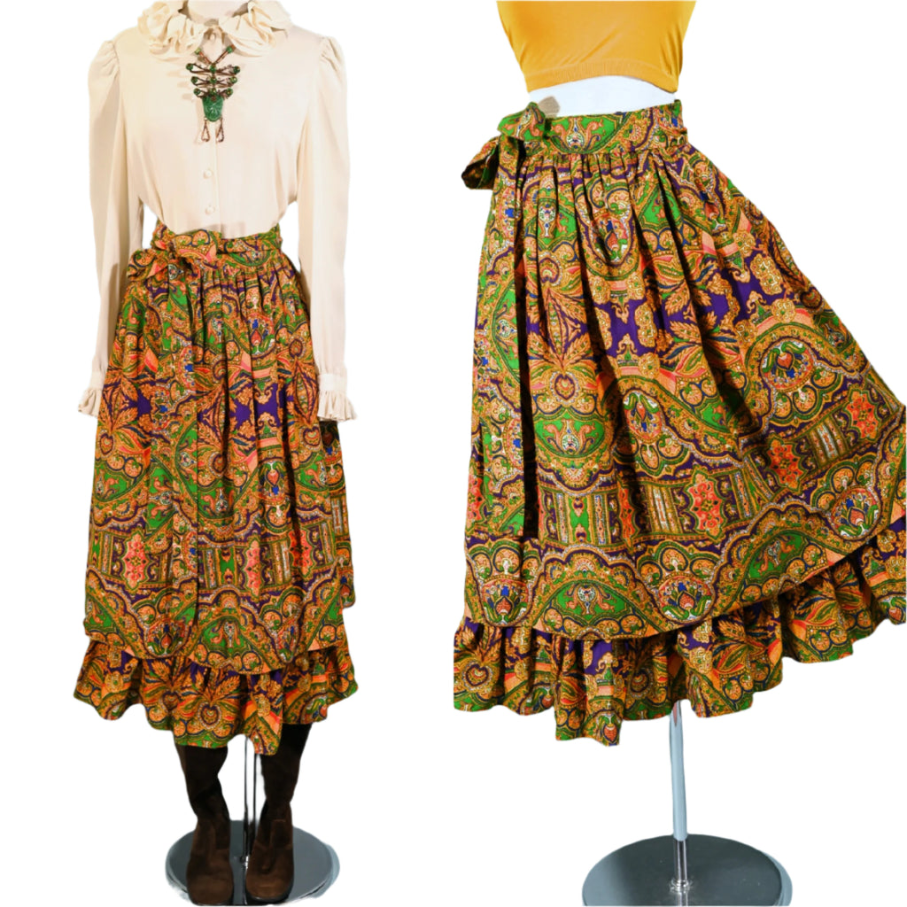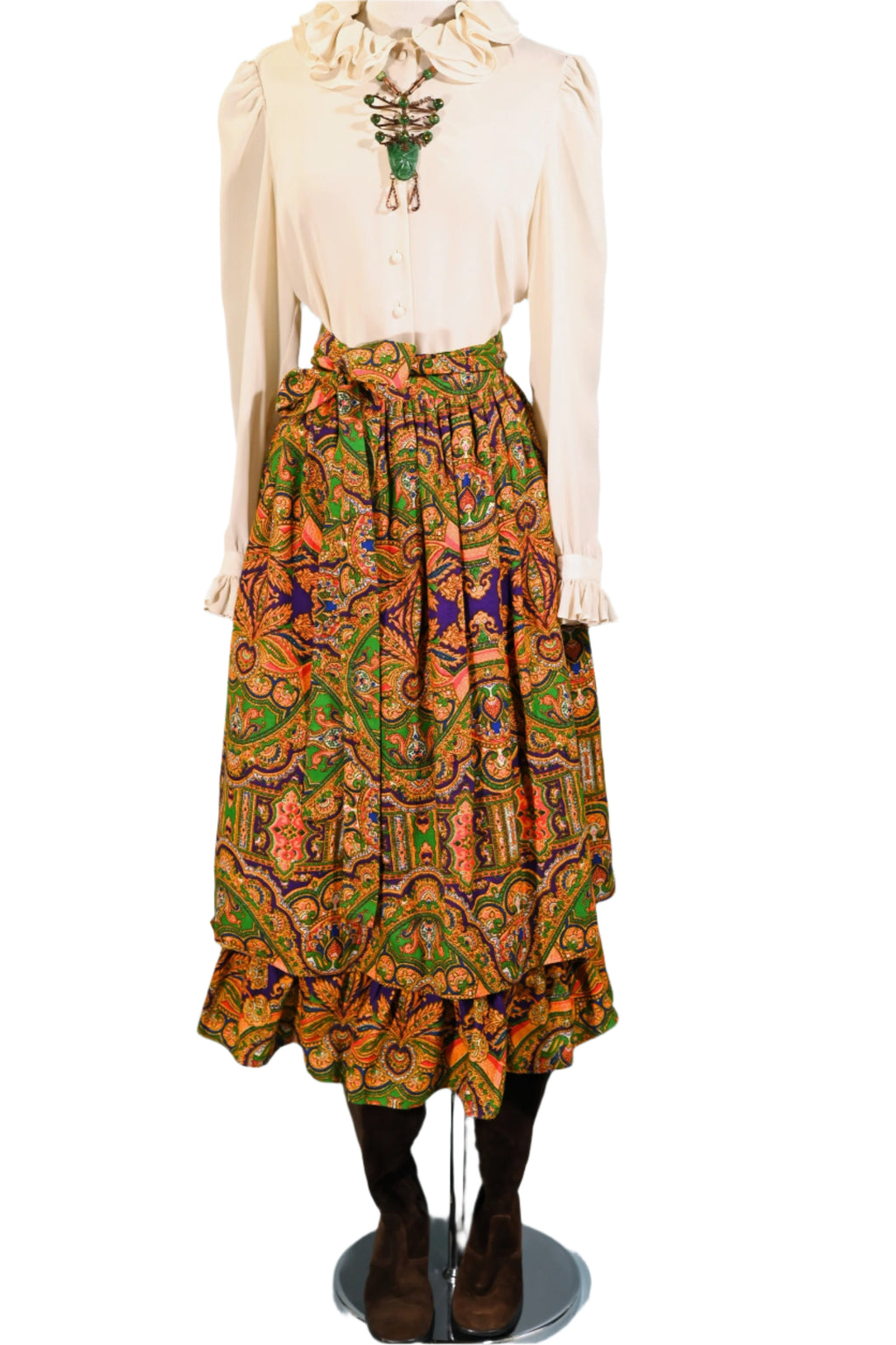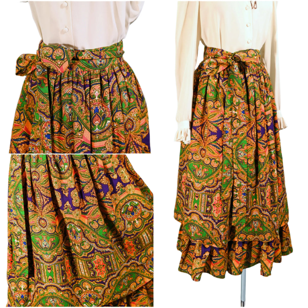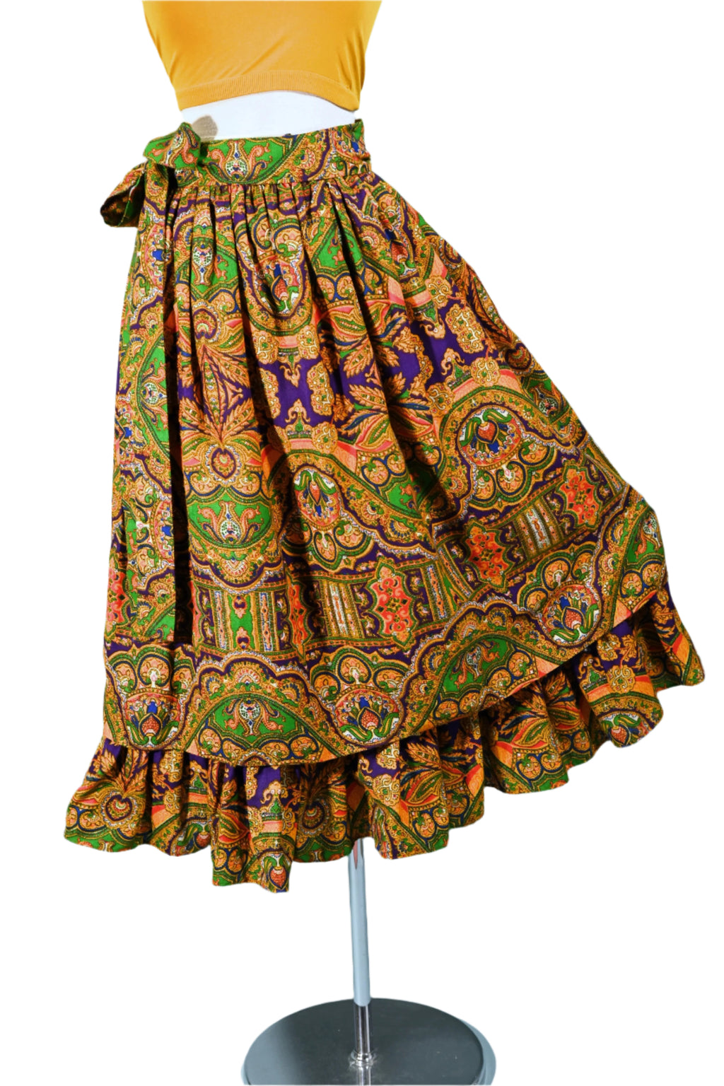 Multicolored - Gold, green, red, purple, black. Content not marked, feels like a lightweight wool challis, with Cotton lining.