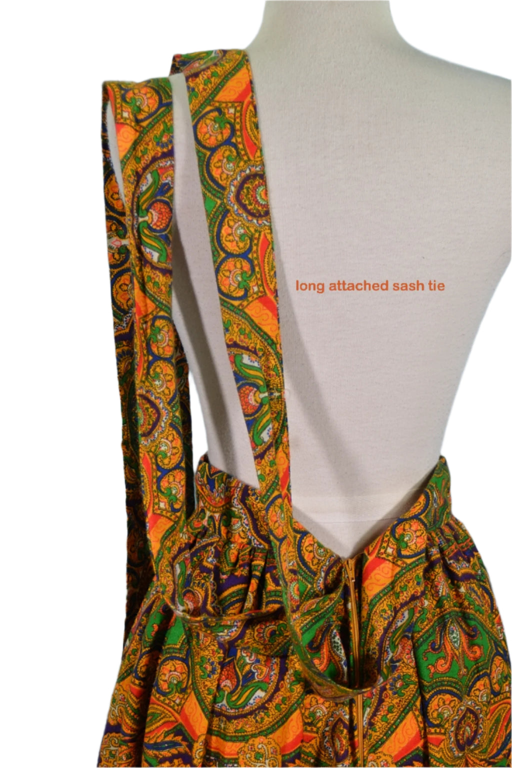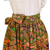 Fitted waist with an attached long sash tie belt. The skirt is gathered below the waistband.
