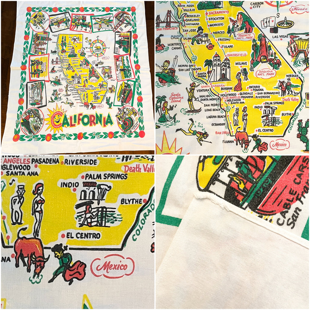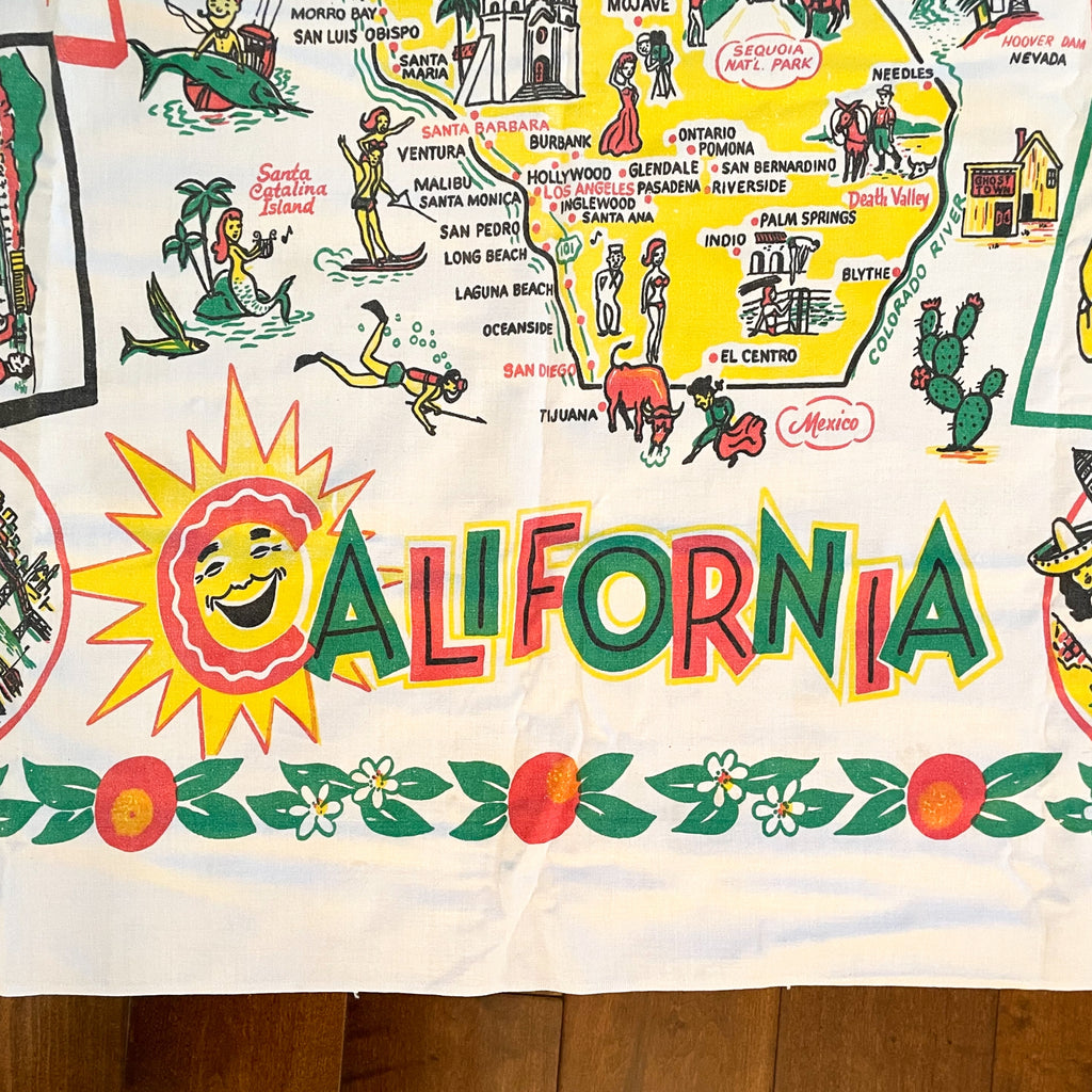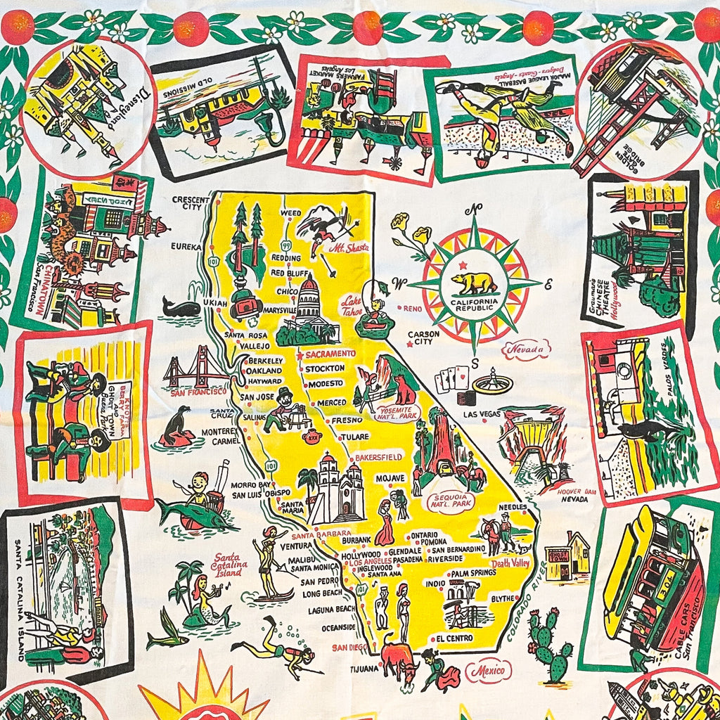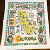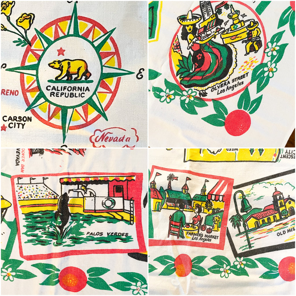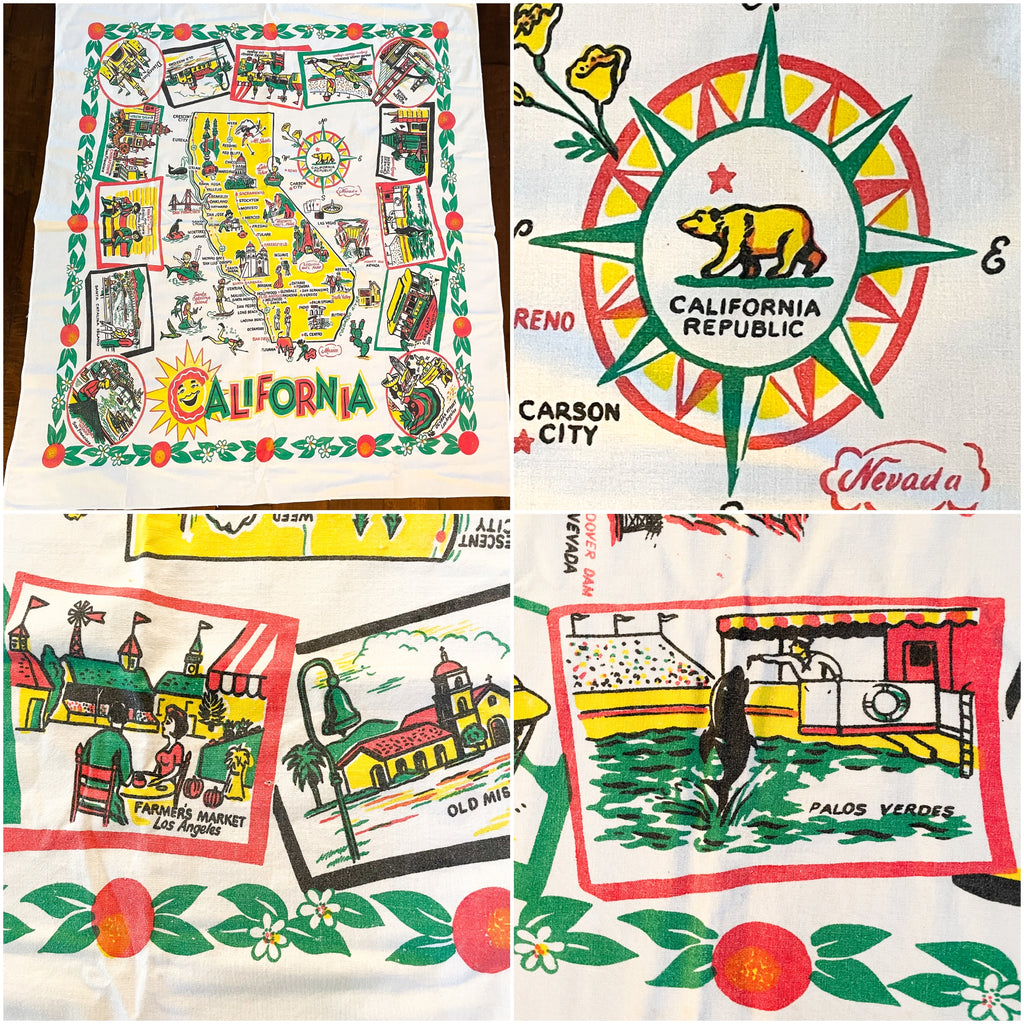 Vintage California souvenir tablecloth map with tourist highlights and cities. Fun graphics.