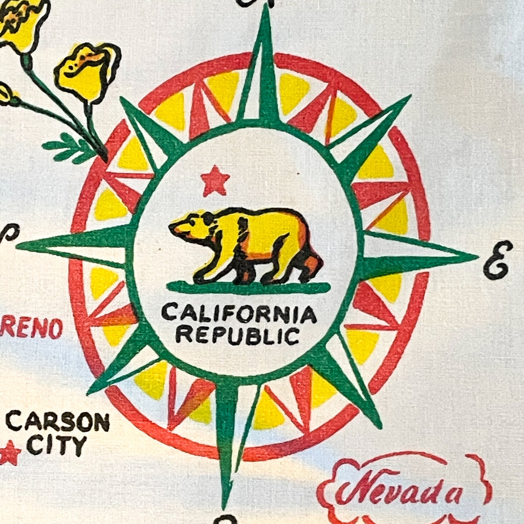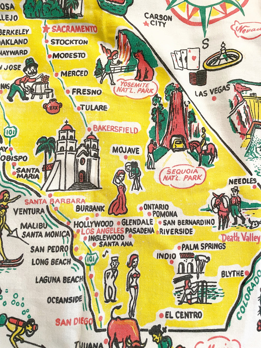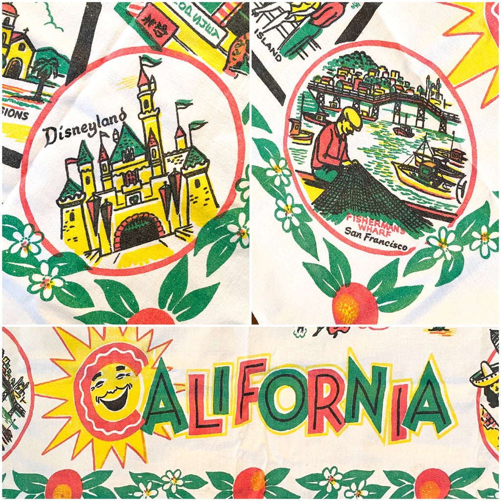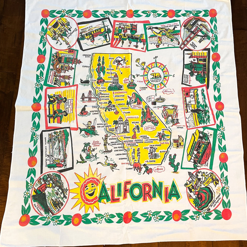 Vintage California souvenir tablecloth map with tourist highlights and cities. Fun graphics.