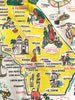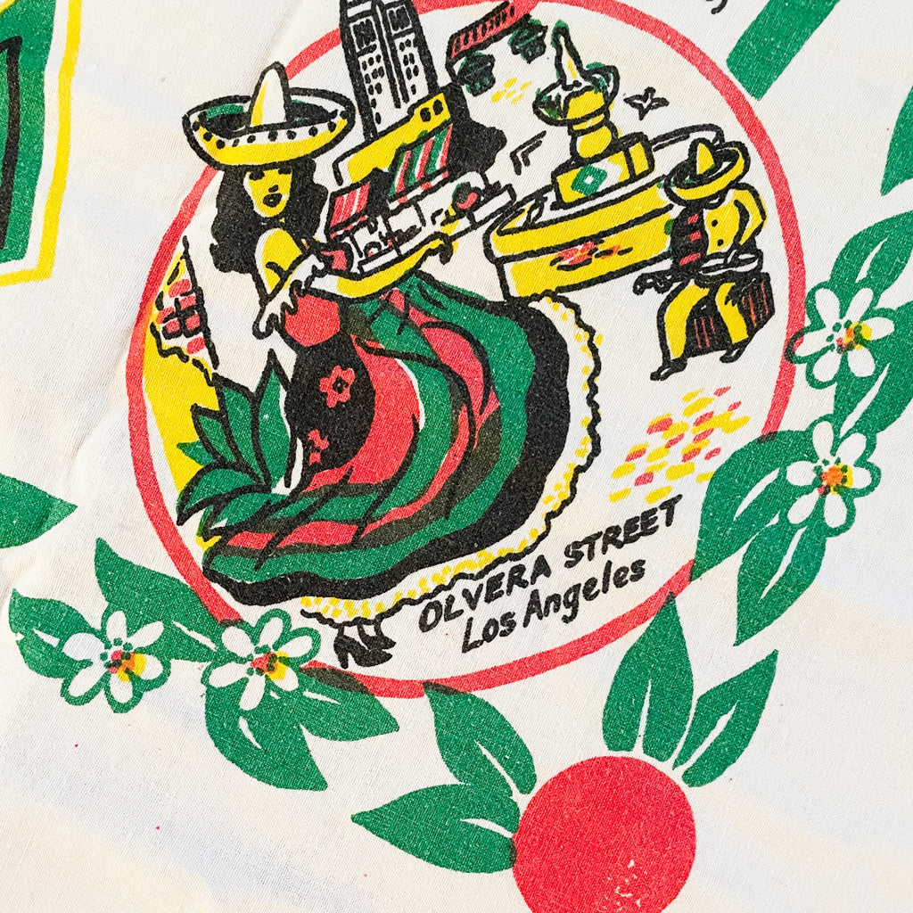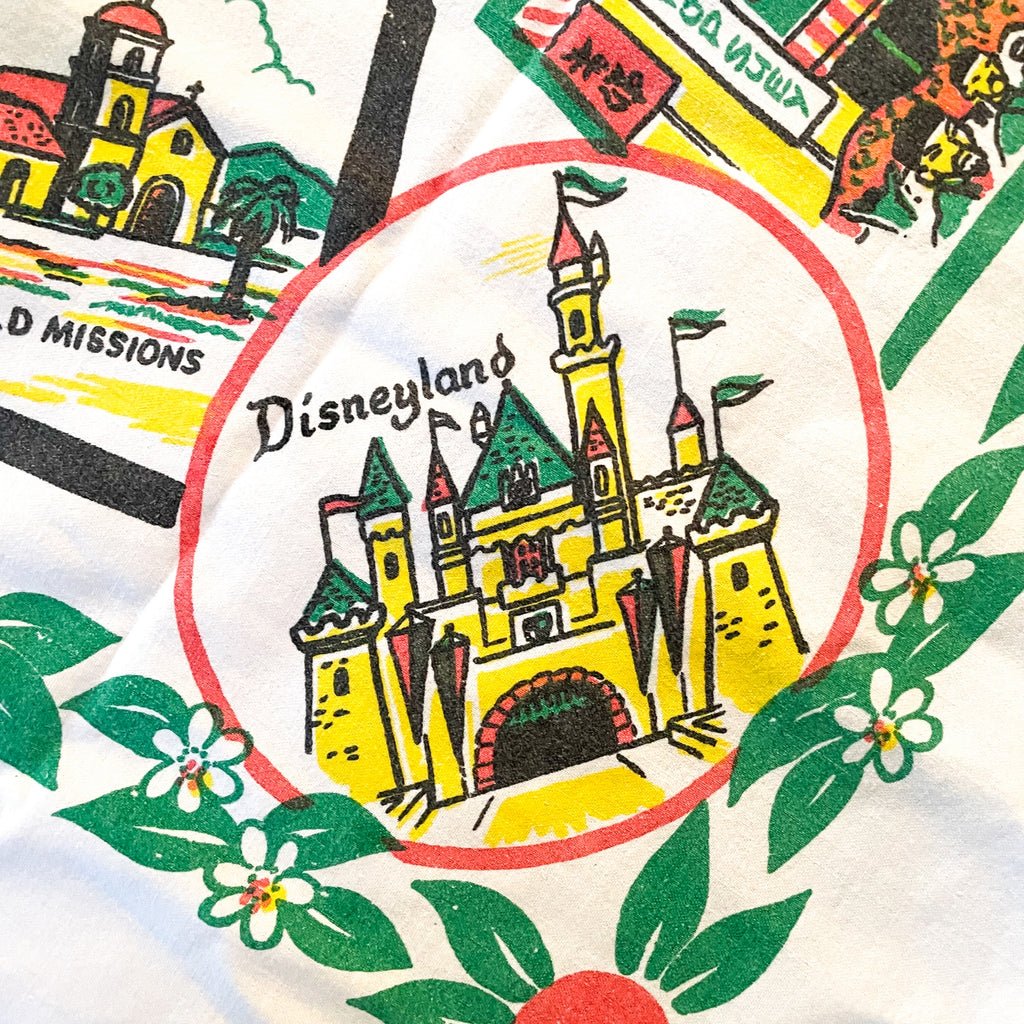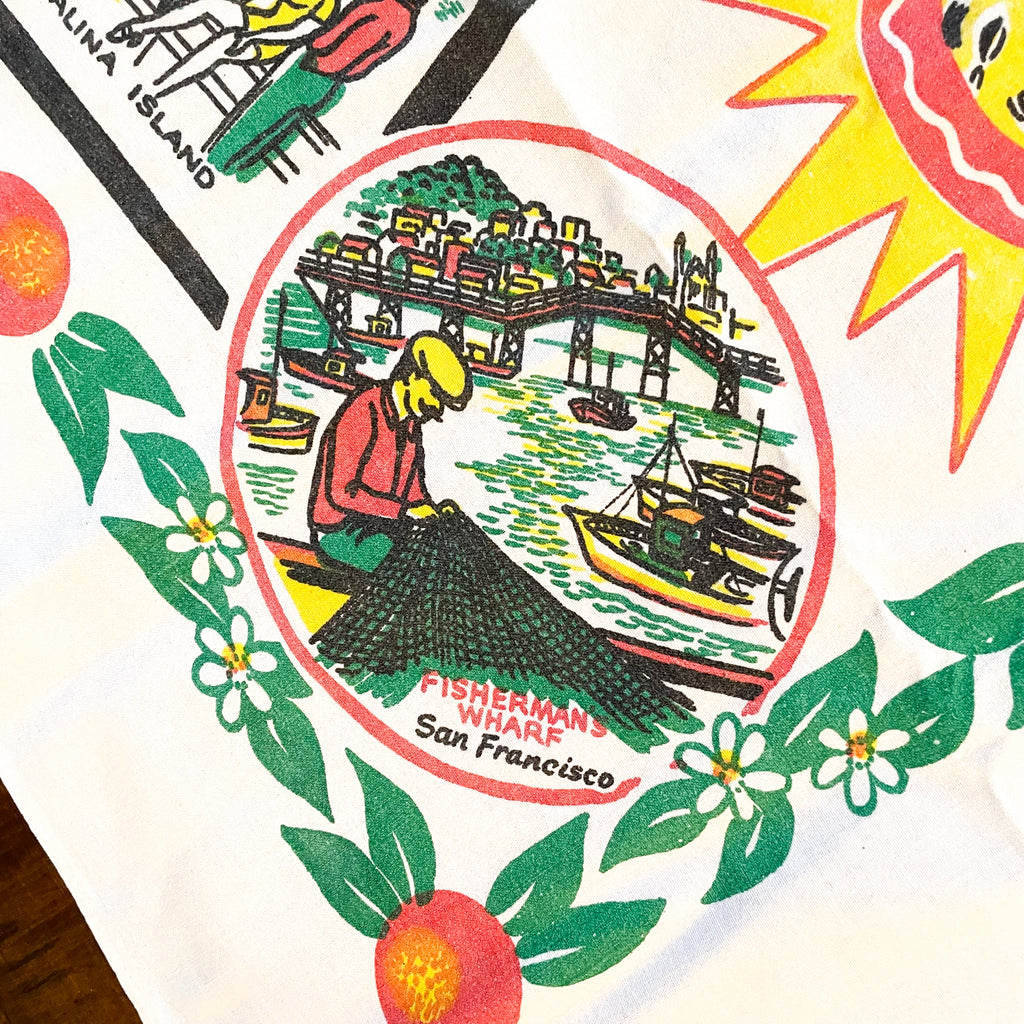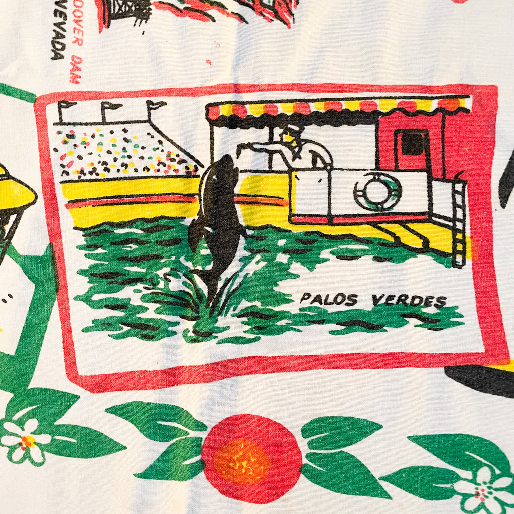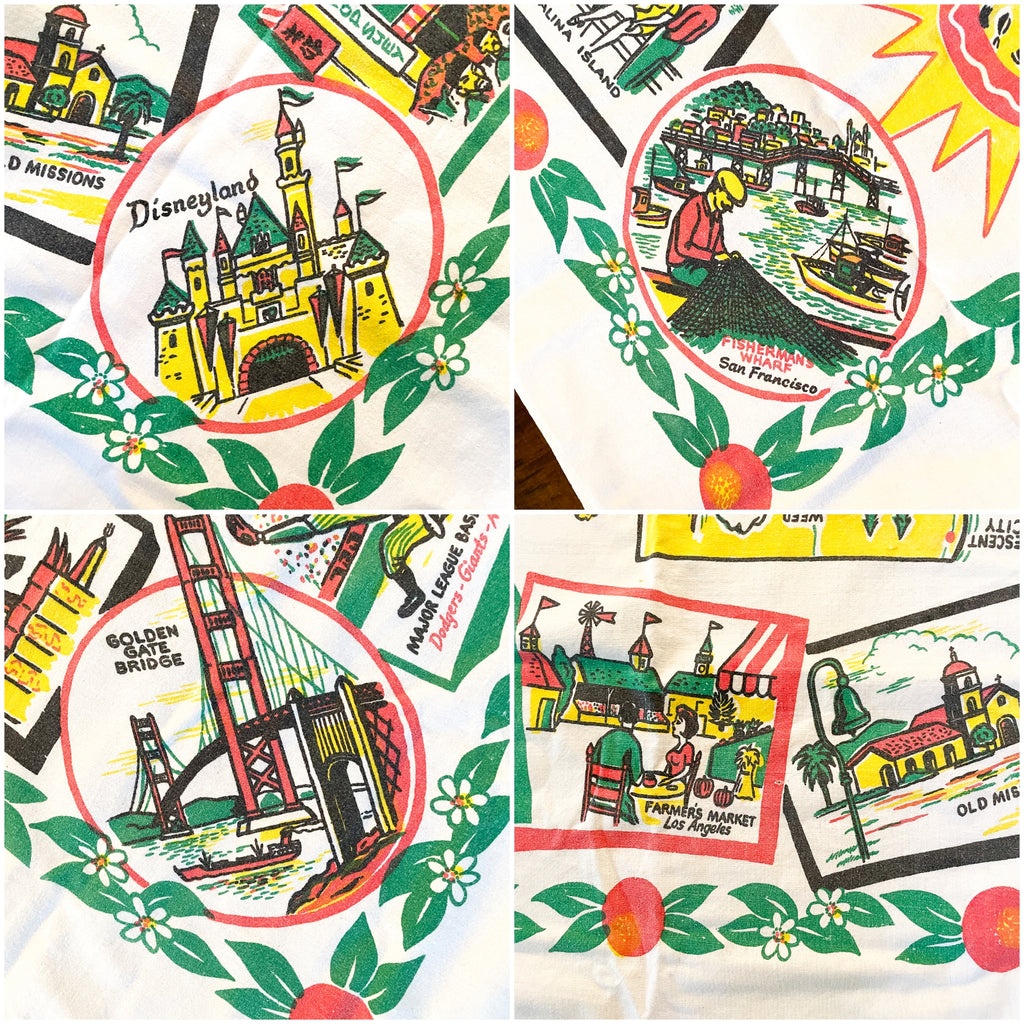 Vintage California souvenir tablecloth map with tourist highlights and cities. Fun graphics.