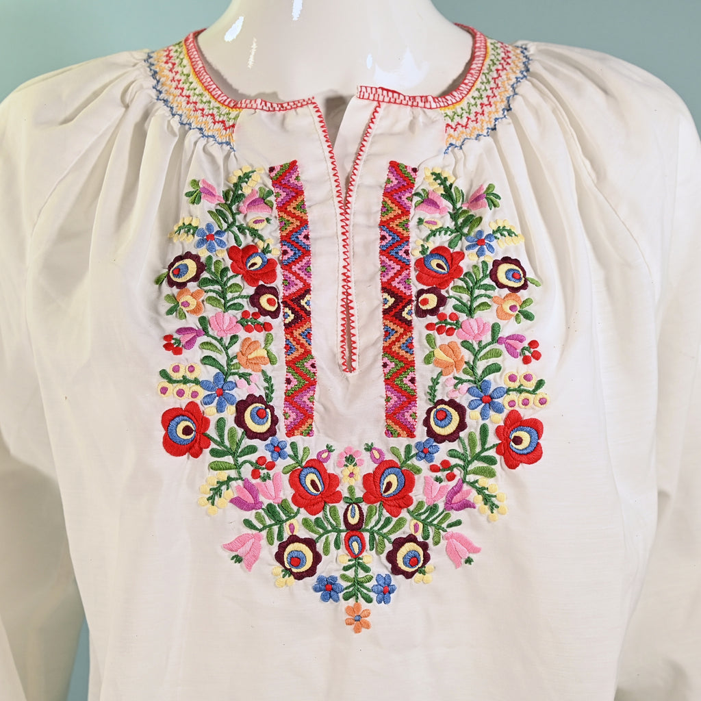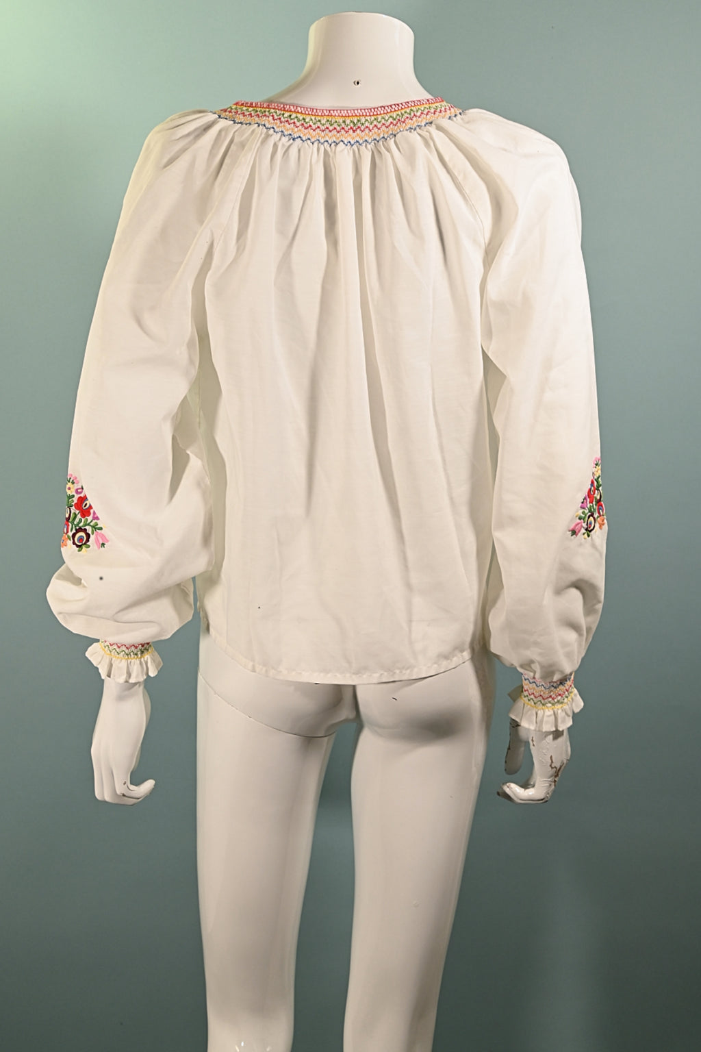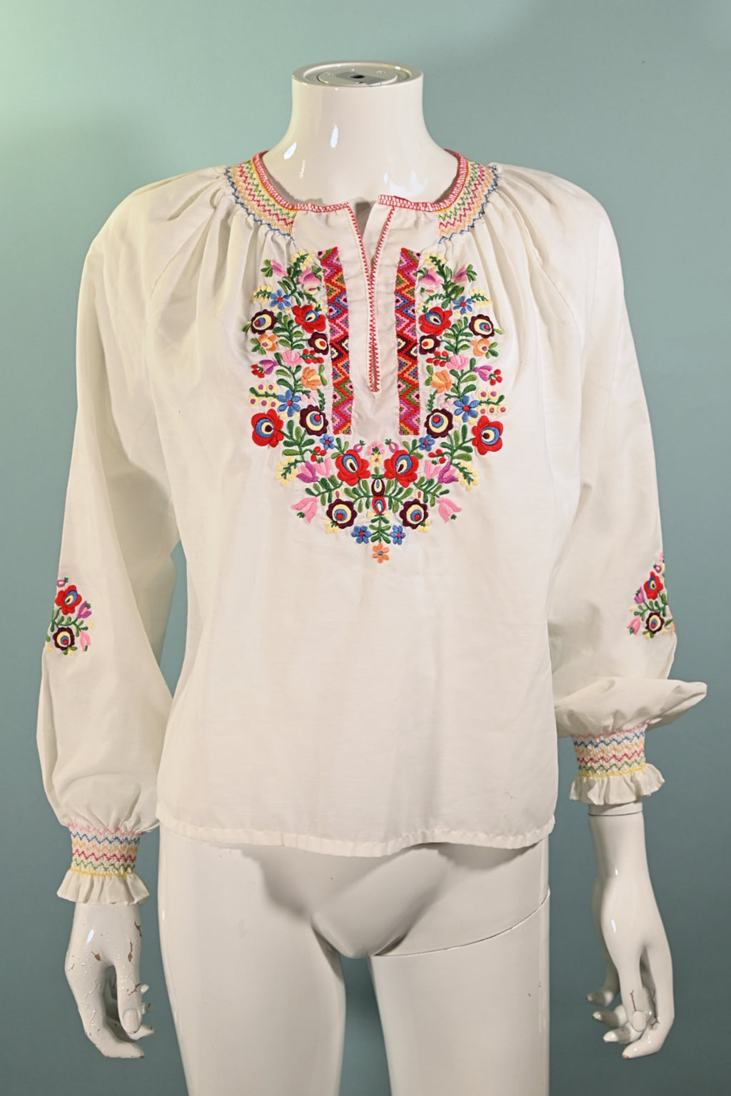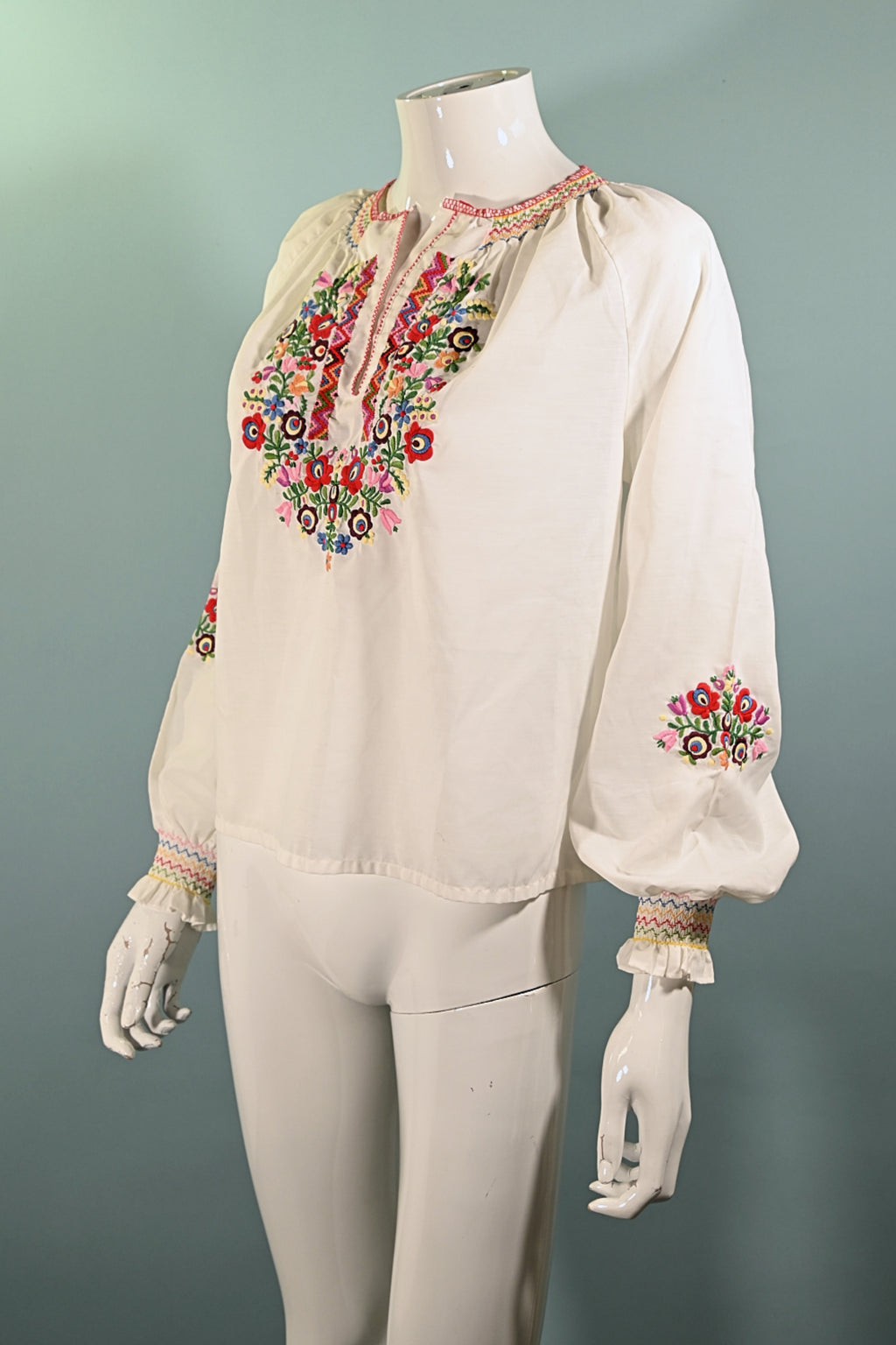 Vintage white embroidered peasant blouse in the style of vintage Hungarian tops.