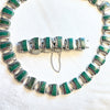 This is a matching set. The necklace is joined by a link on the top with a box closure.