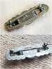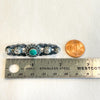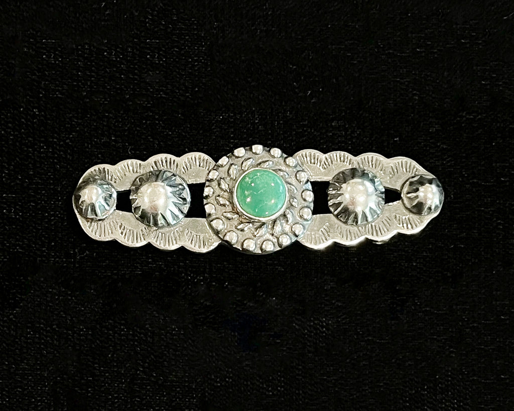 Stamped scalloped edges, raised button and circle medallion in the center with a greenish turquoise stone.