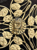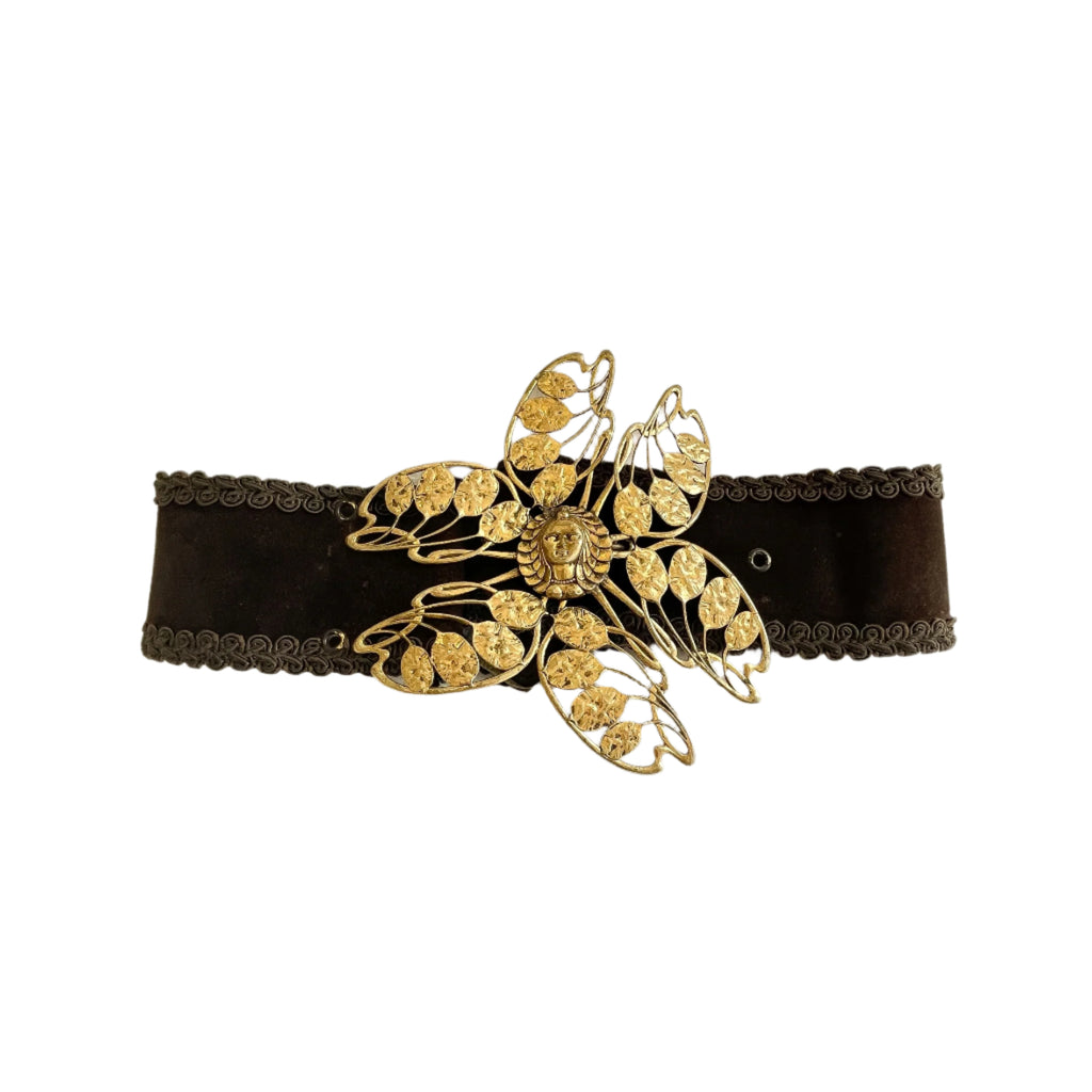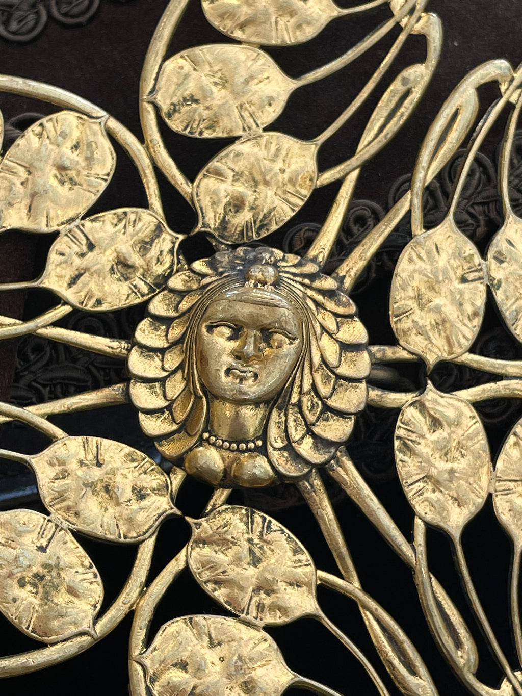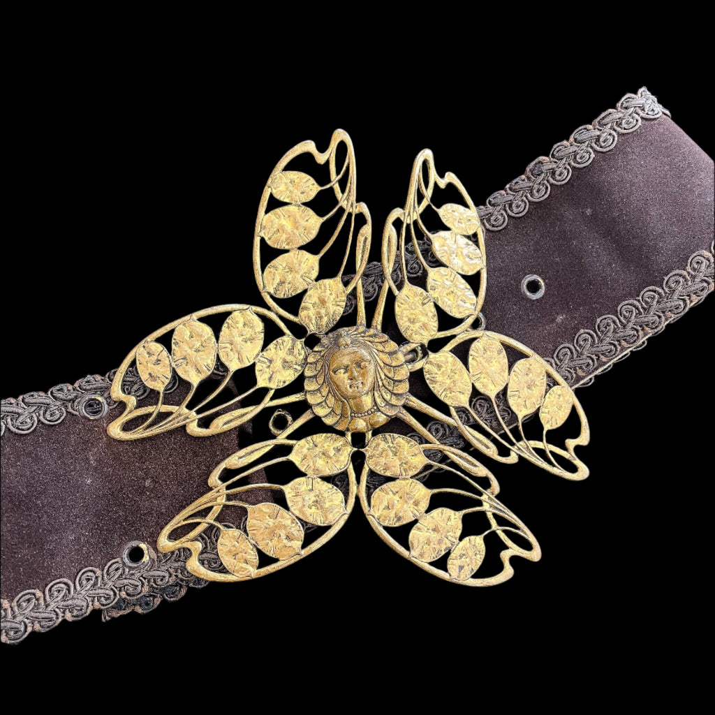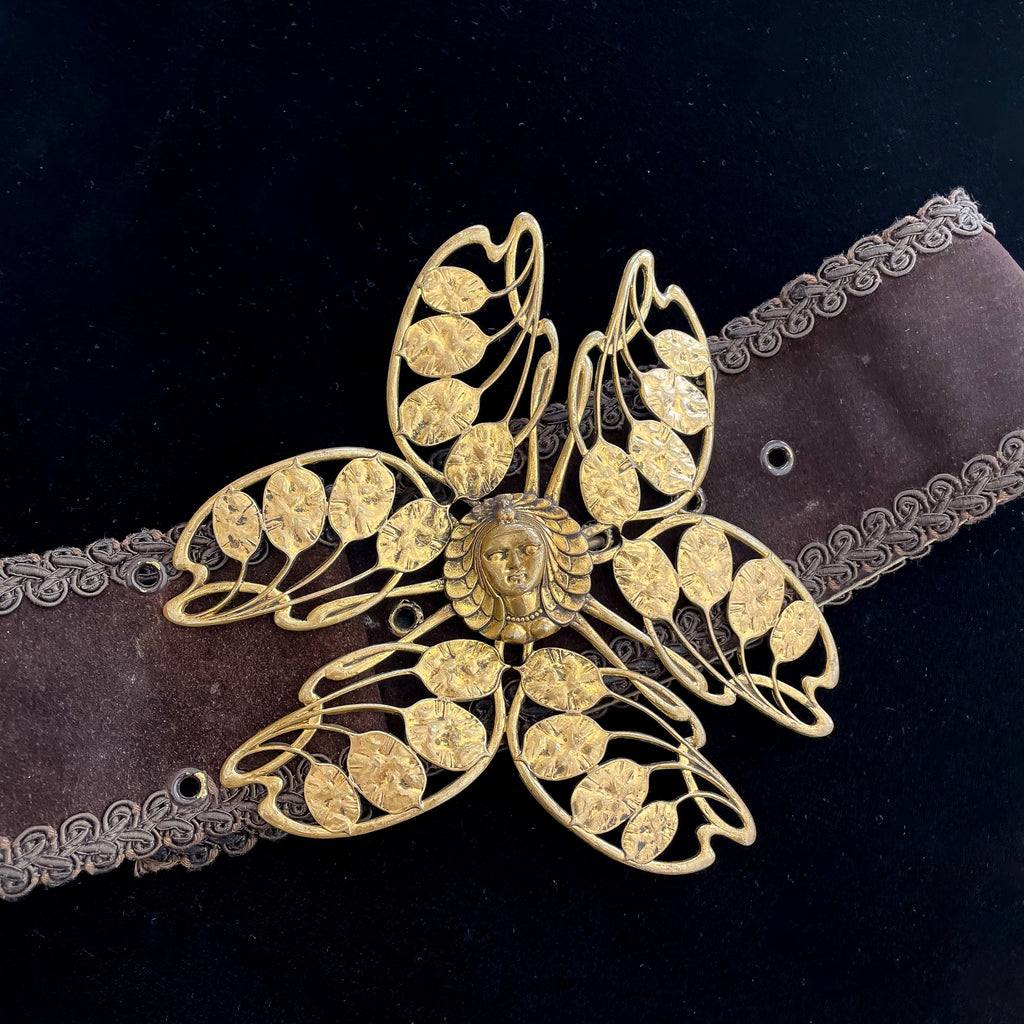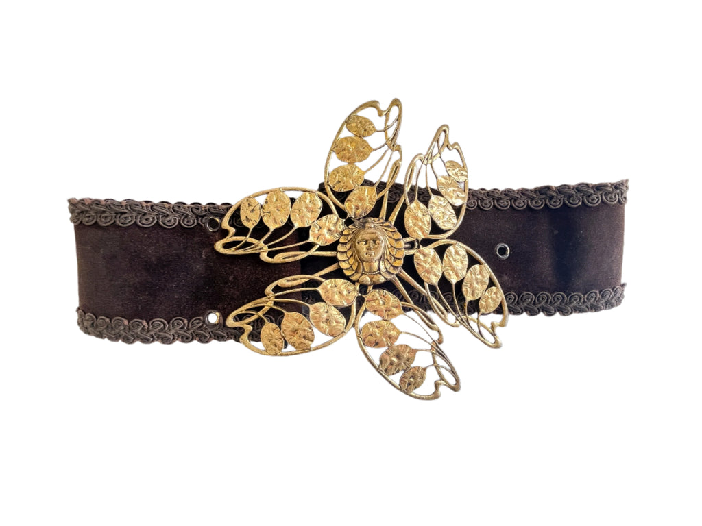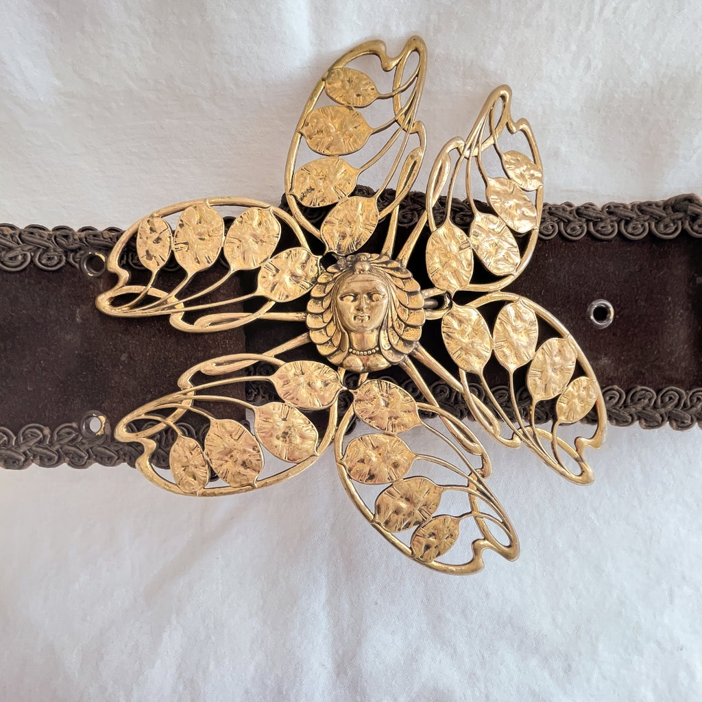 Goddess face on a swirly floral belt buckle, very large. Hook closure.