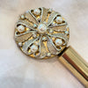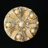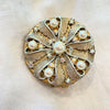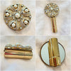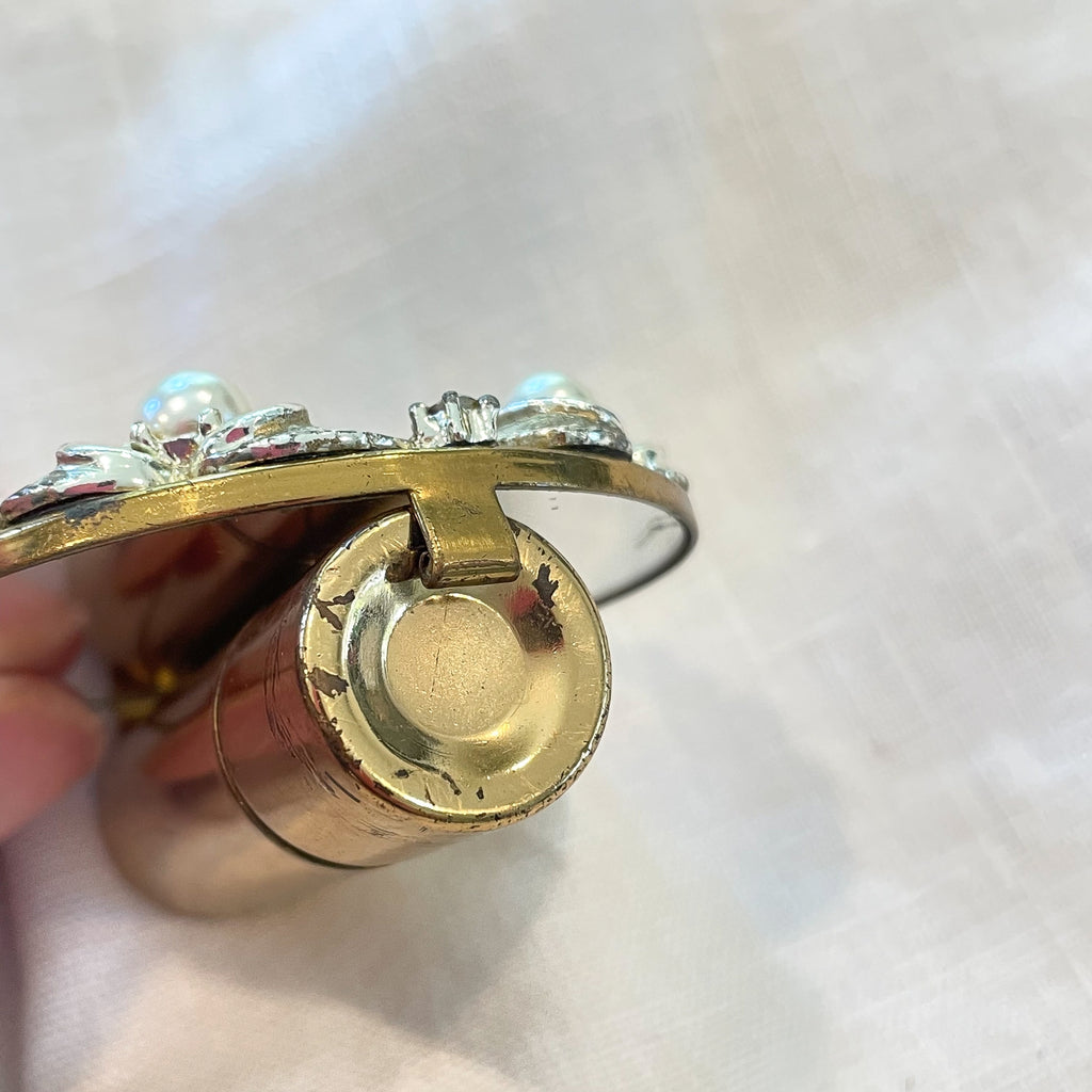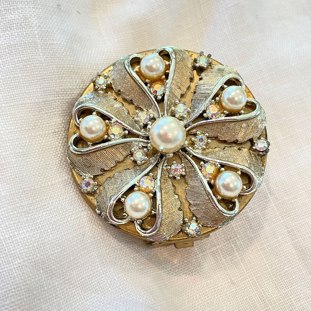 Fansy gold tone with Aurora Borealis rhinestones, faux pearls, raised leaf details on a compact mirror.