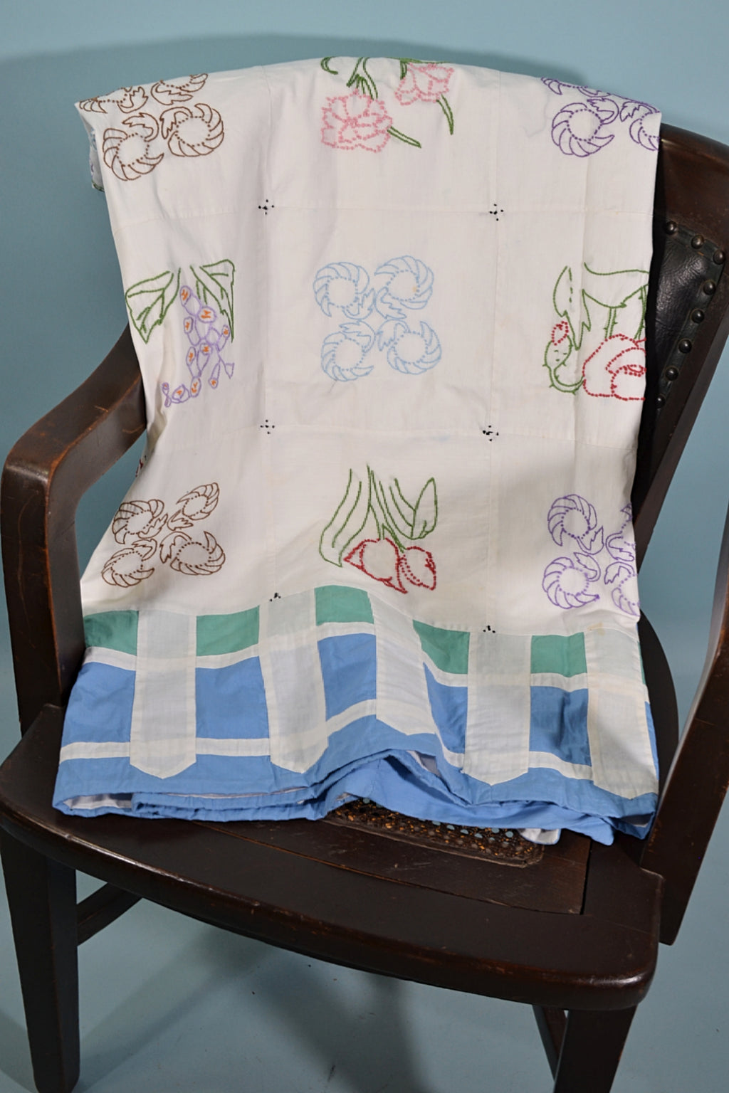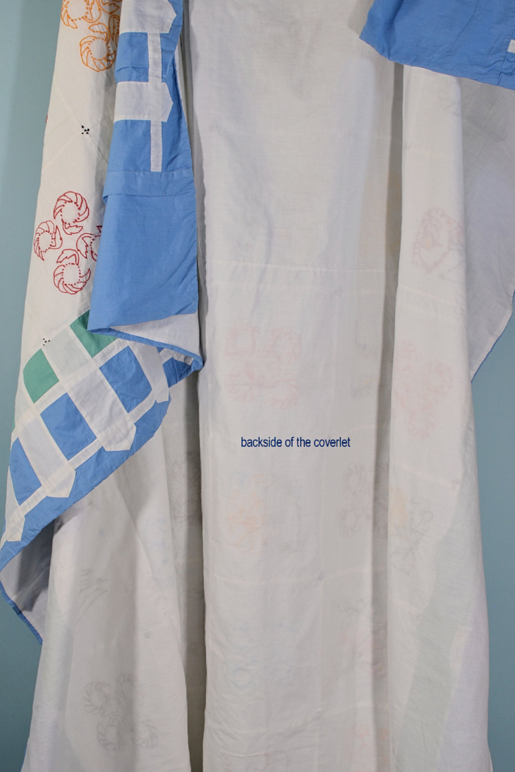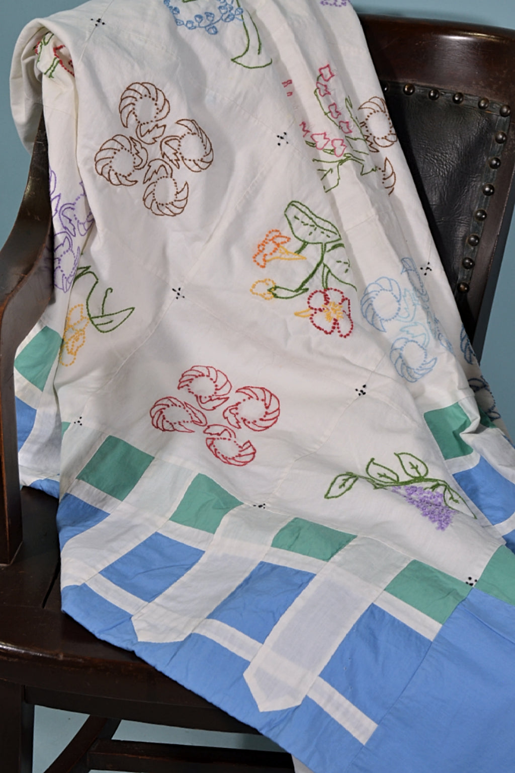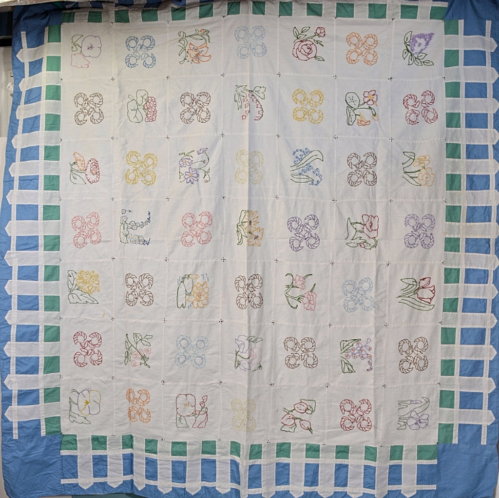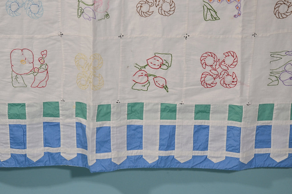 This is a lovely handmade lightweight coverlet with 49 hand embroidered flower patches. The border has a charming picket fence detail.