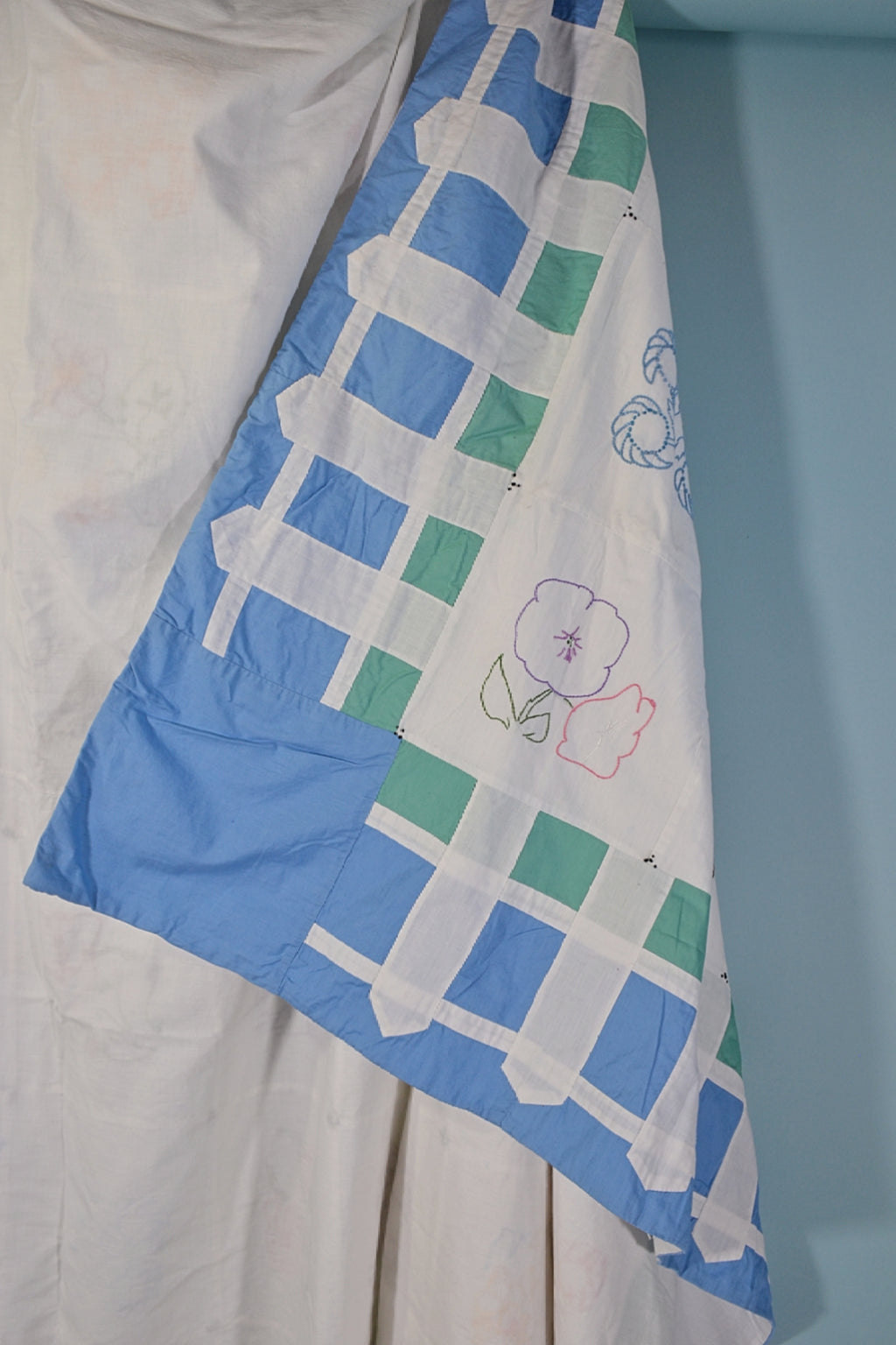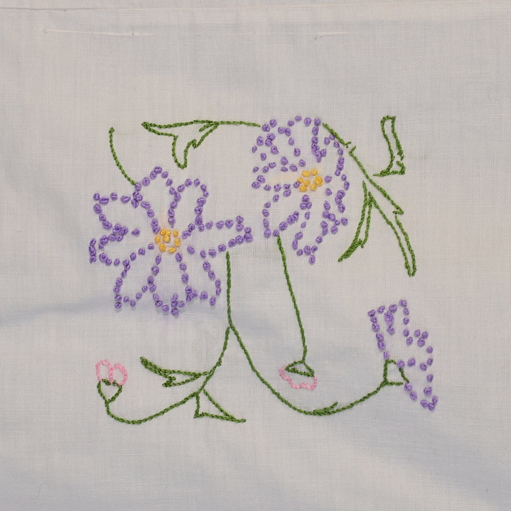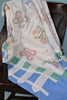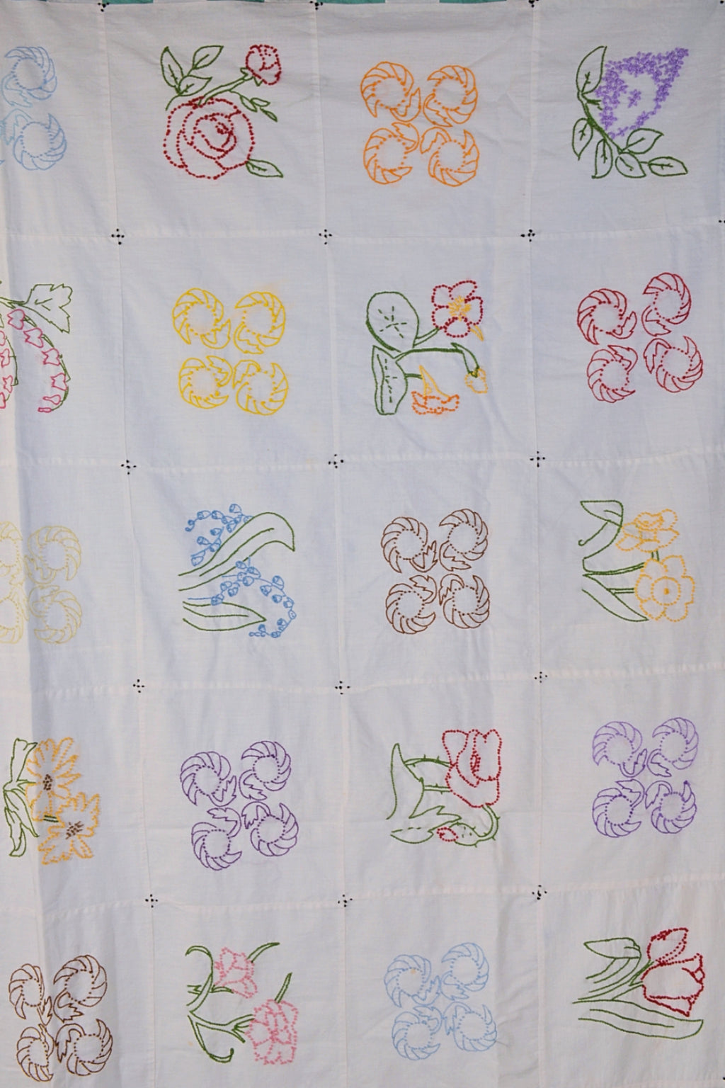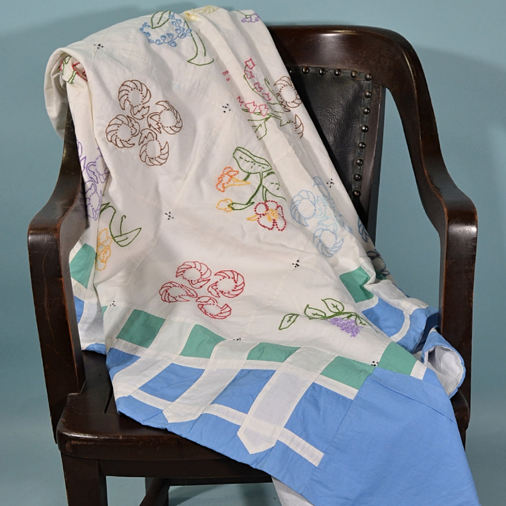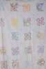 Vintage Hand Made Coverlet Embroidered Flower Squares, Lightweight Cottagecore Quilt 75 1/2" x 70"