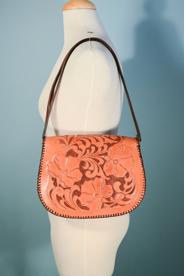 Vintage Hand Tooled Leather Handbag, Western Whip Stitched Purse