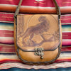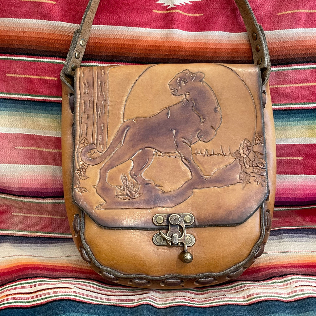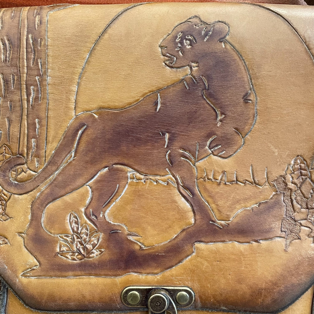 This is a fabulous handmade hand-tooled leather shoulder bag with a wild cat, mountain lion on the front.