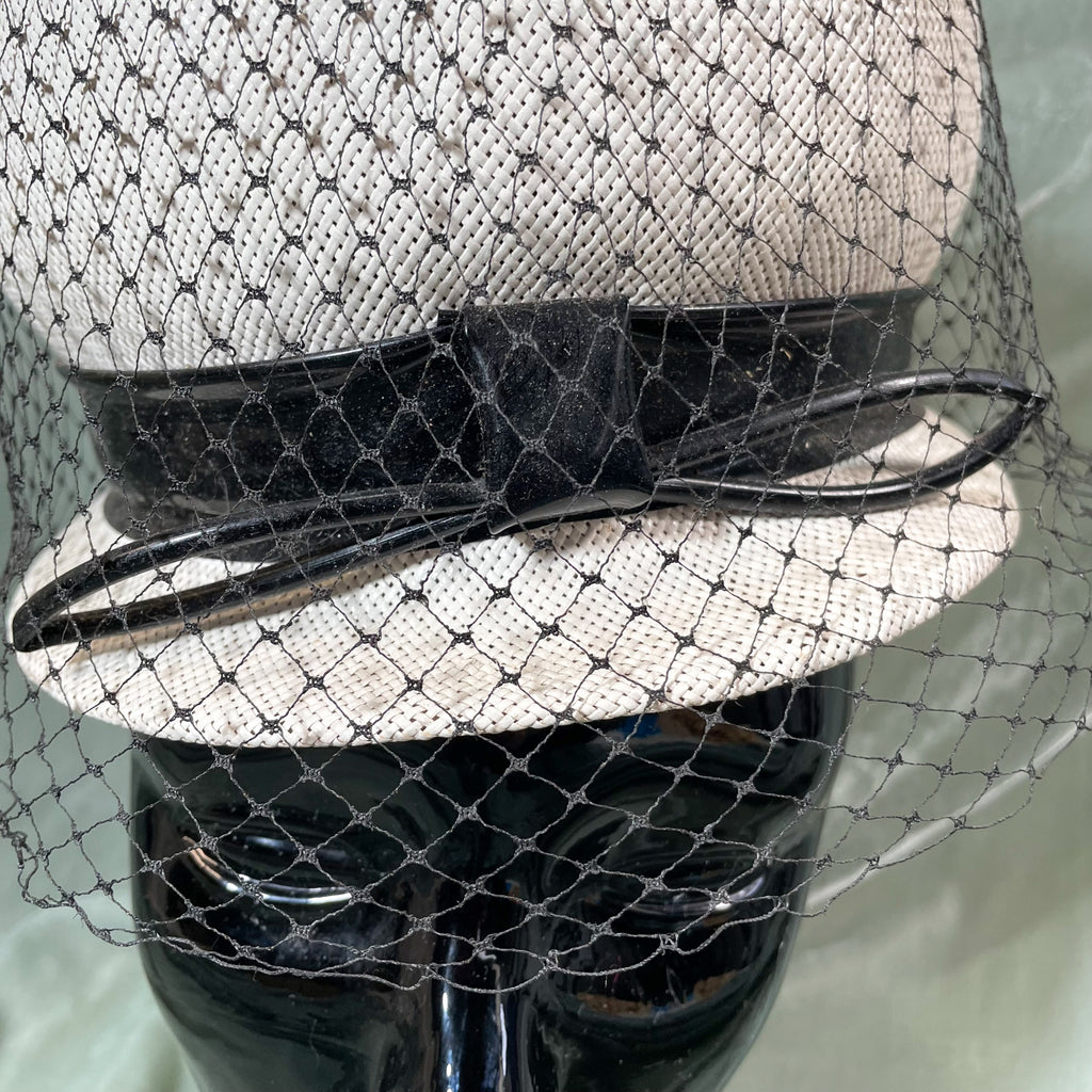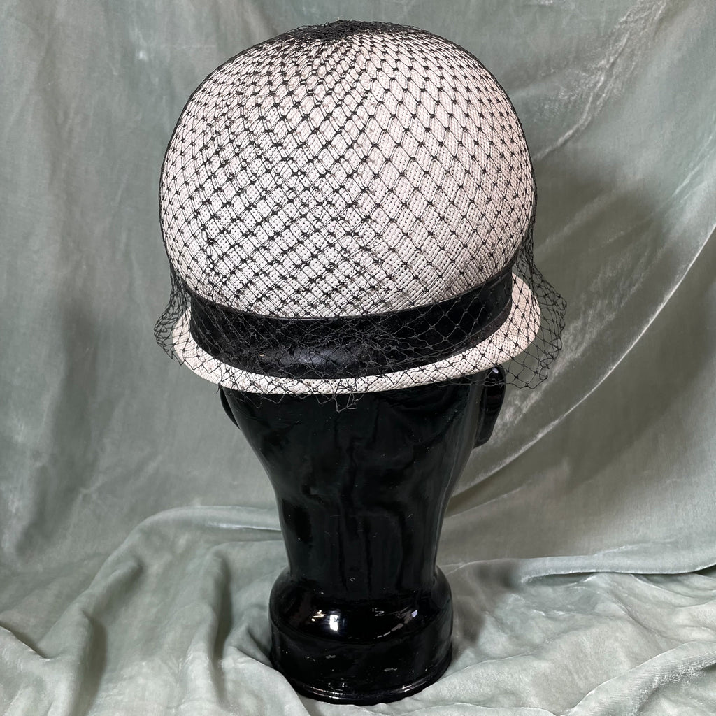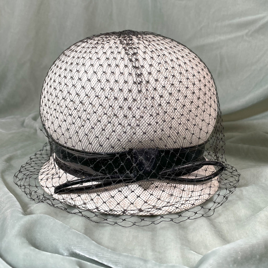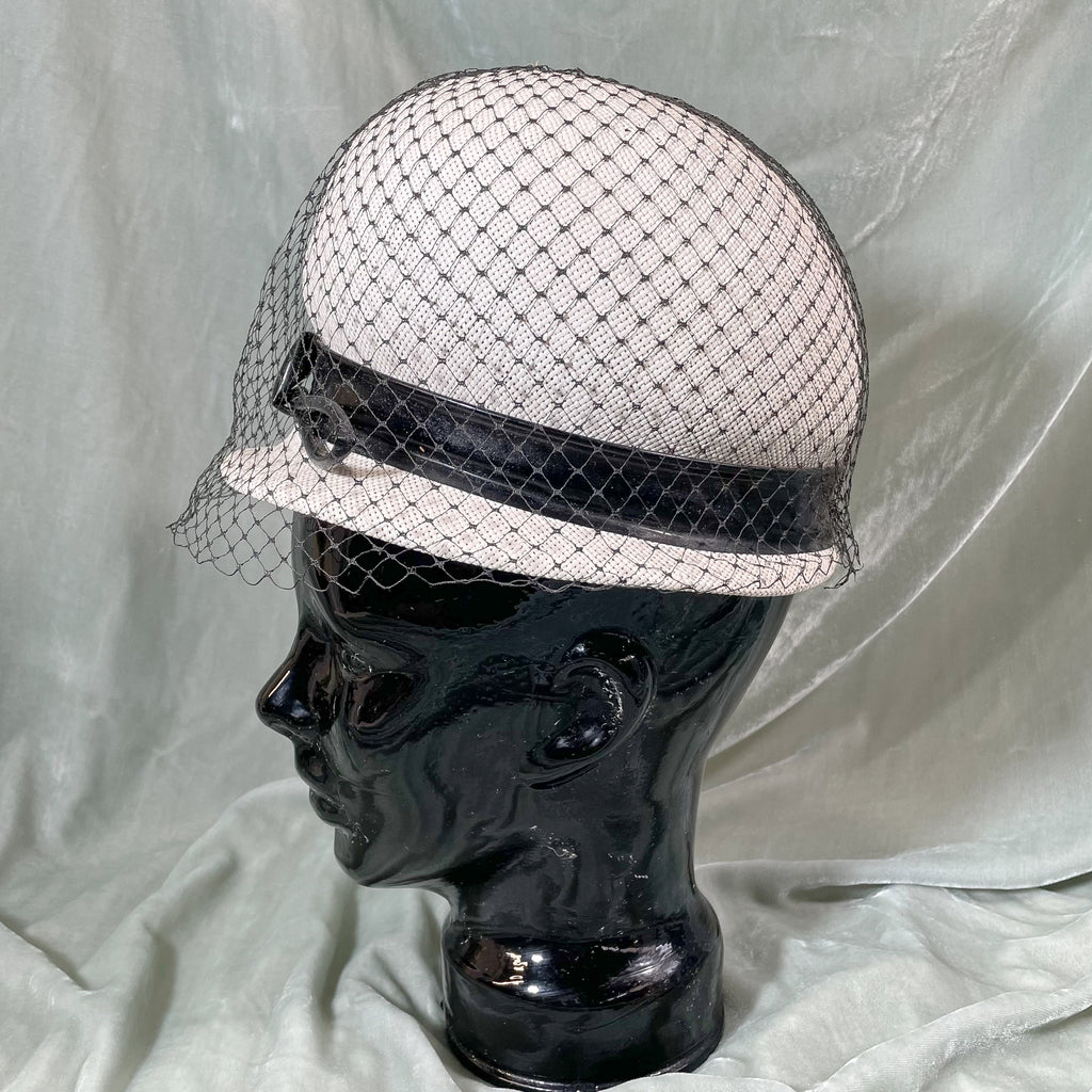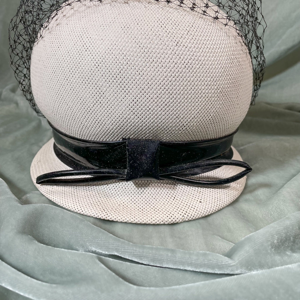 Vintage 60s MOD structured straw helmet hat with black net and vinyl banding & bow.