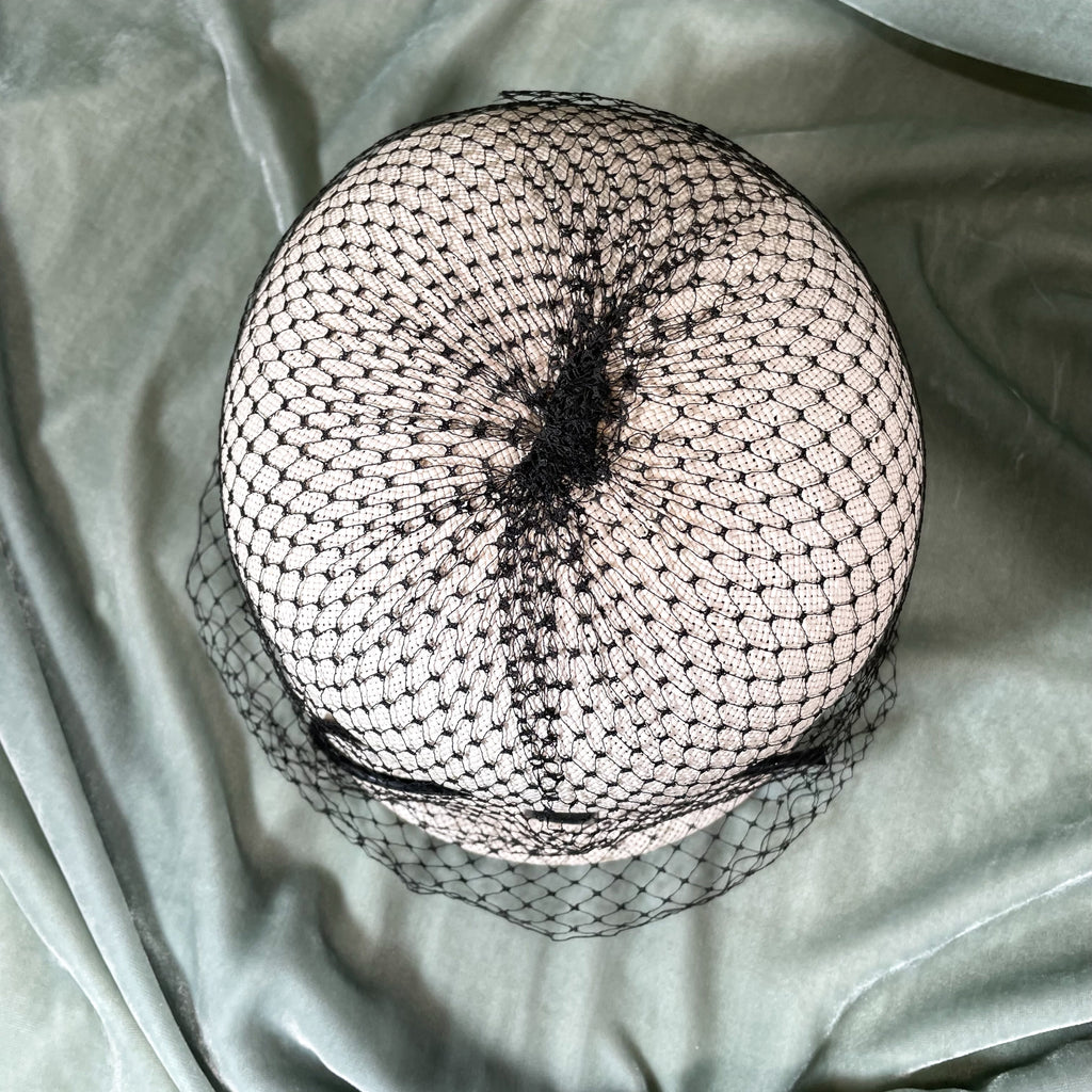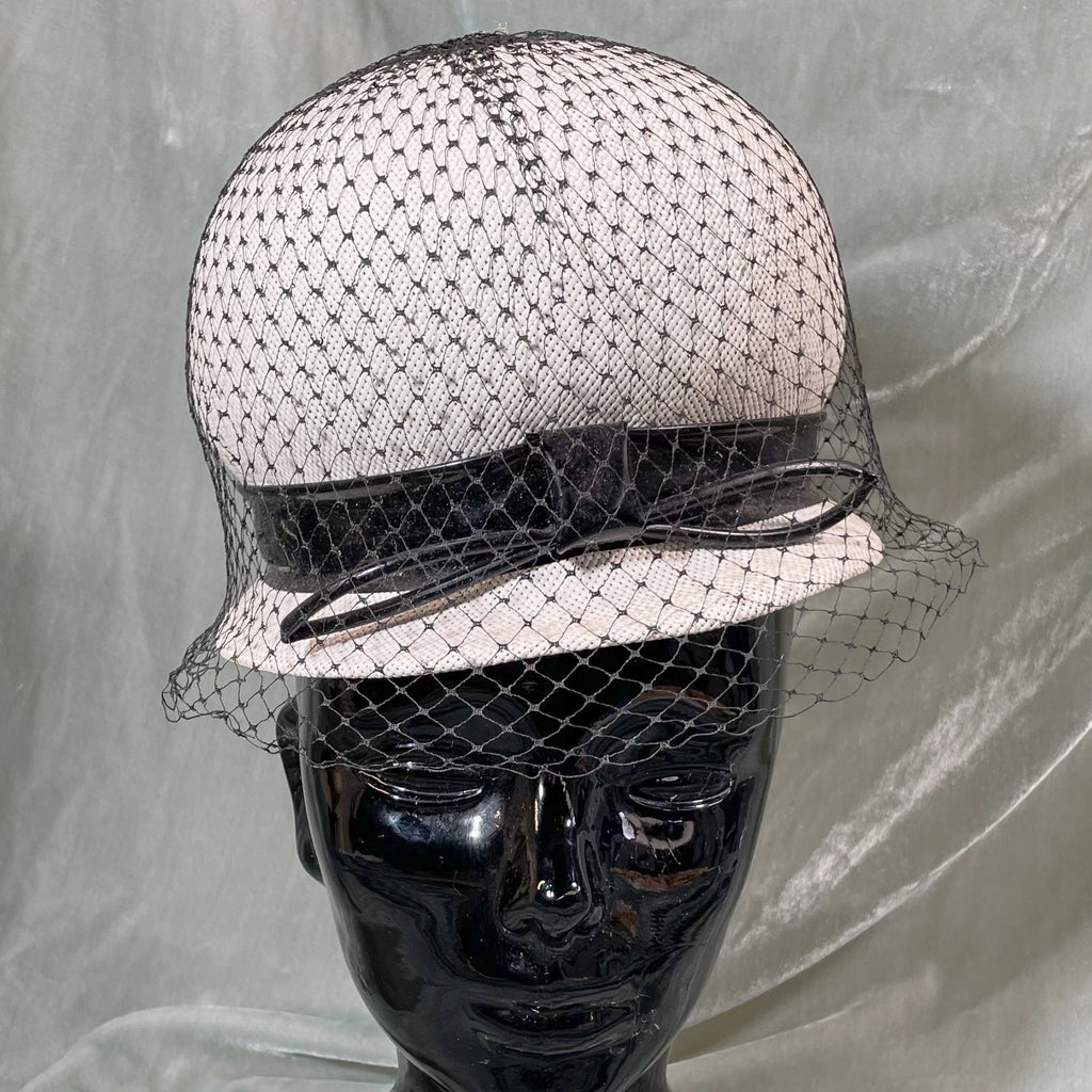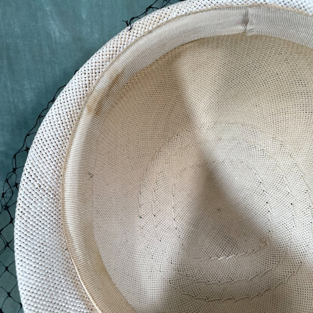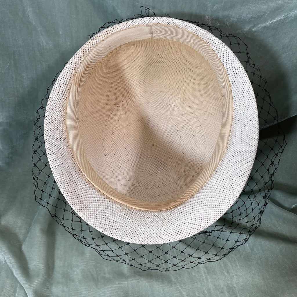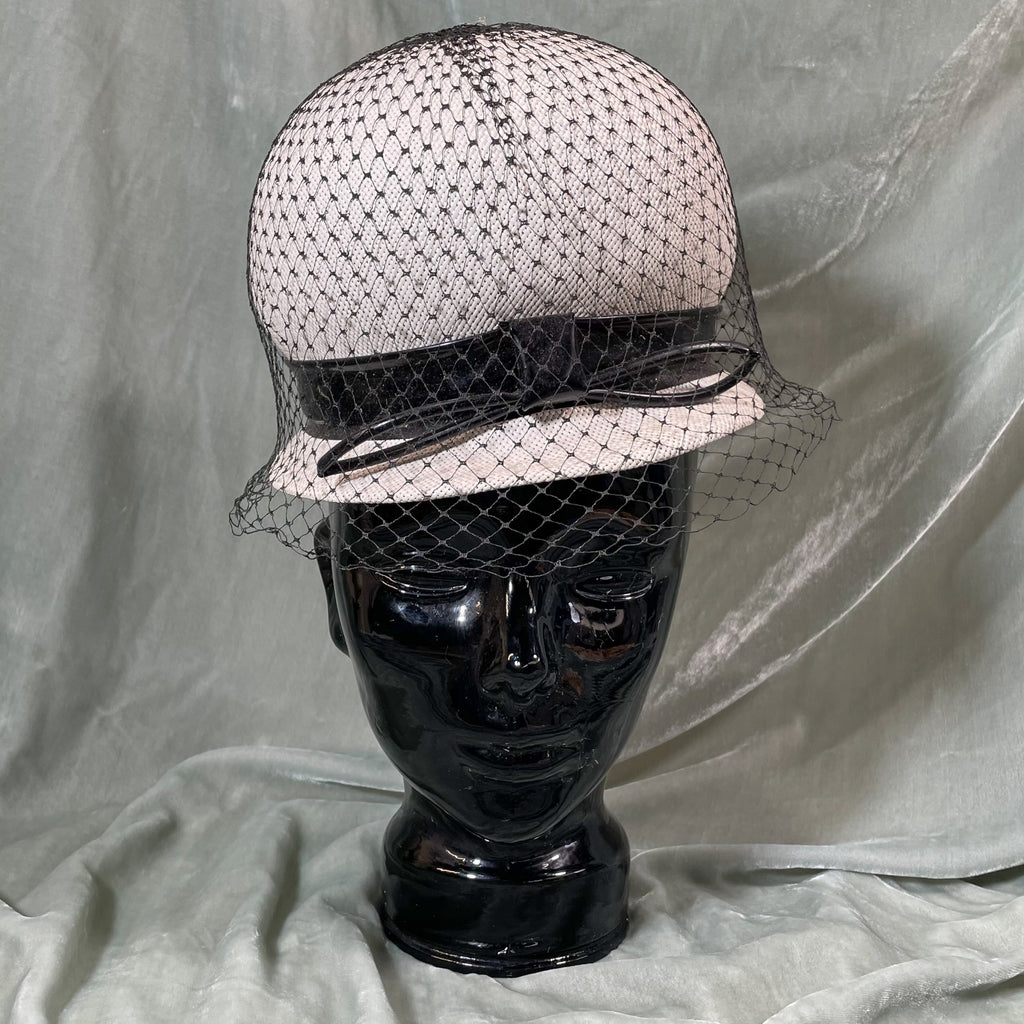 Vintage 60s MOD structured straw helmet hat with black net and vinyl banding & bow.
