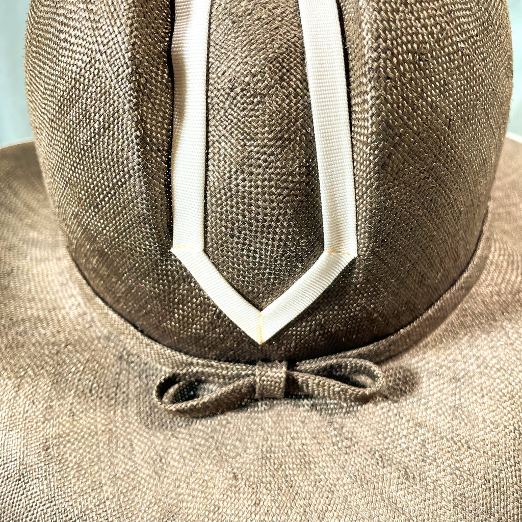 Vintage straw hat with ribbon banding on the brim and center.