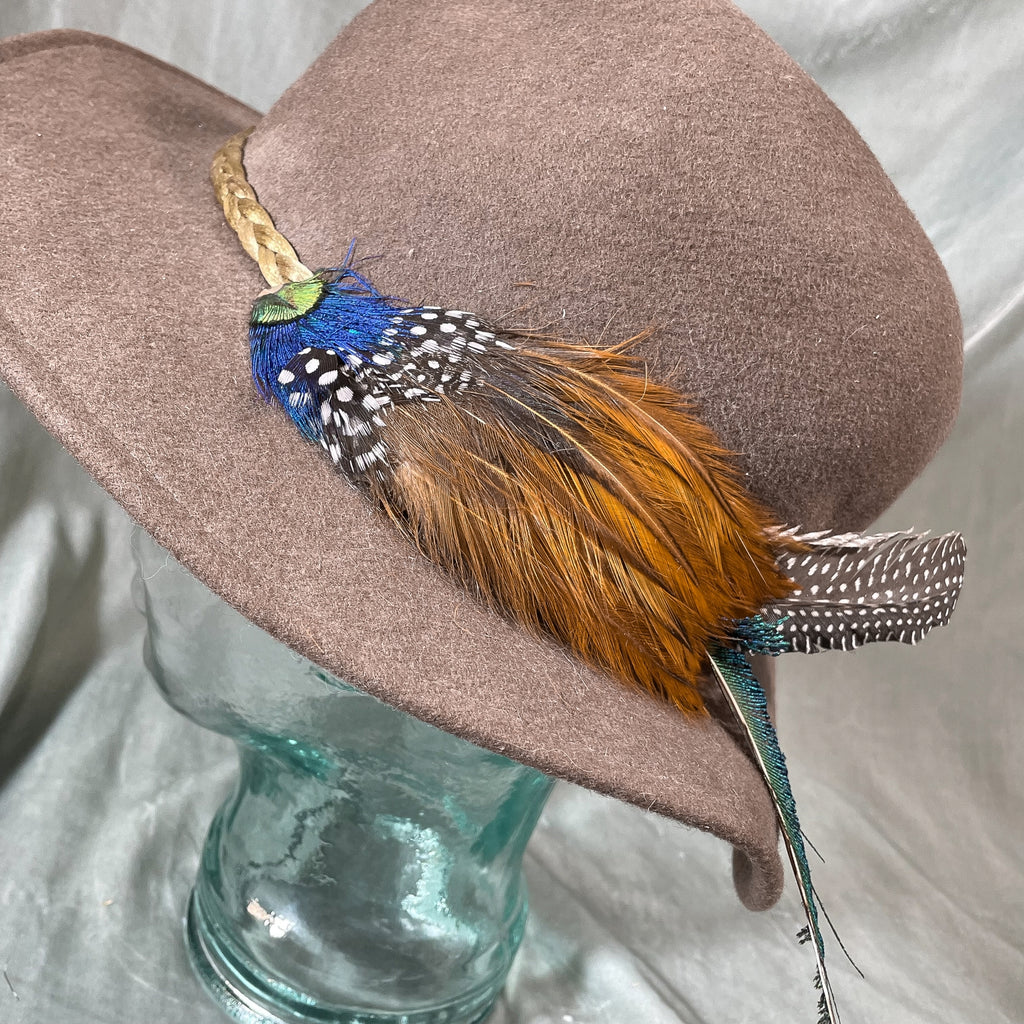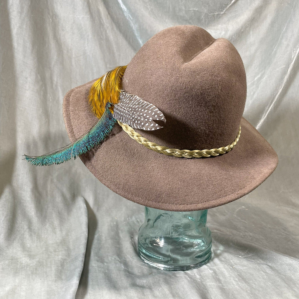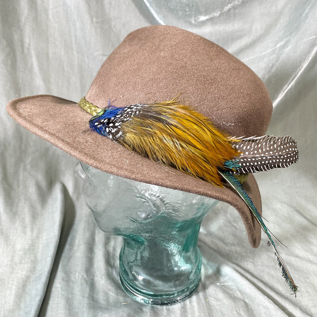 Taupe colored wool, multicolored feathers, braided gold tone band.