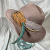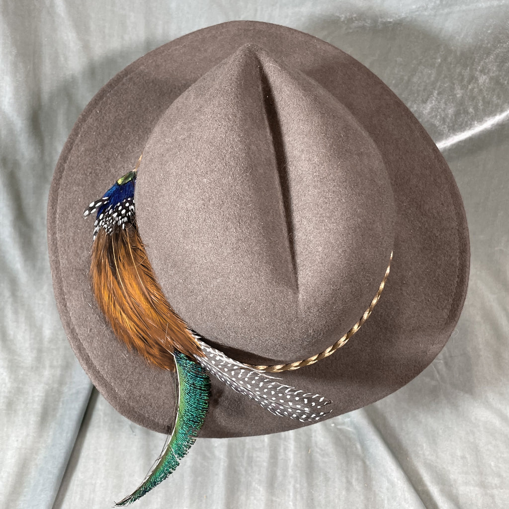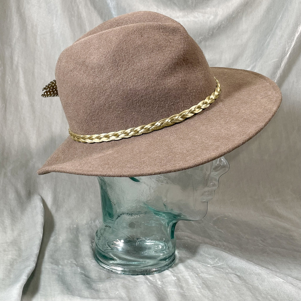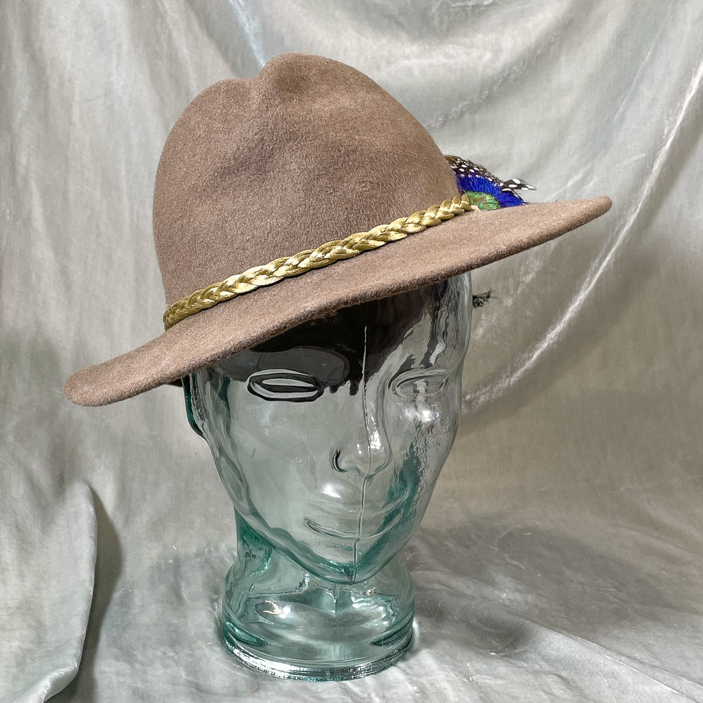 Taupe colored wool, multicolored feathers, braided gold tone band.