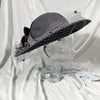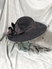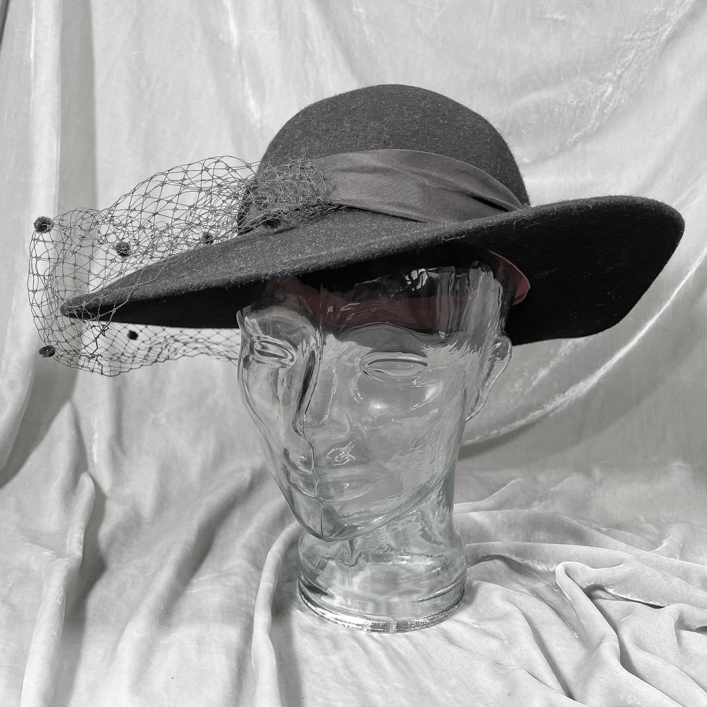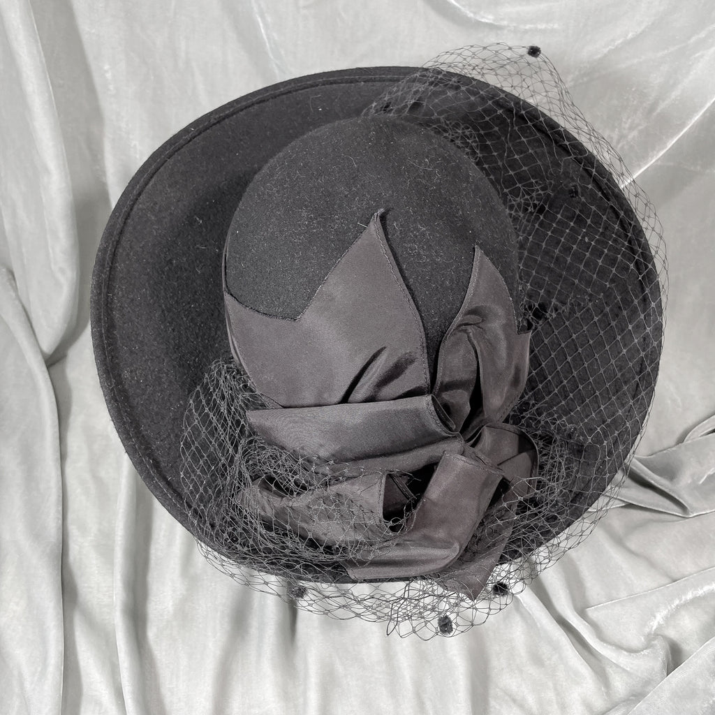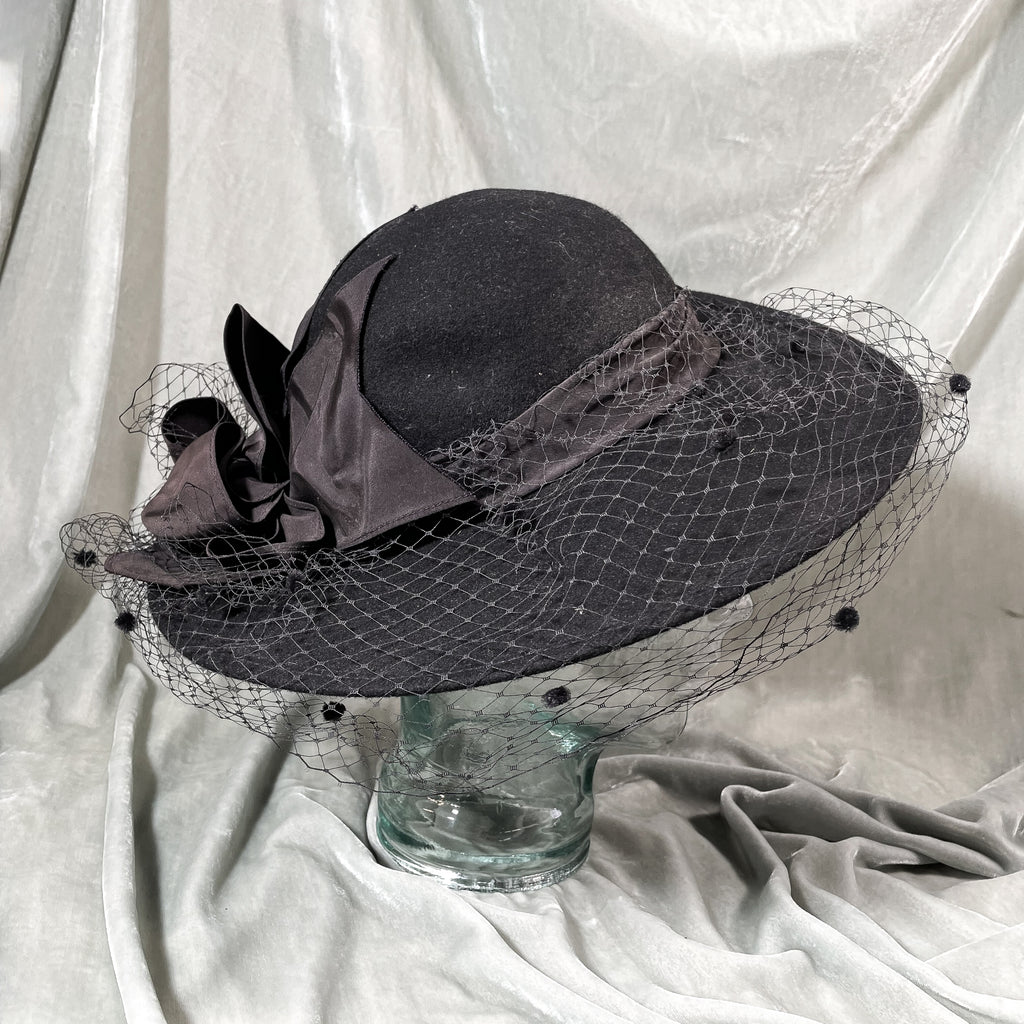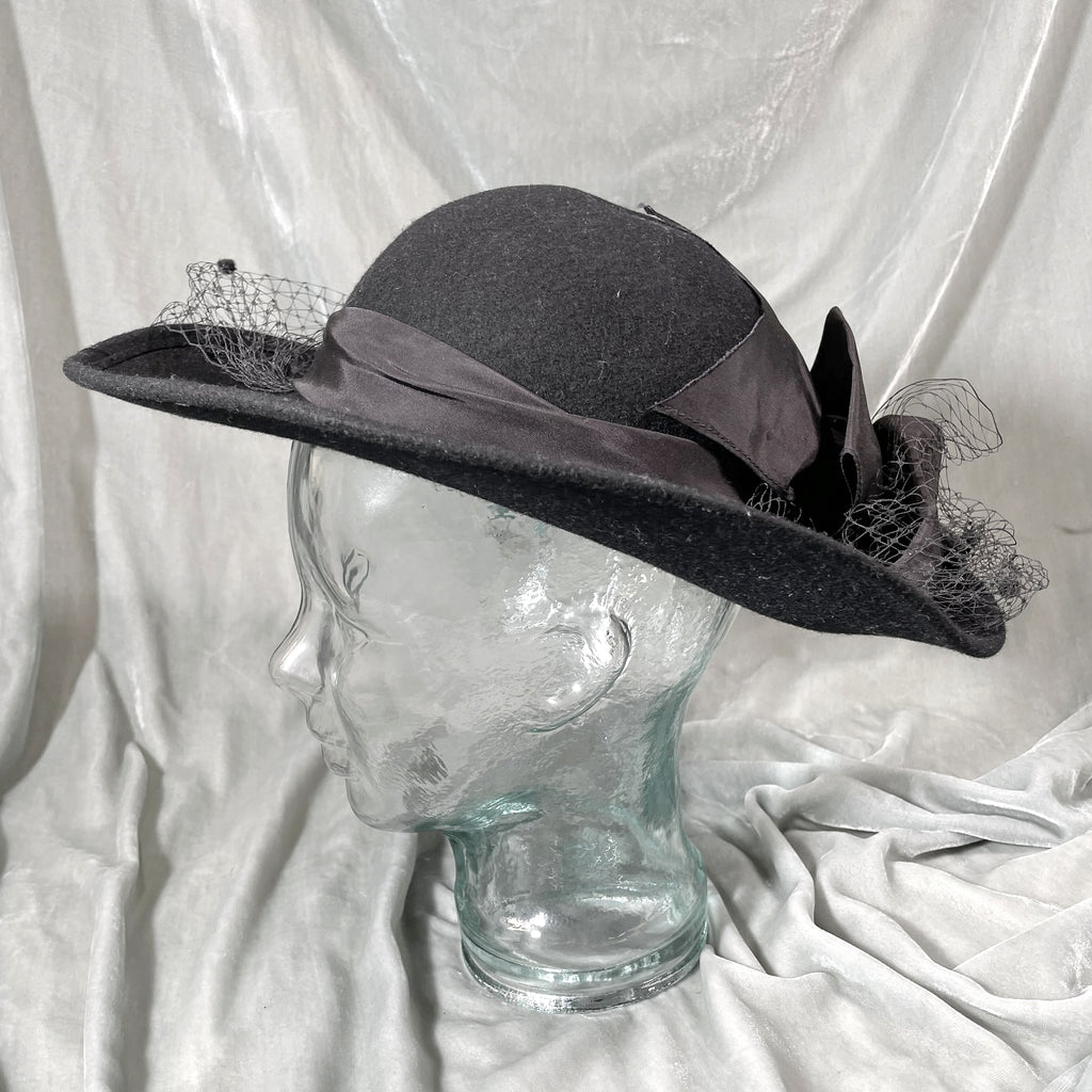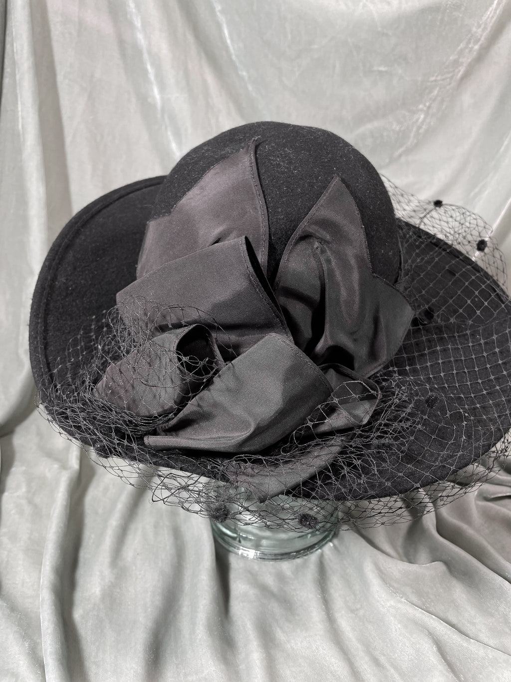 Nice black wool brim hat with net accents on one side and lovey black ribbon band and large bow.
