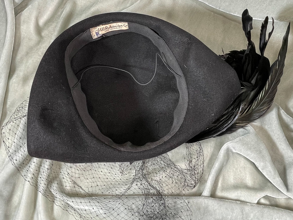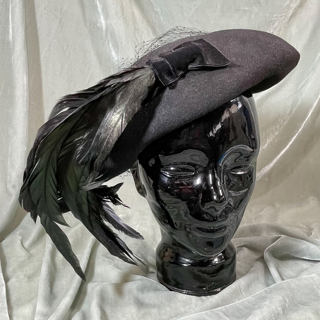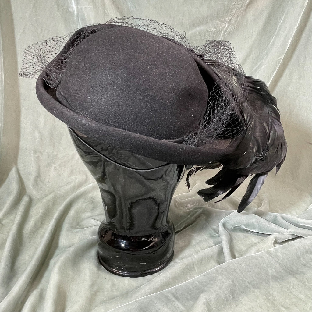 Vintage 40s black wool oblong hat with outstanding long feathers and net.