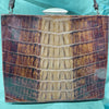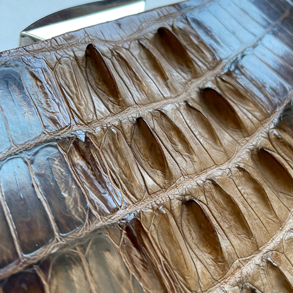 Dimensional alligator skin bag 'horned' hide from the alligator back, flat on the backside of the bag, likely belly hide.