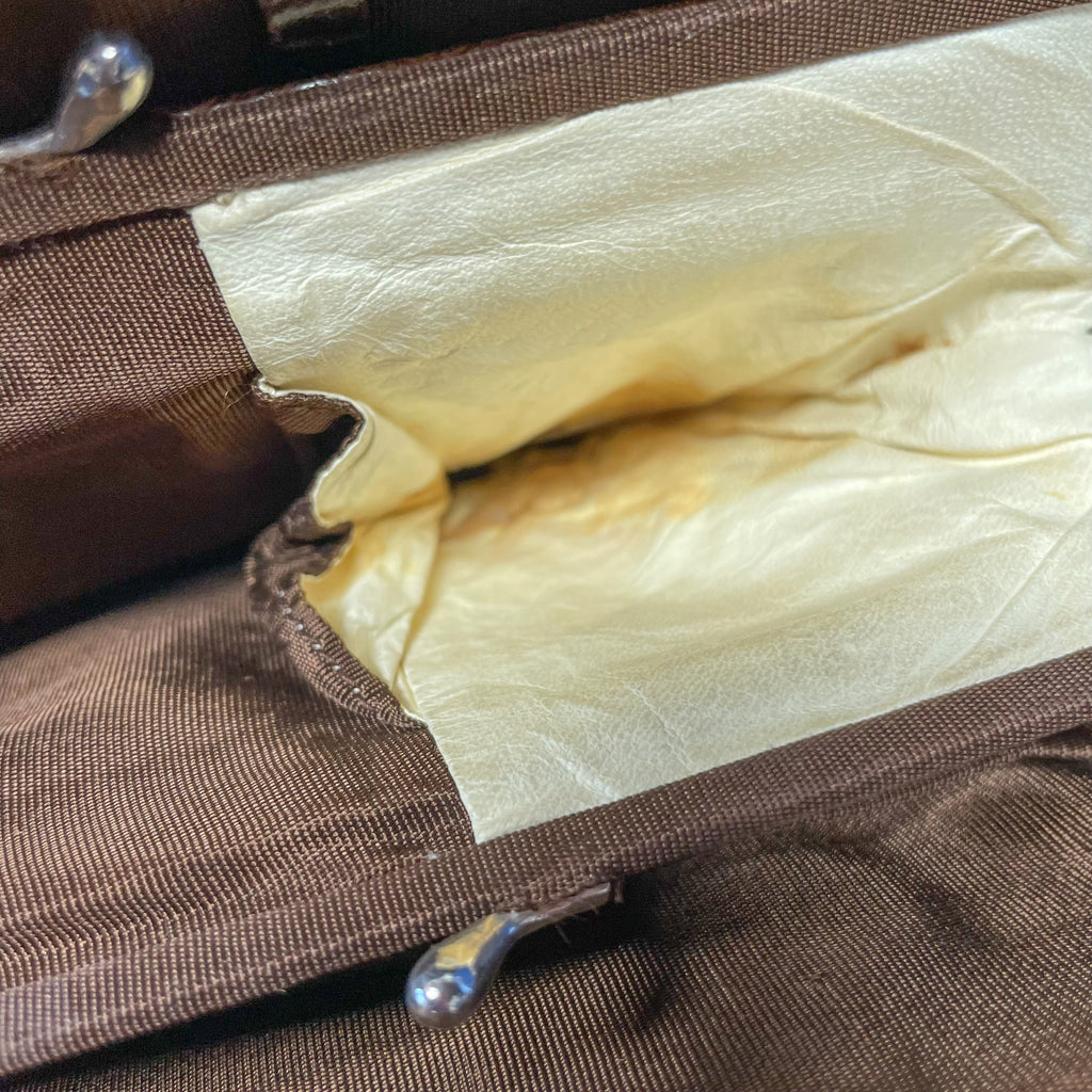 Silver tone hardware. Top clasp closure.