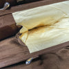 Fabric lined, 2 compartments, flat pockets & coin purse, matching mirror.