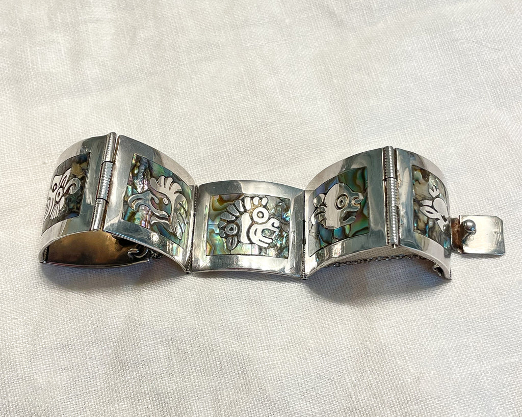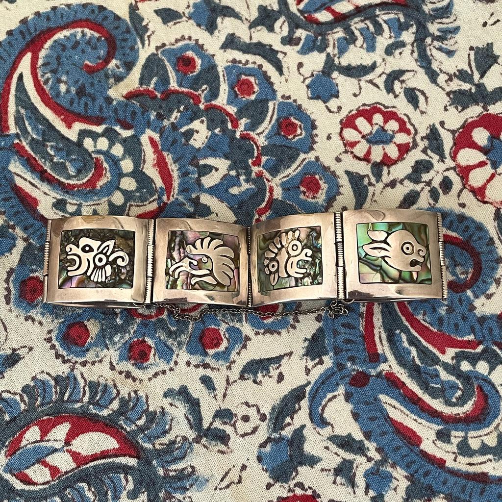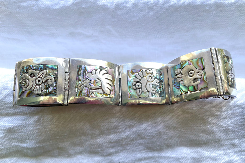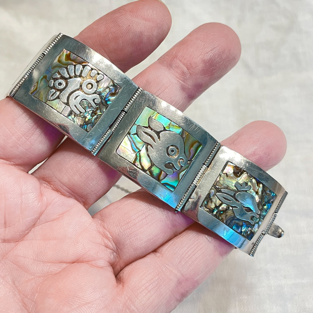 Vintage Gerardo Lopez Taxco Abalone/Sterling Silver Bracelet, Mesoamerican Aztec Animals