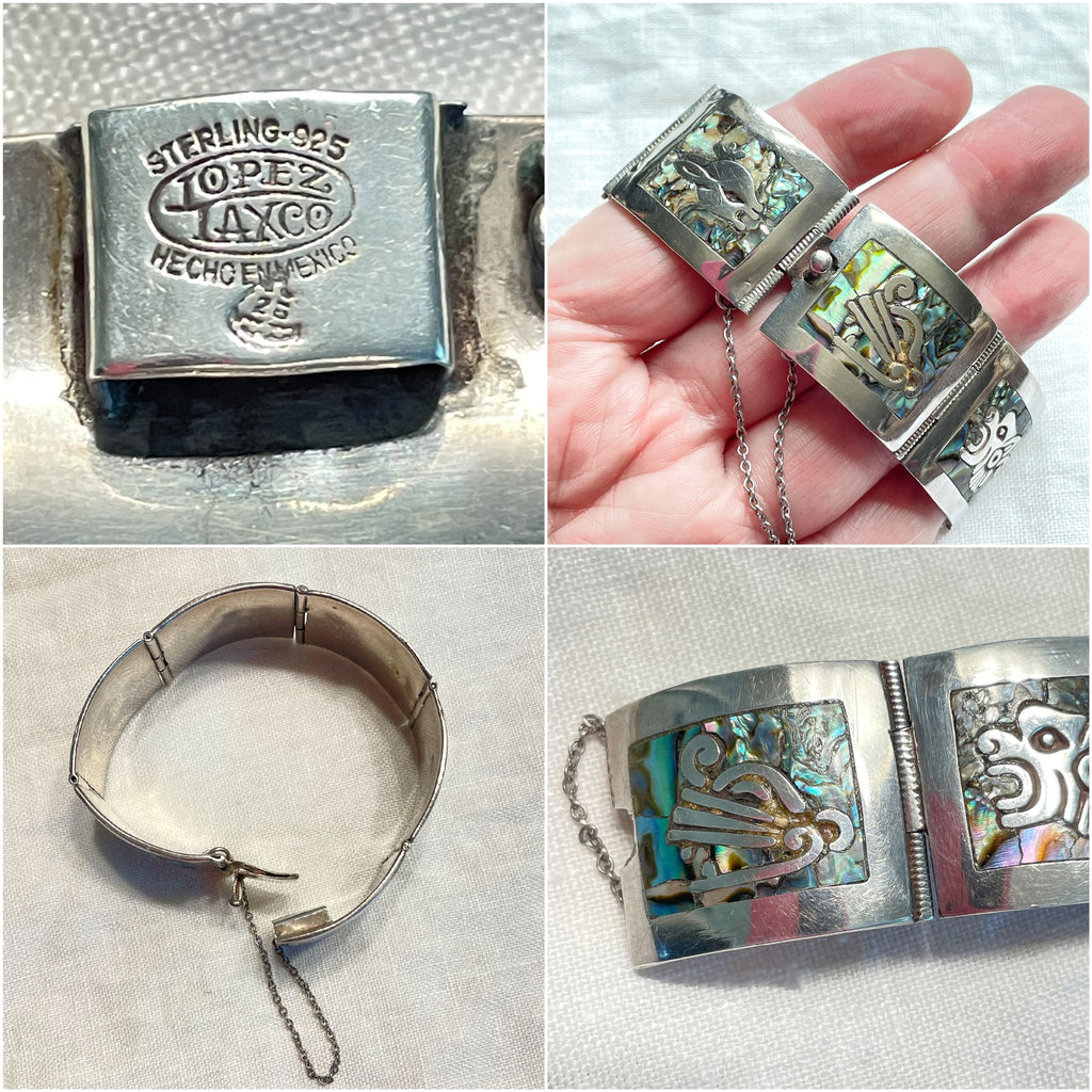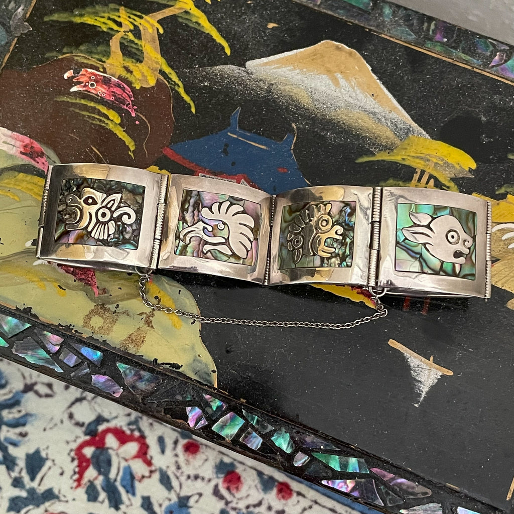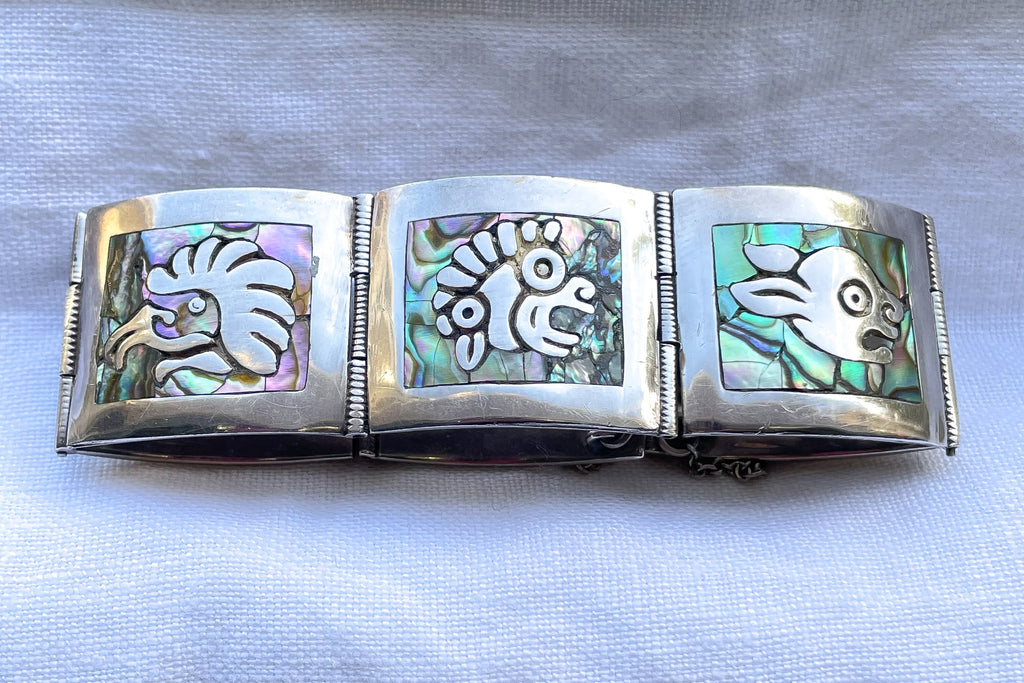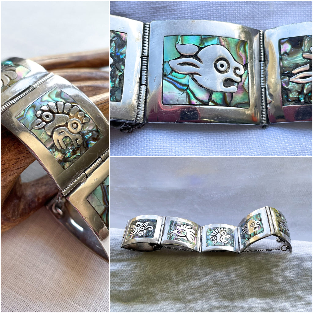 Vintage Gerardo Lopez Taxco Abalone/Sterling Silver Bracelet, Mesoamerican Aztec Animals