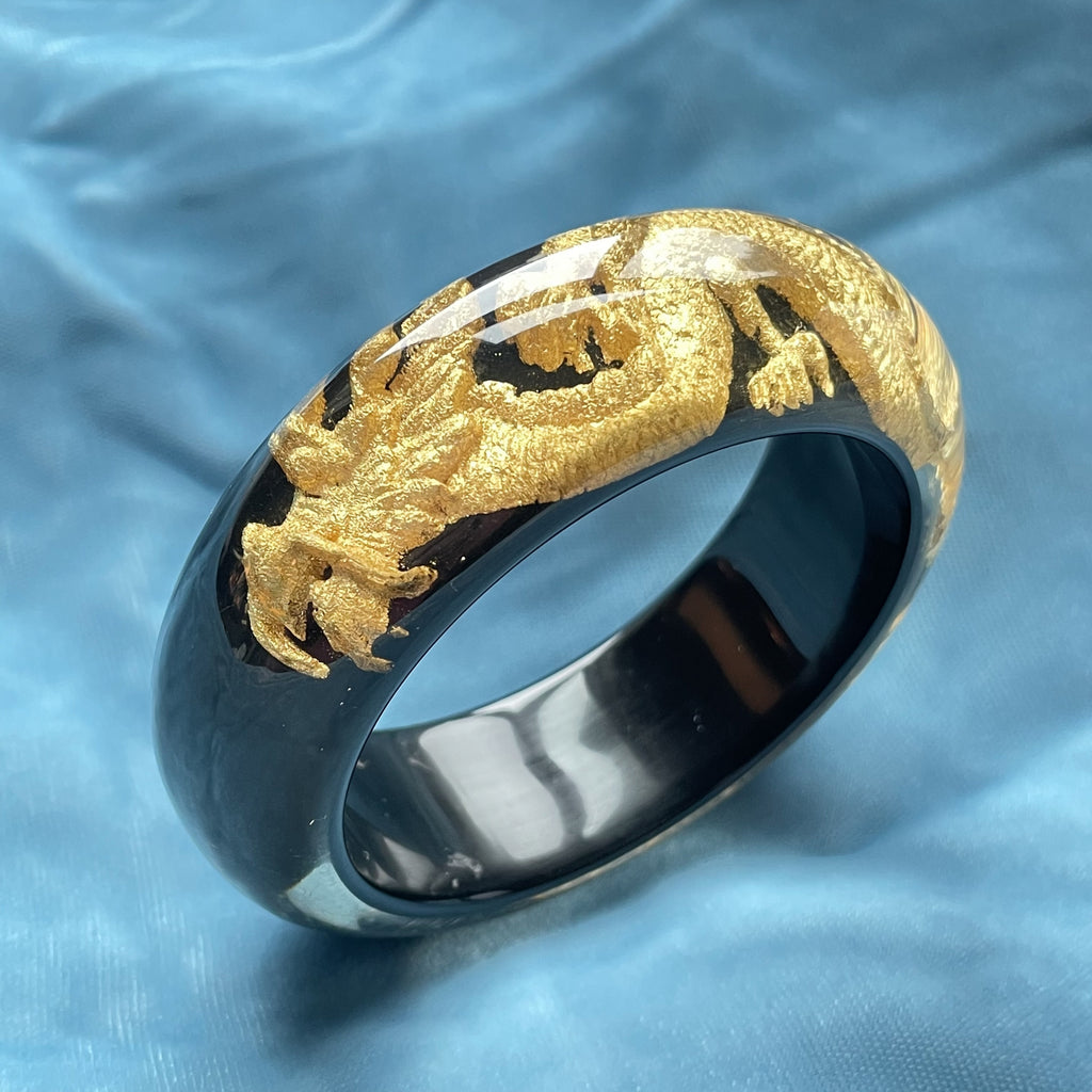 SOLD Vintage Lucite Dragon Bangle Bracelet, Black Gold Inclusion Bracelet